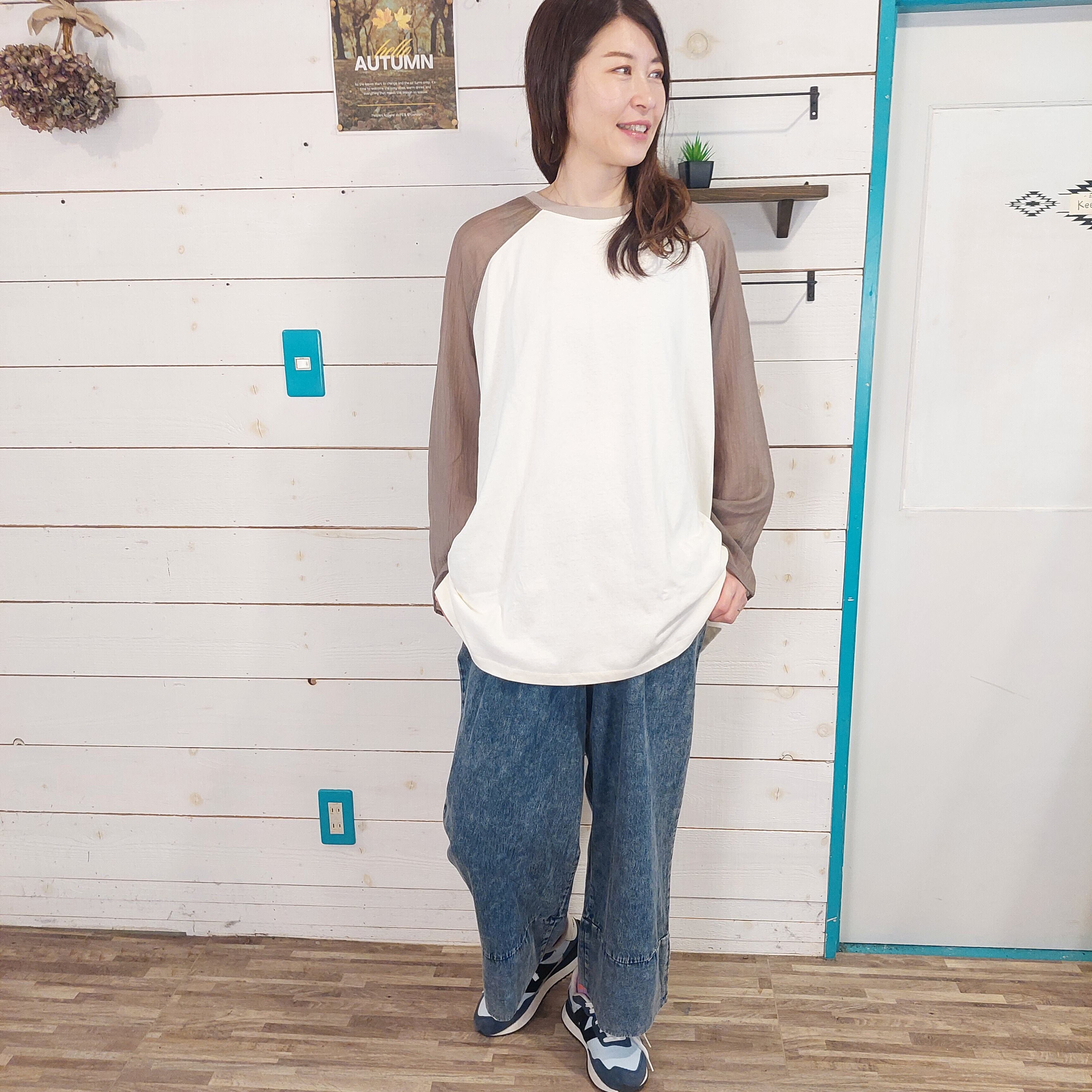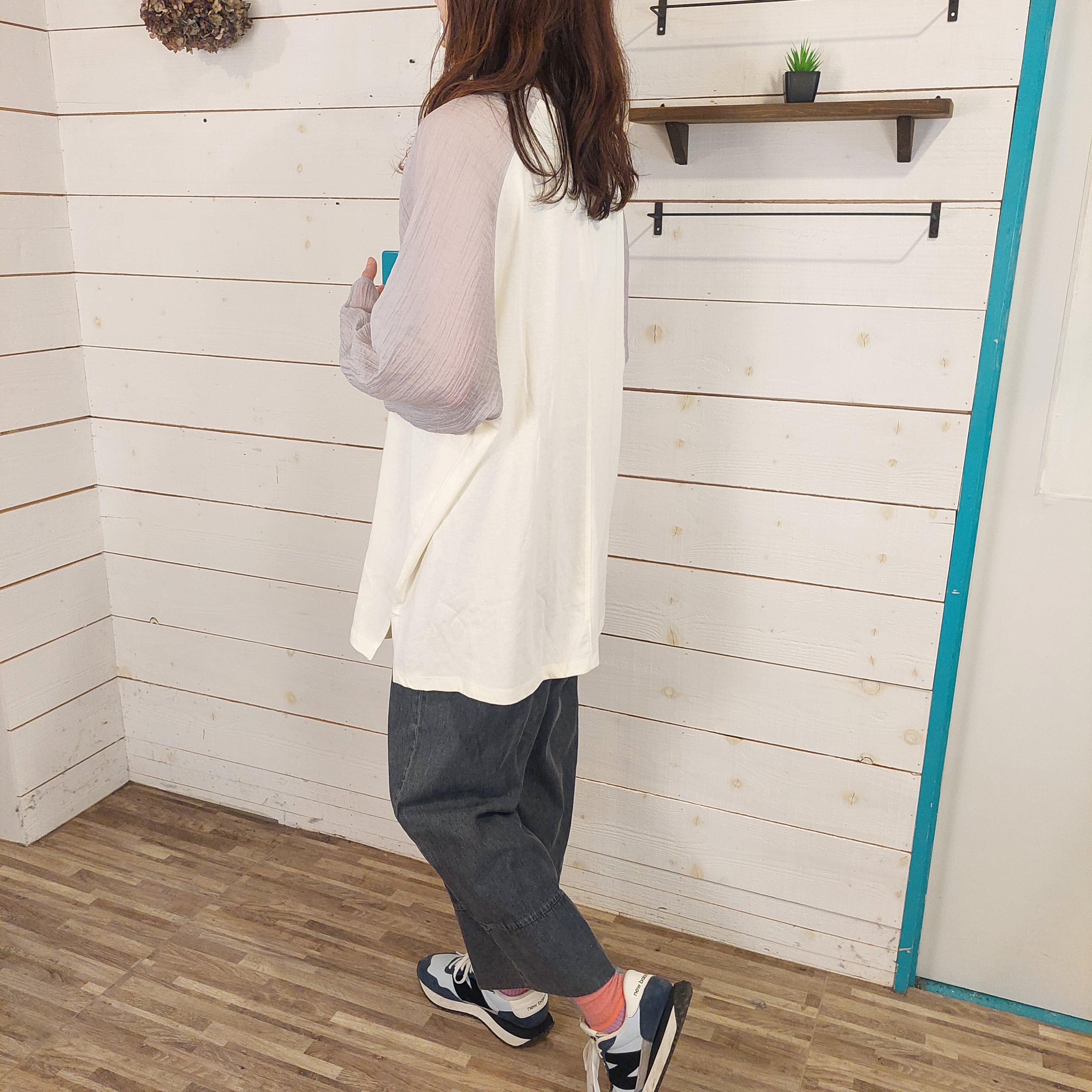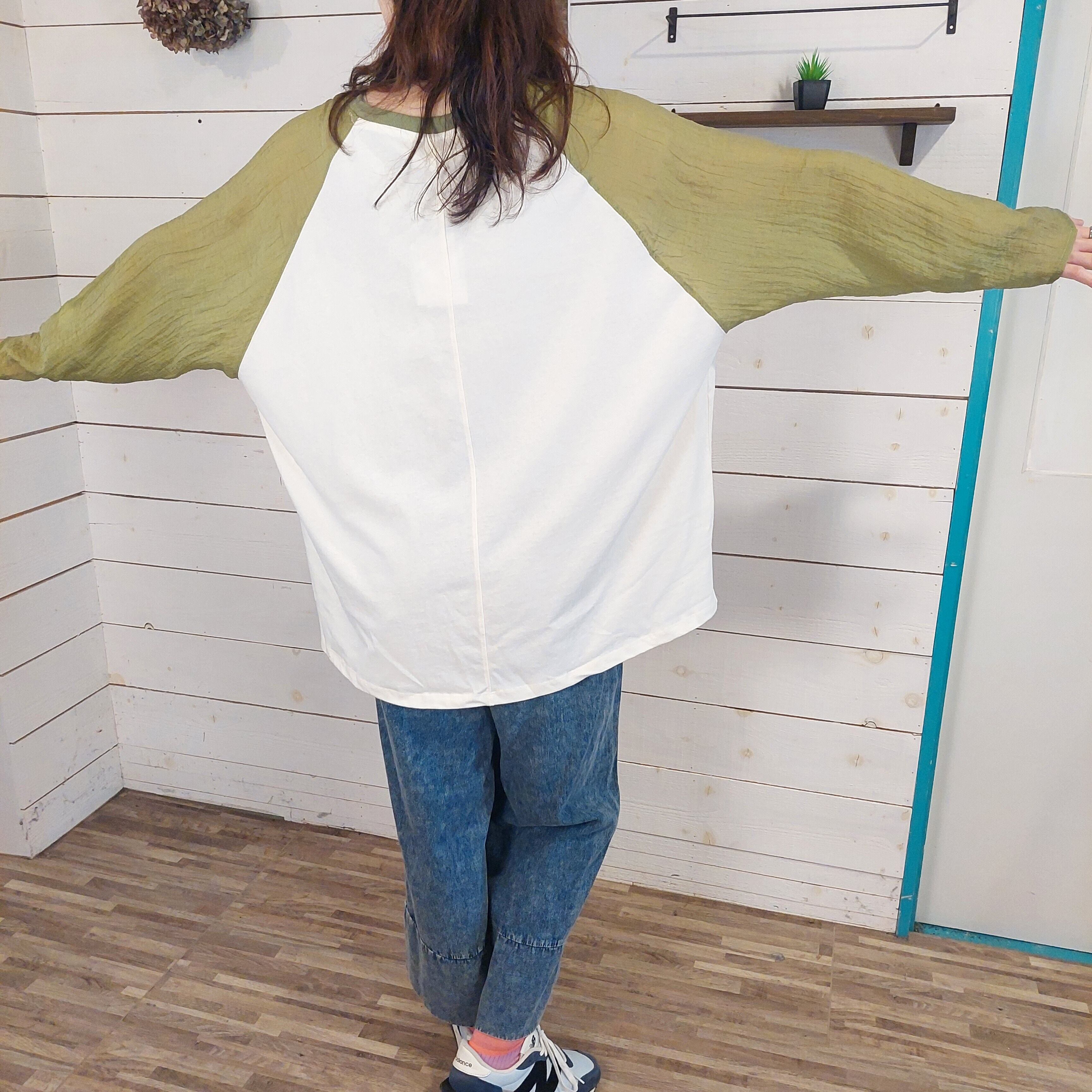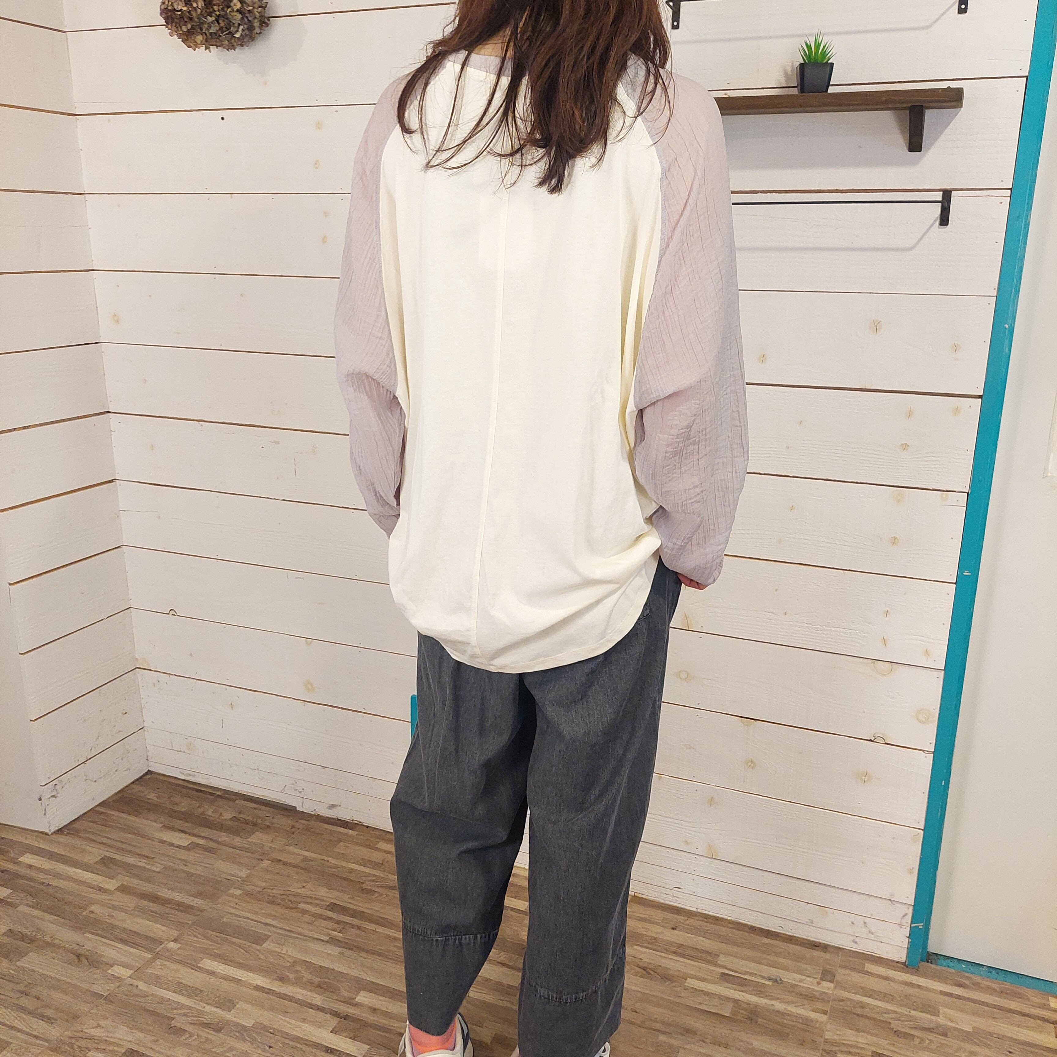 このラグランスリーブプルオーバーは、袖にシアー素材を使用しており、透け感が涼しげで軽やかな印象を与えます。ゆったりとしたシルエットながらもカジュアルの中に華やかさが漂い、どんなスタイルにも合わせやすい1枚です。普段使いからちょっとしたお出かけまで幅広いシーンで活躍するアイテムです。