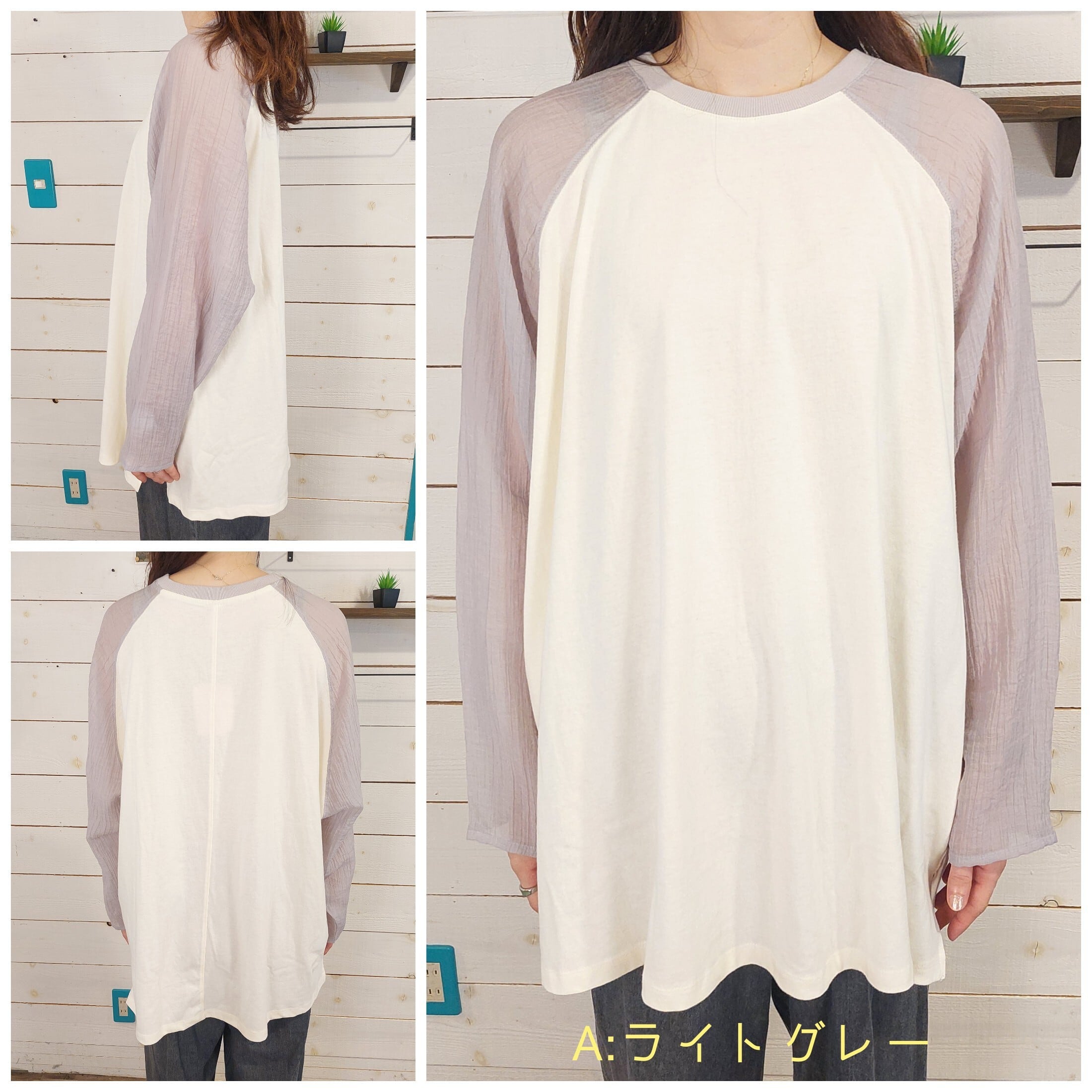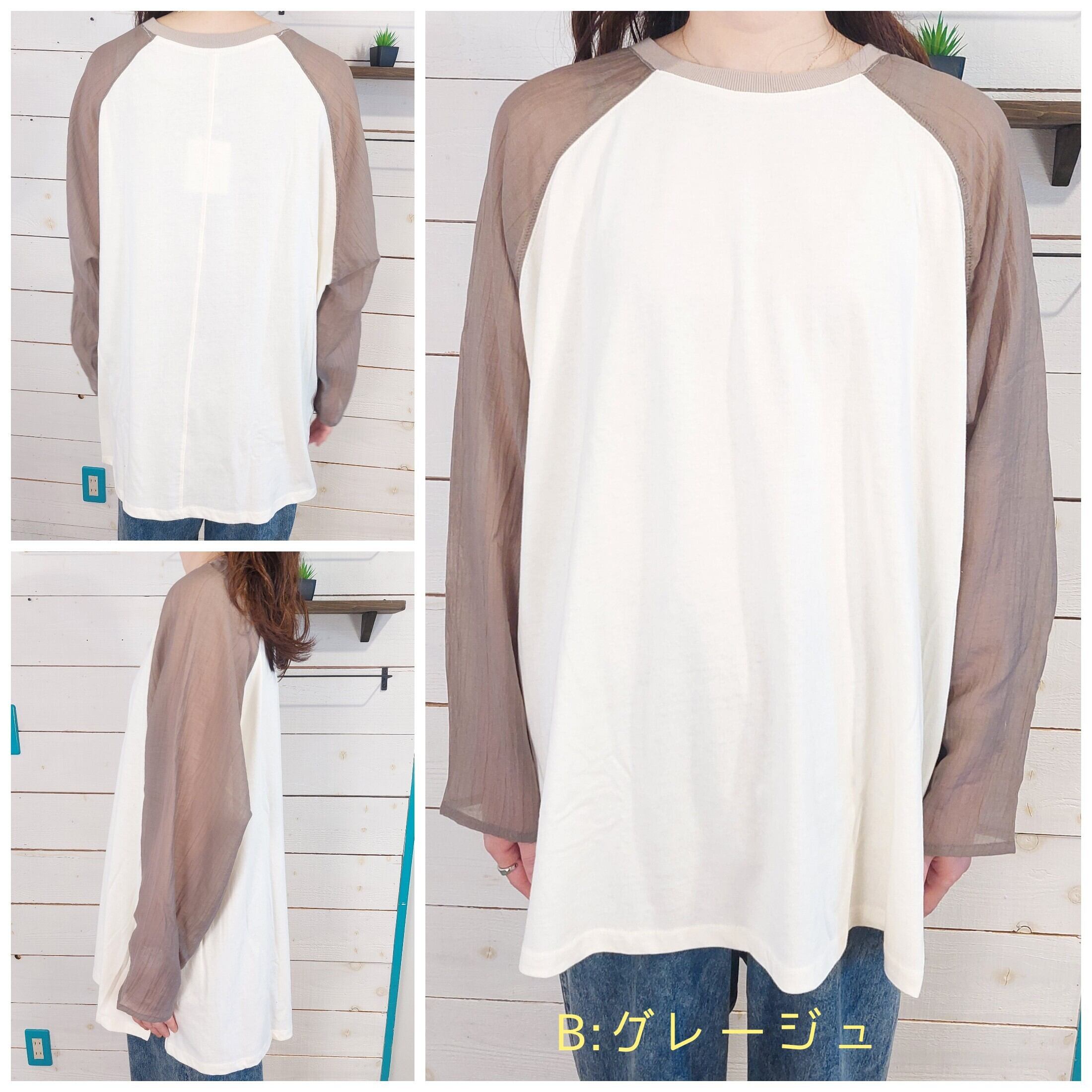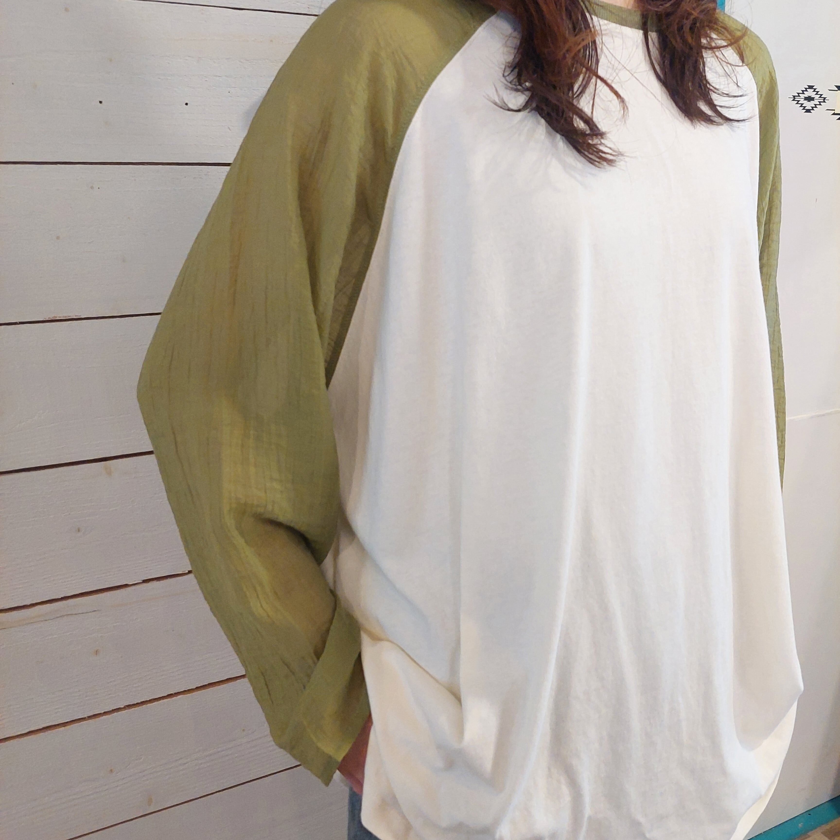 このラグランスリーブプルオーバーは、袖にシアー素材を使用しており、透け感が涼しげで軽やかな印象を与えます。ゆったりとしたシルエットながらもカジュアルの中に華やかさが漂い、どんなスタイルにも合わせやすい1枚です。普段使いからちょっとしたお出かけまで幅広いシーンで活躍するアイテムです。