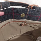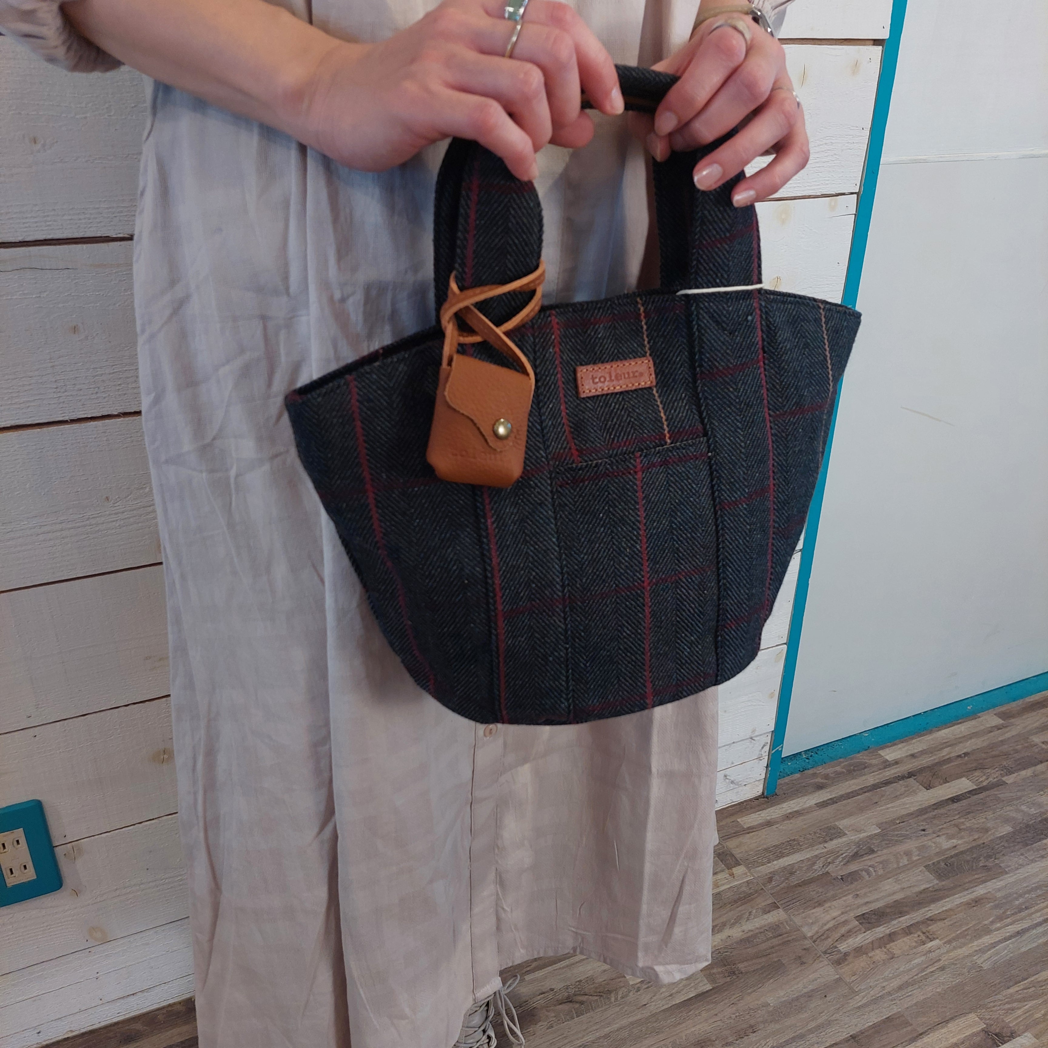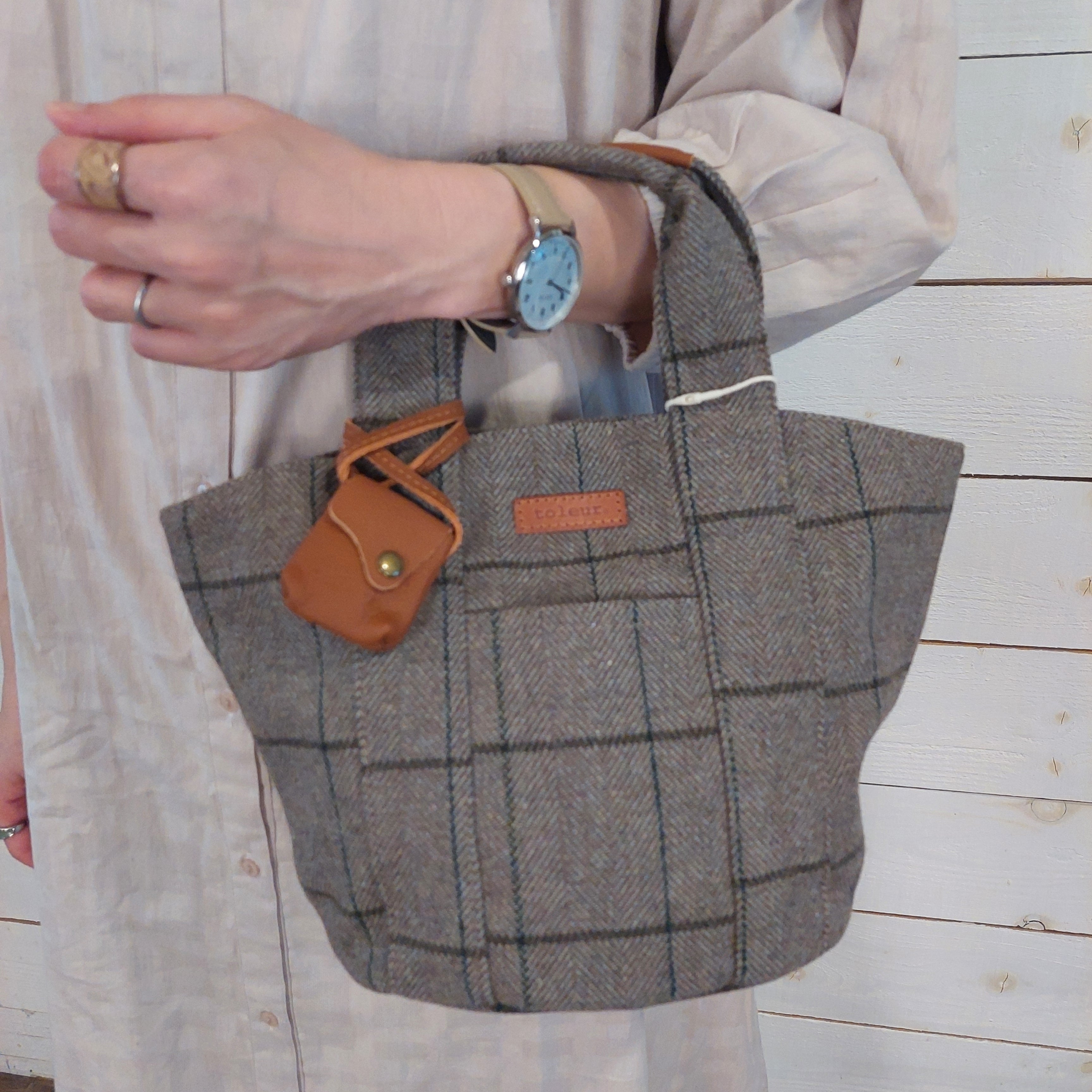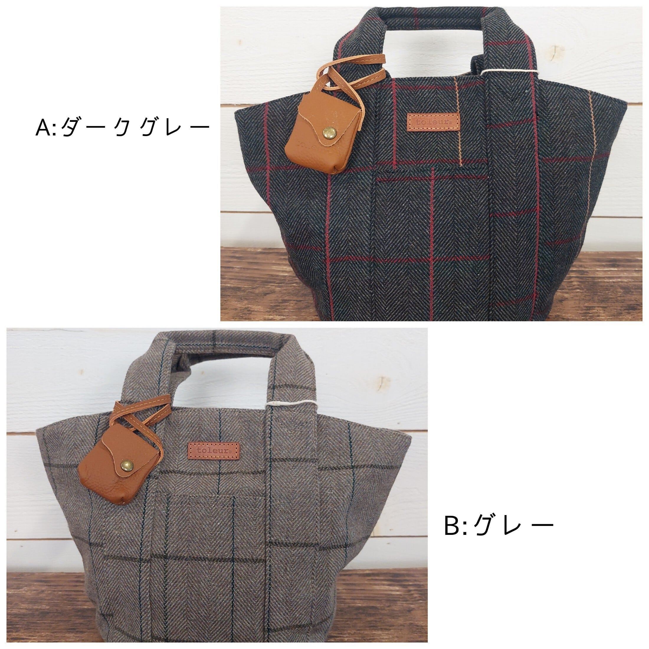 ポリエステルとウールの混紡素材を使用したチェック柄トートバッグ。
