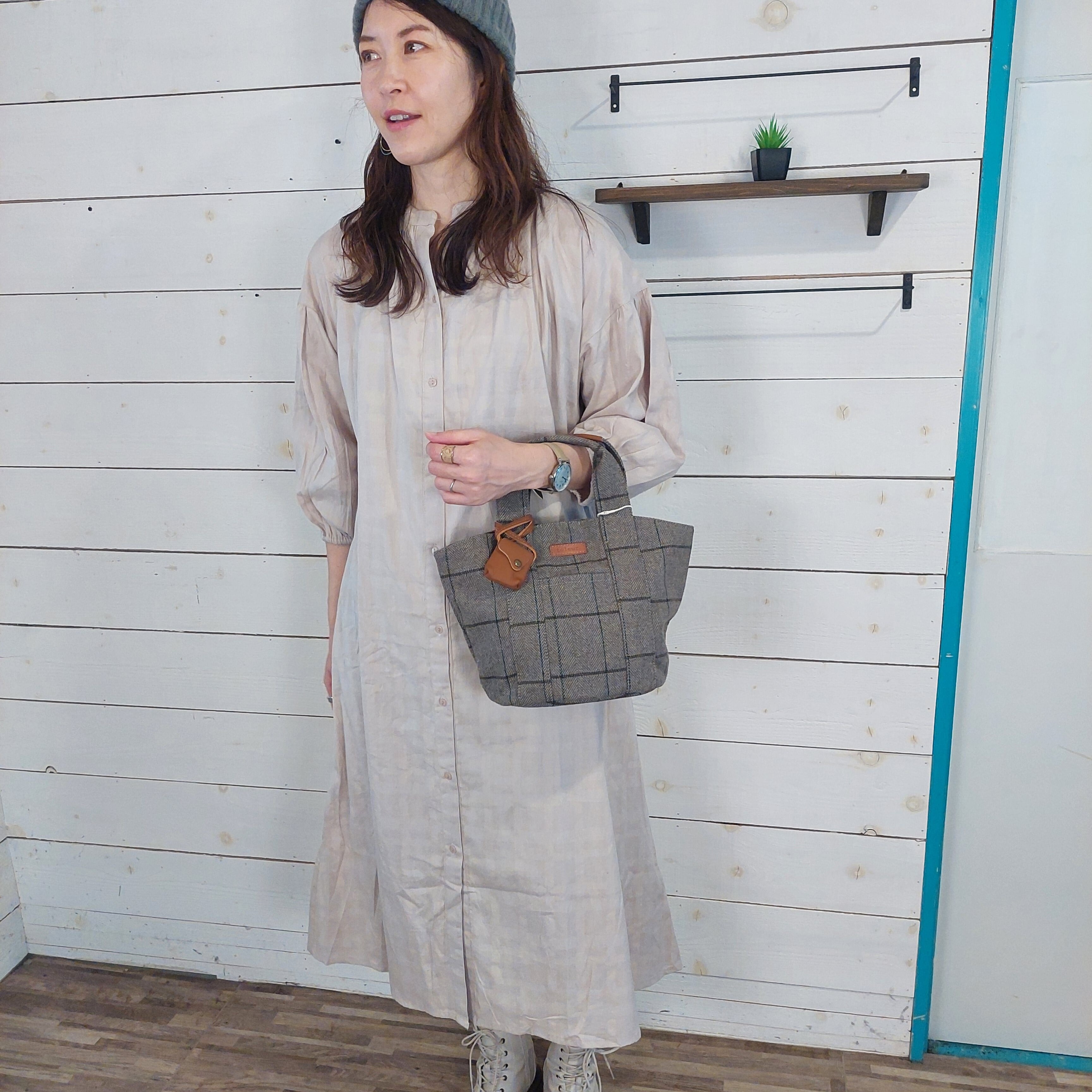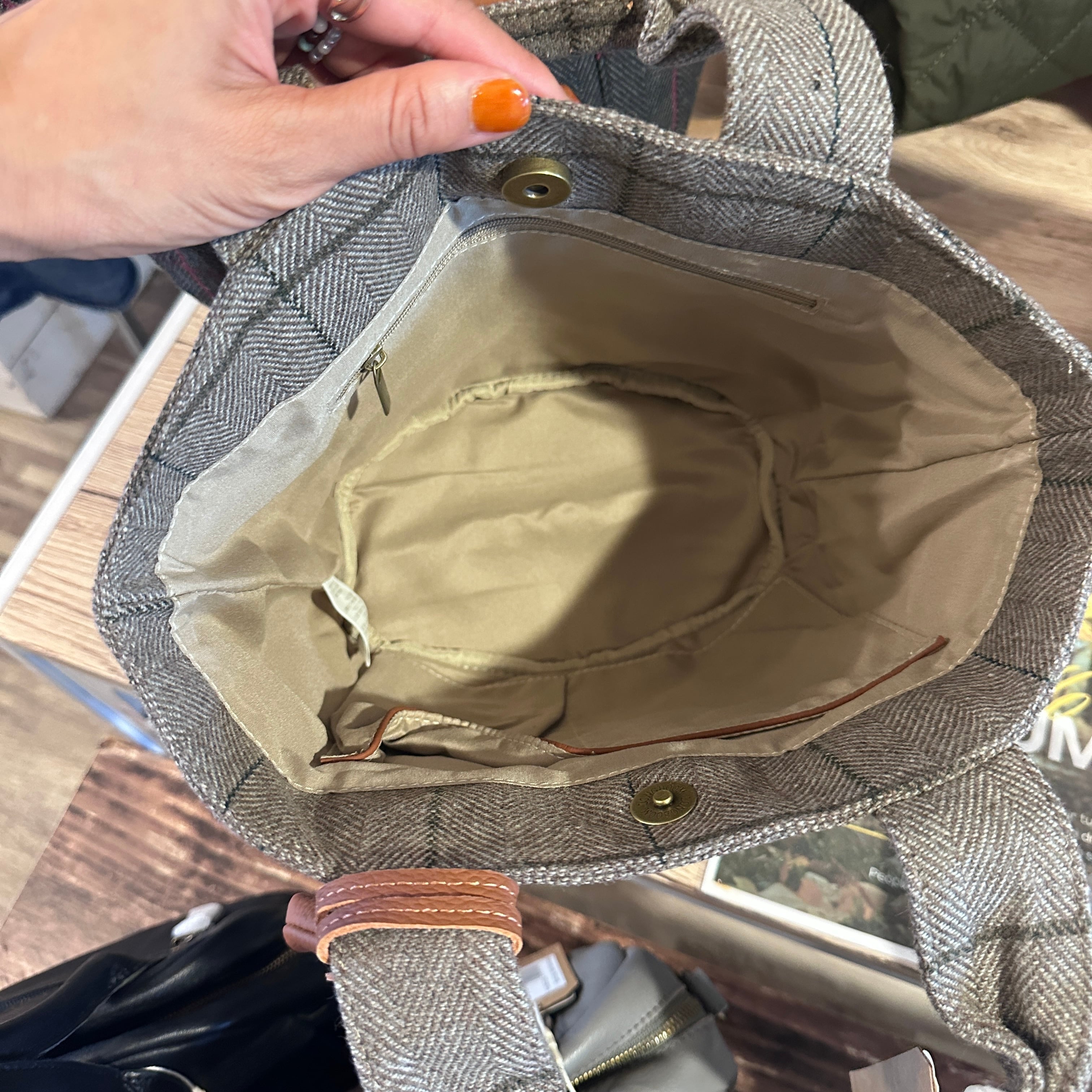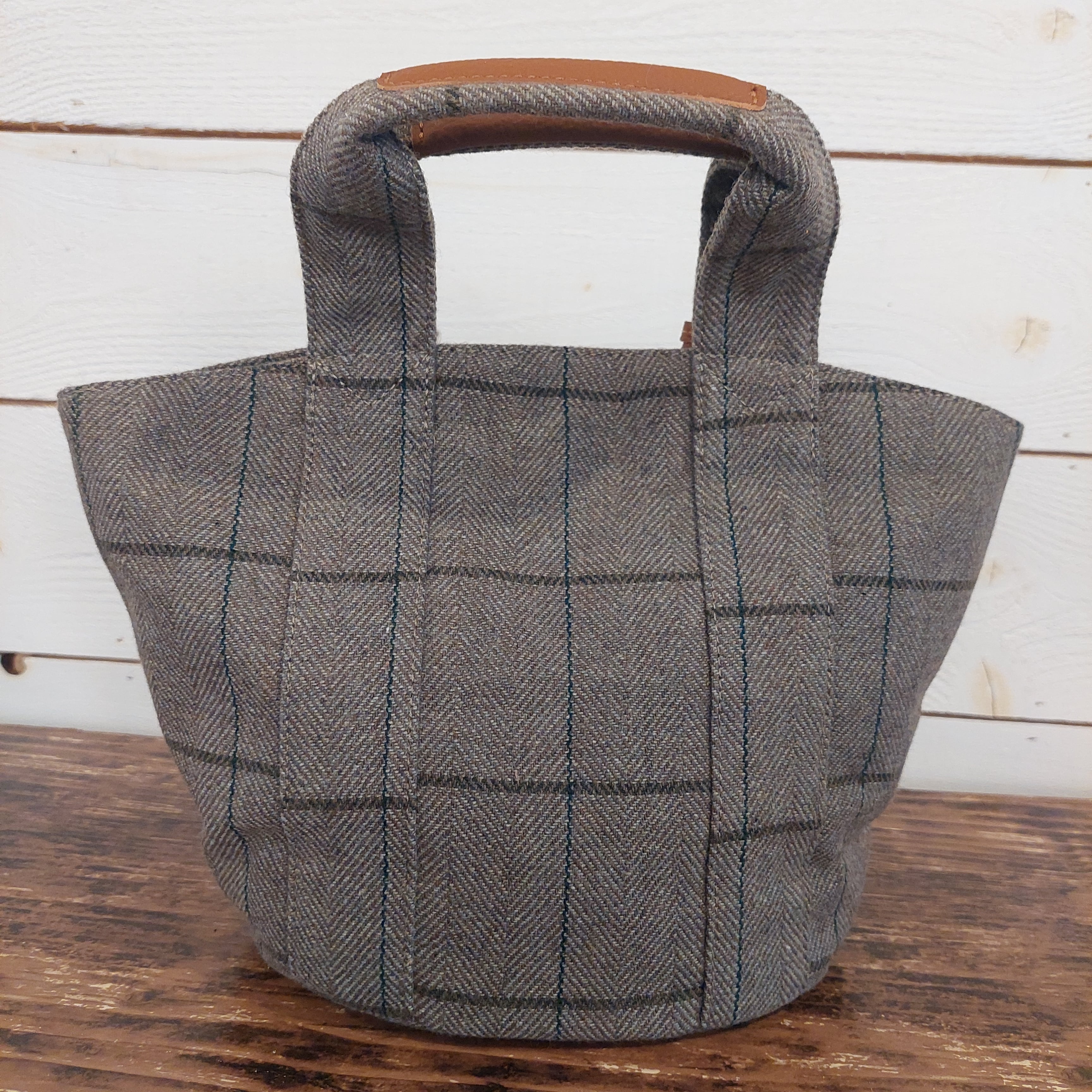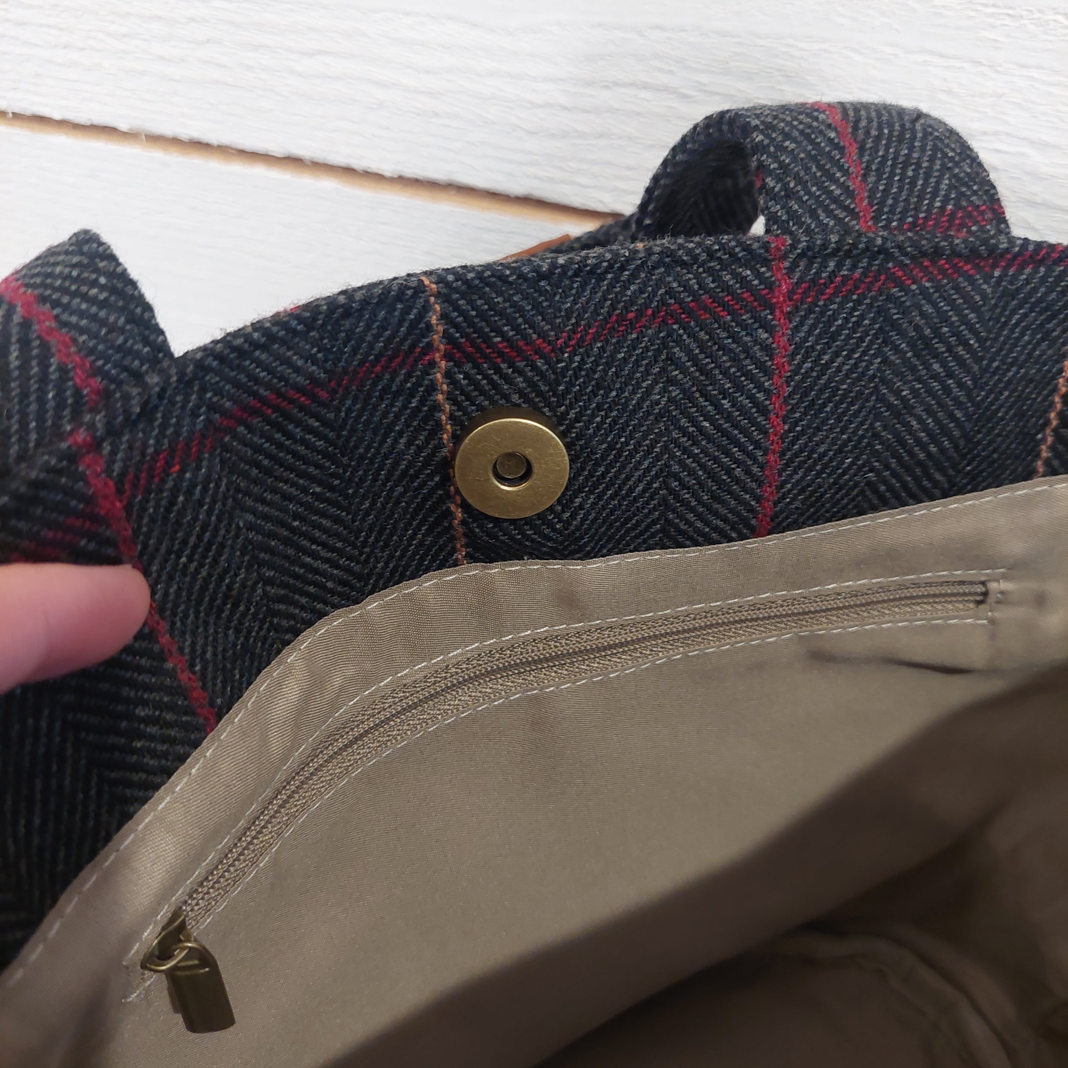 ポリエステルとウールの混紡素材を使用したチェック柄トートバッグ。
