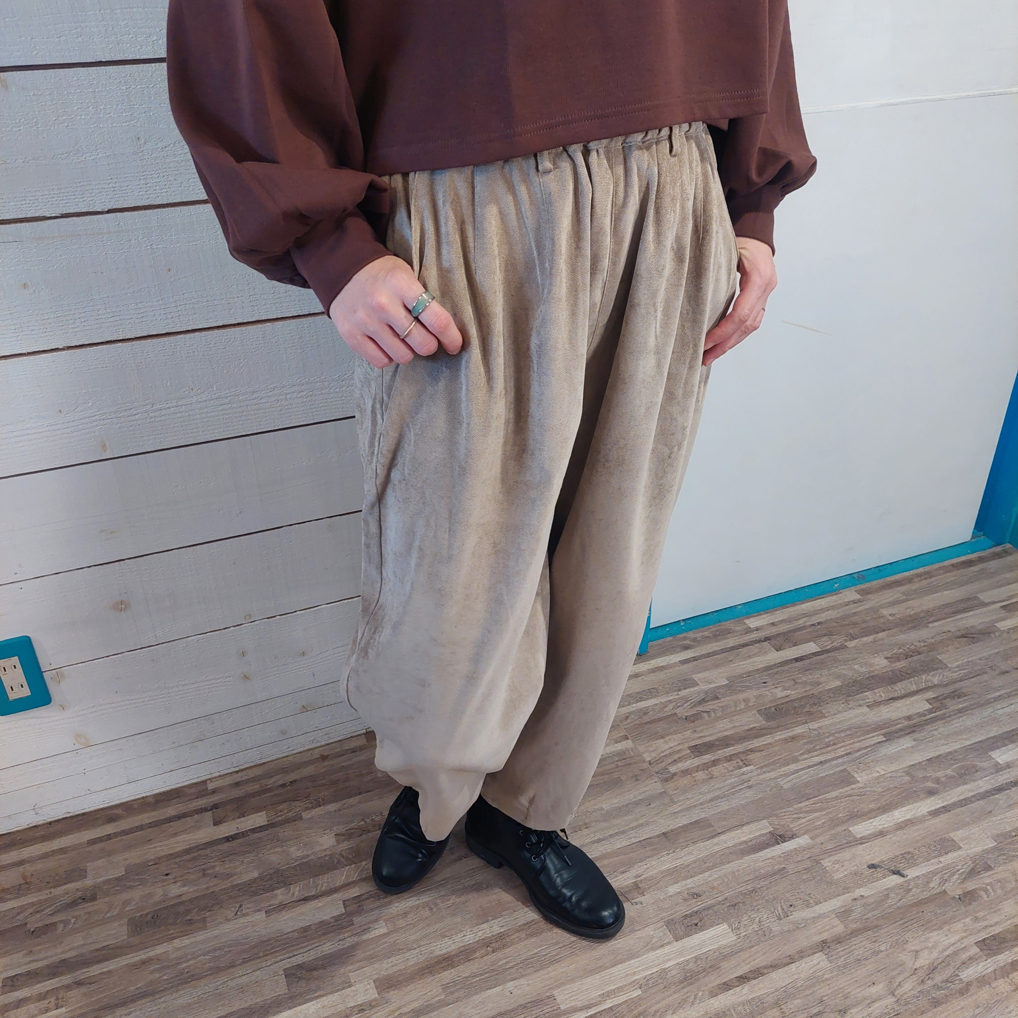 心地よいボリューム感と楽な履き心地が魅力の起毛ストレッチ サーカスパンツ!こなれ感がありつつシルエットにアクセントを加えるデザインは、どんなスタイルにもぴったりマッチします。ウエストには調整可能なゴム紐が施されており、快適なフィット感を実現。さまざまなコーディネートを楽しむことができるアイテムです!