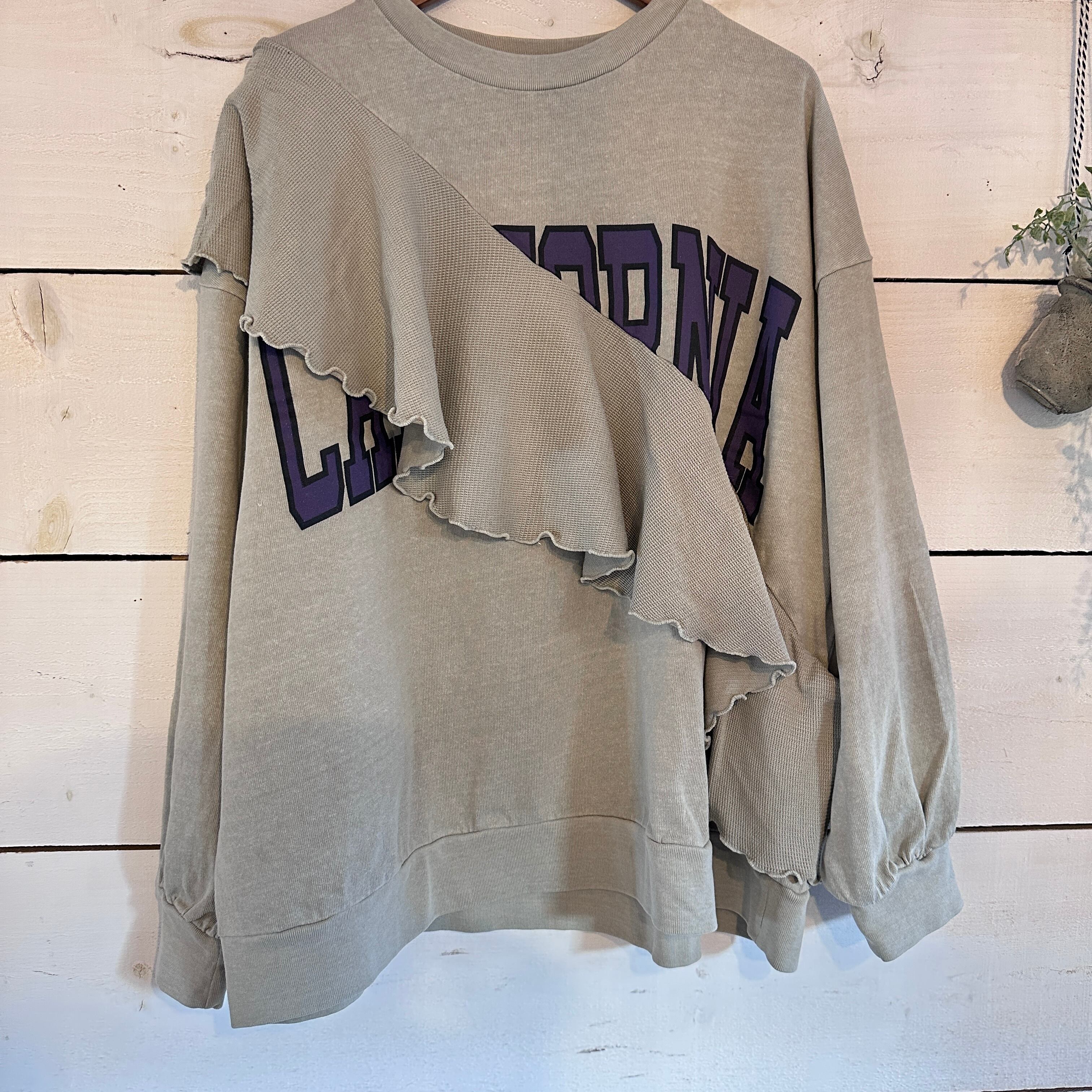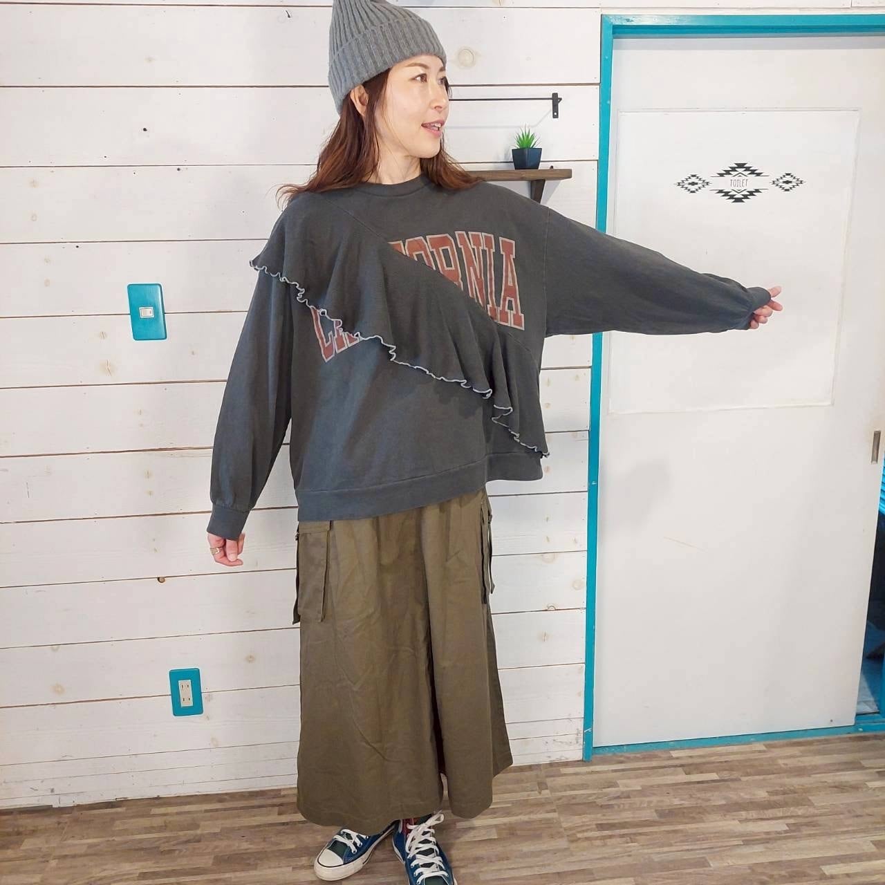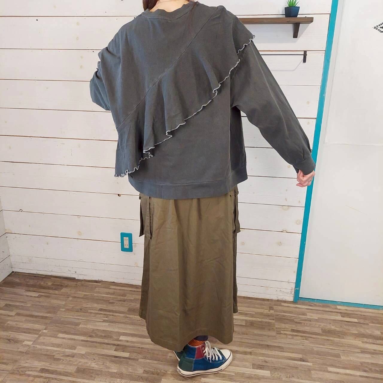 プリントスウェットの胸元には、斜めに施されたフリルが特徴的で、カジュアルながらも女性らしい印象を与えます。ピグメント加工により、独特な風合いが楽しめ、他のアイテムとも組み合わせやすく、デイリーコーディネートにぴったりの一着です。リラックスしたオシャレをお楽しみいただけます。