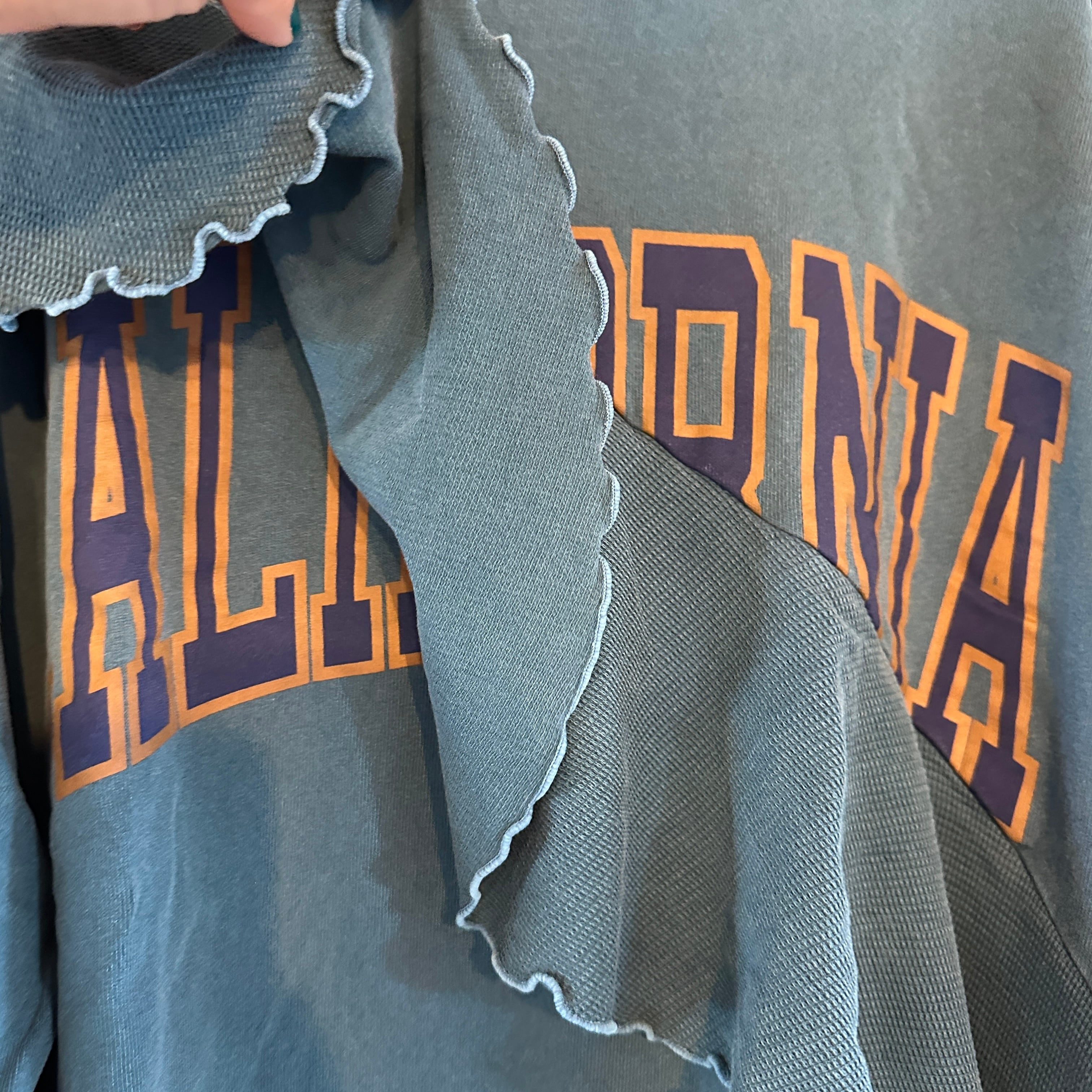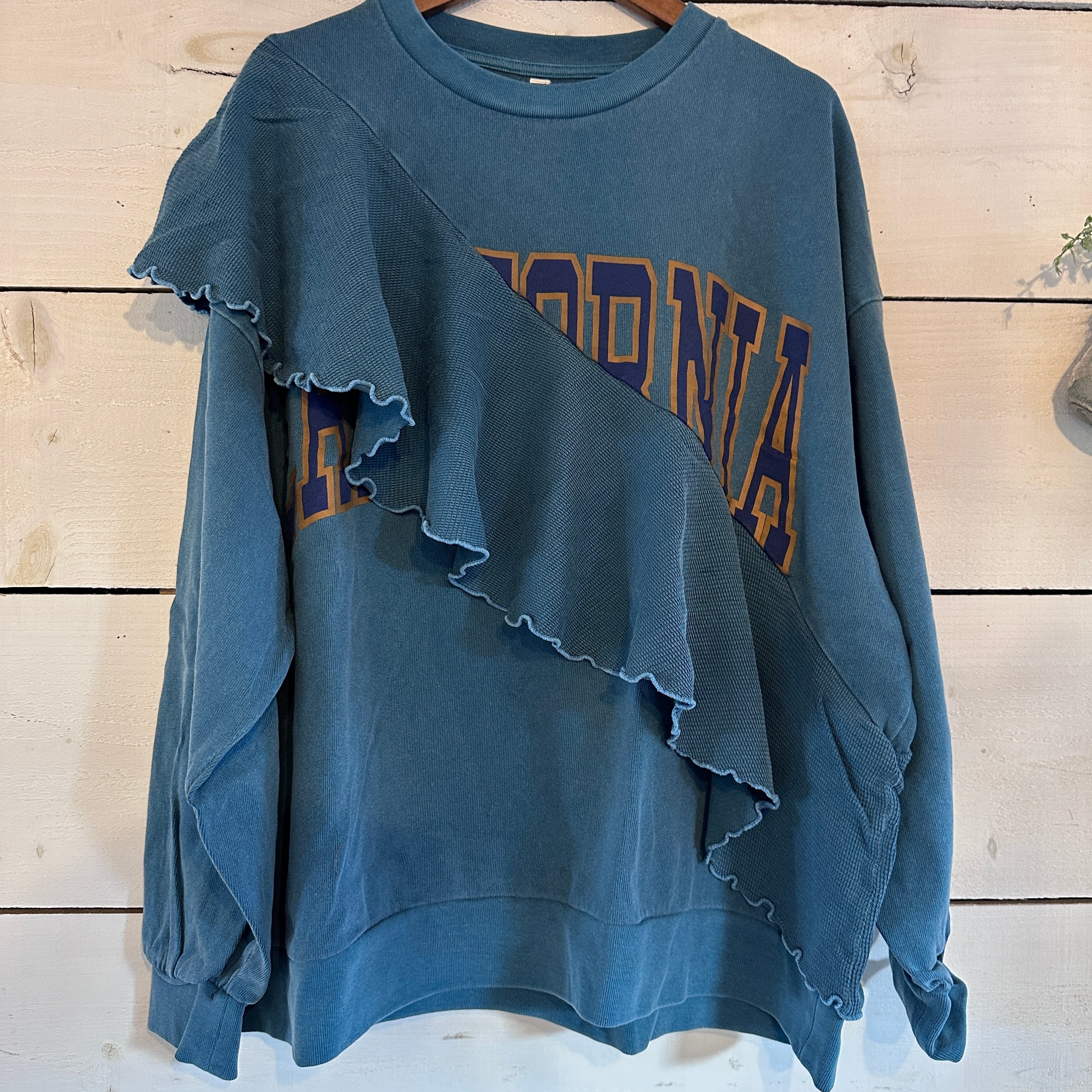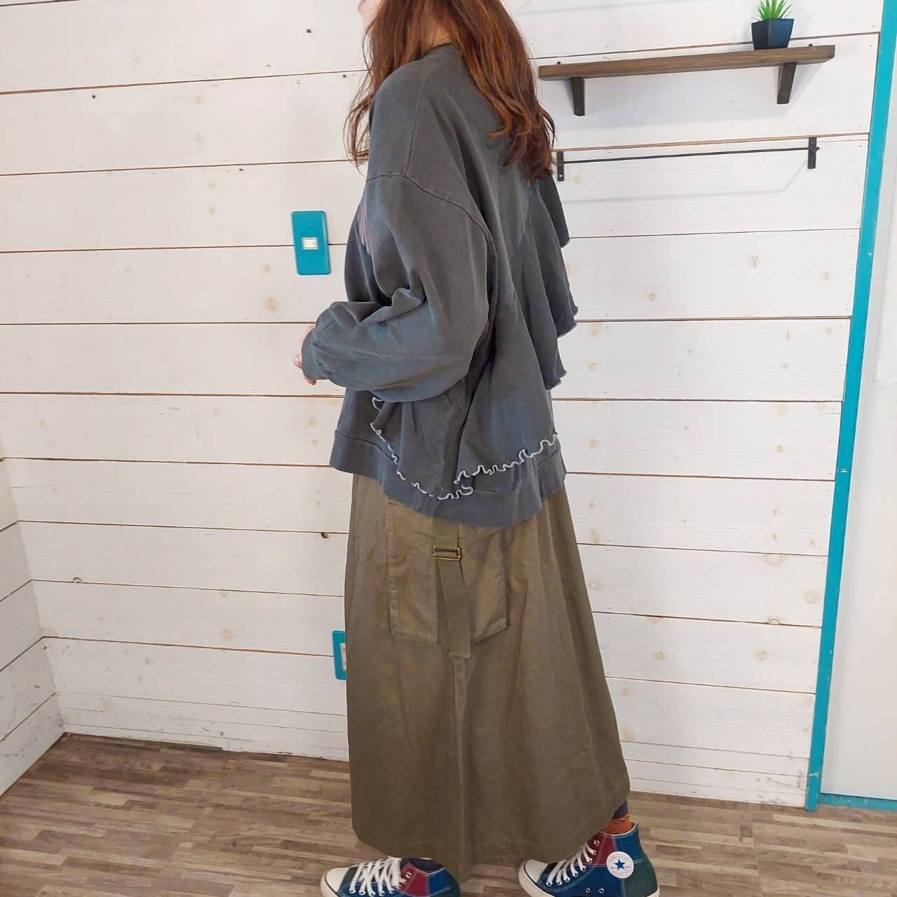 プリントスウェットの胸元には、斜めに施されたフリルが特徴的で、カジュアルながらも女性らしい印象を与えます。ピグメント加工により、独特な風合いが楽しめ、他のアイテムとも組み合わせやすく、デイリーコーディネートにぴったりの一着です。リラックスしたオシャレをお楽しみいただけます。