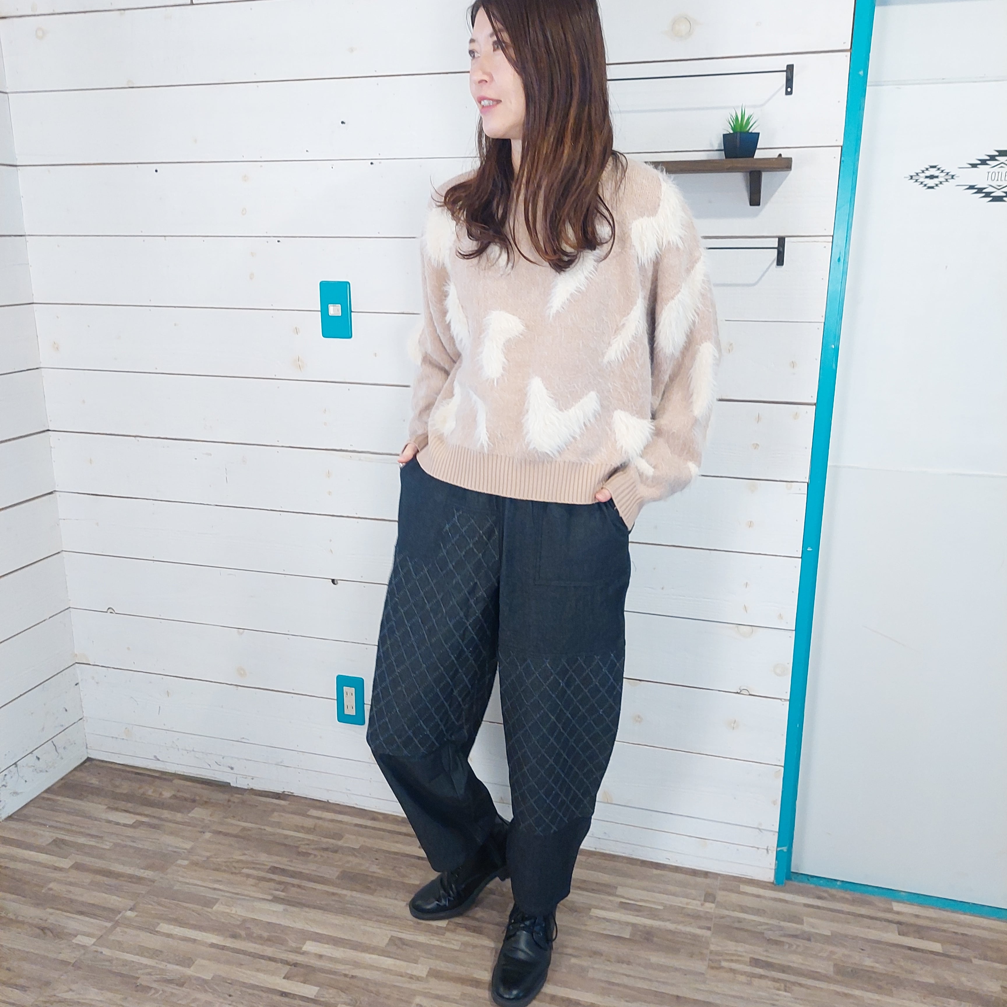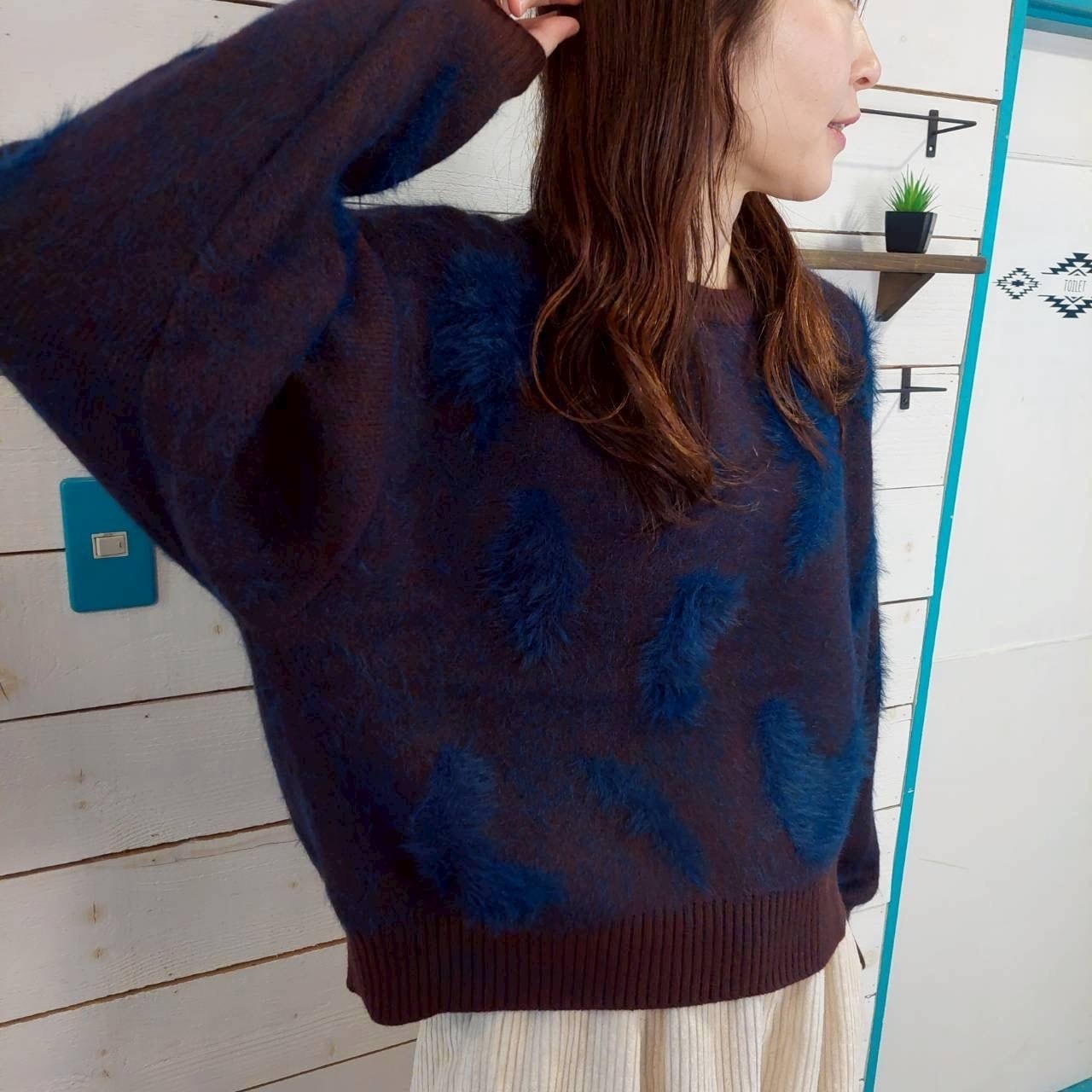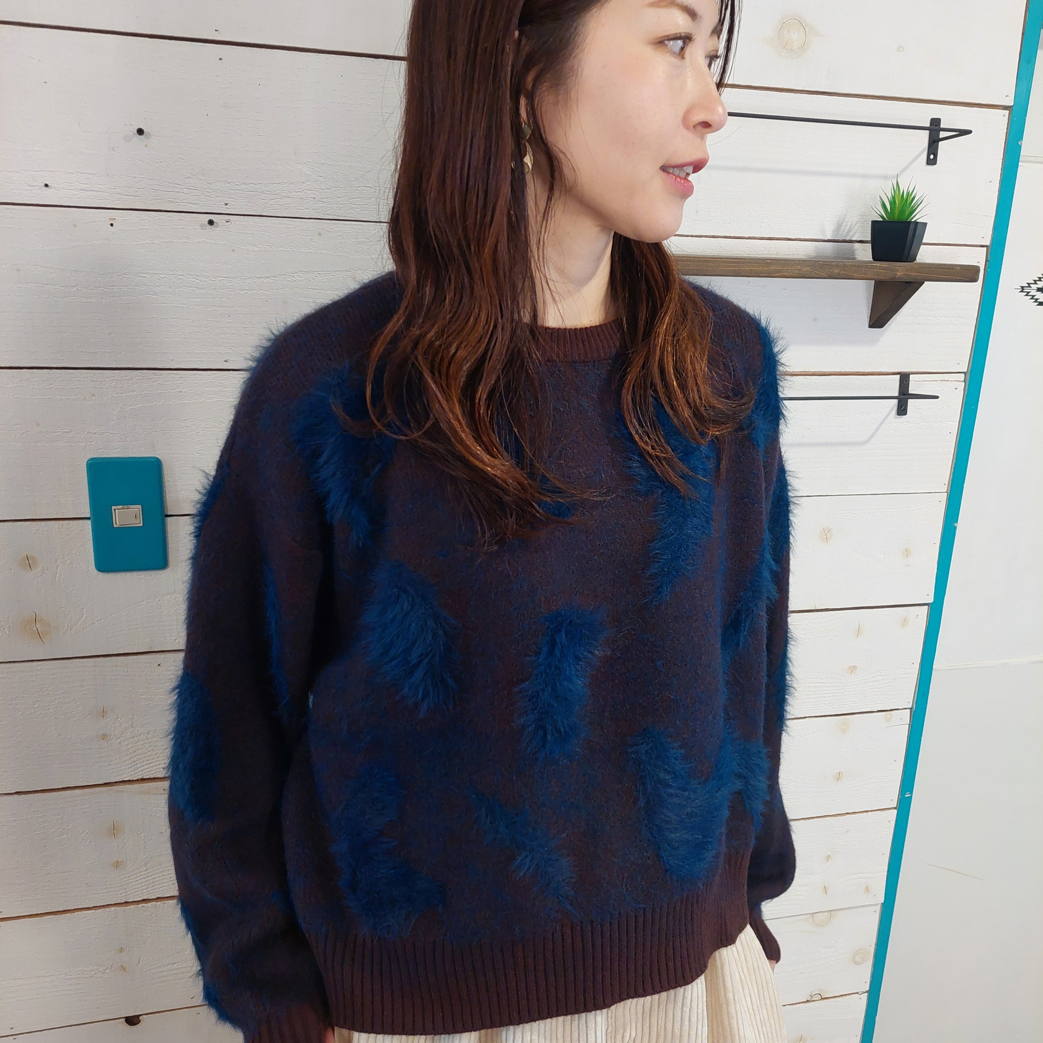 ふわふわとした素材感が魅力的なファーニット。やわらかく愛らしい風合いが特徴で、着心地の良さは抜群です。適度にゆとりを持たせたリラックスシルエットが、体型をカバーしつつ、こなれた雰囲気を演出します。また、襟元のリブは起毛していない同色の糸で引き締めているため、デザインにアクセントを加えています。シンプルながらもしっかりと存在感があり、着るだけで様になるおしゃれな一着です。カジュアルな日常使いから、ちょっとしたお出かけまで、さまざまなスタイリングに重宝するアイテムです。