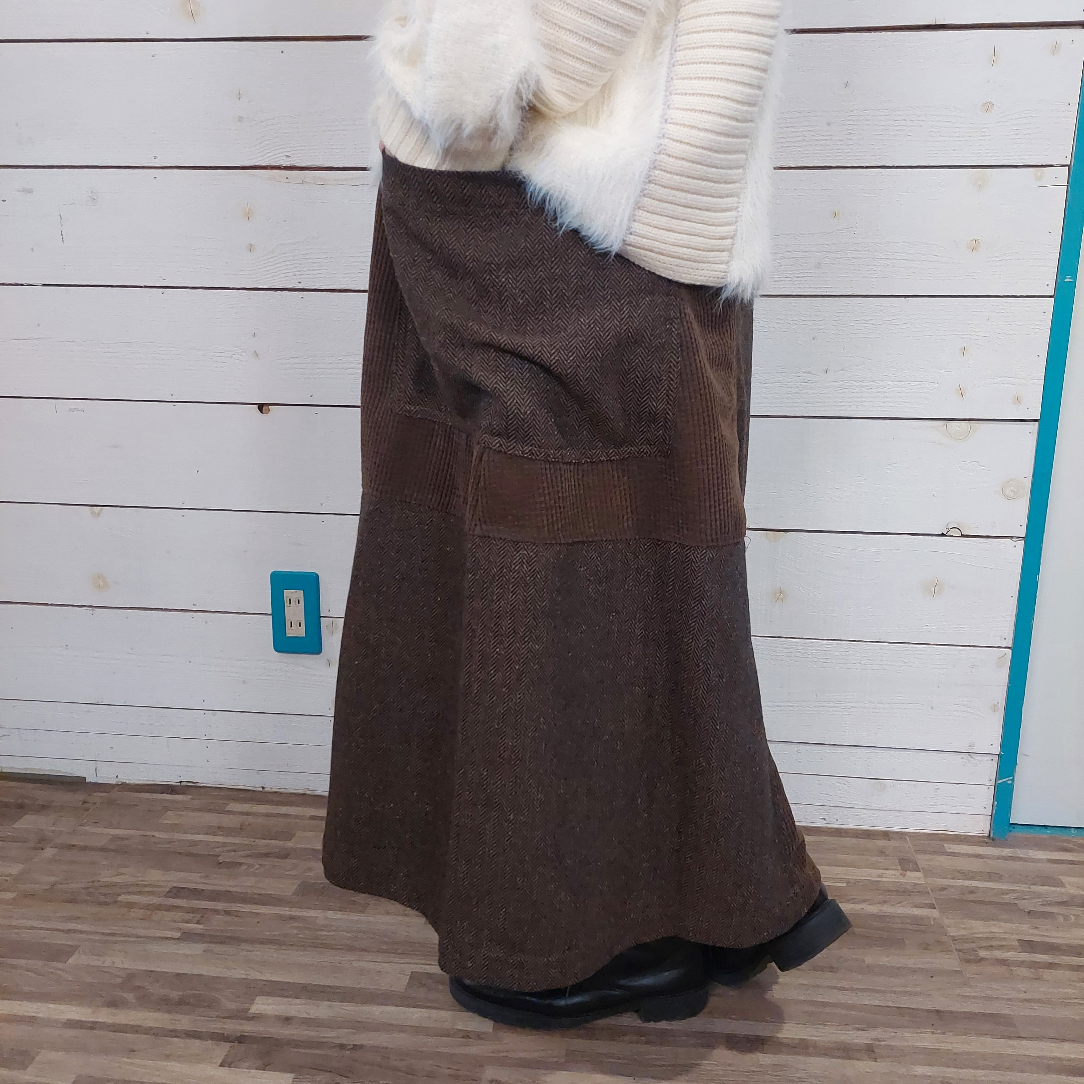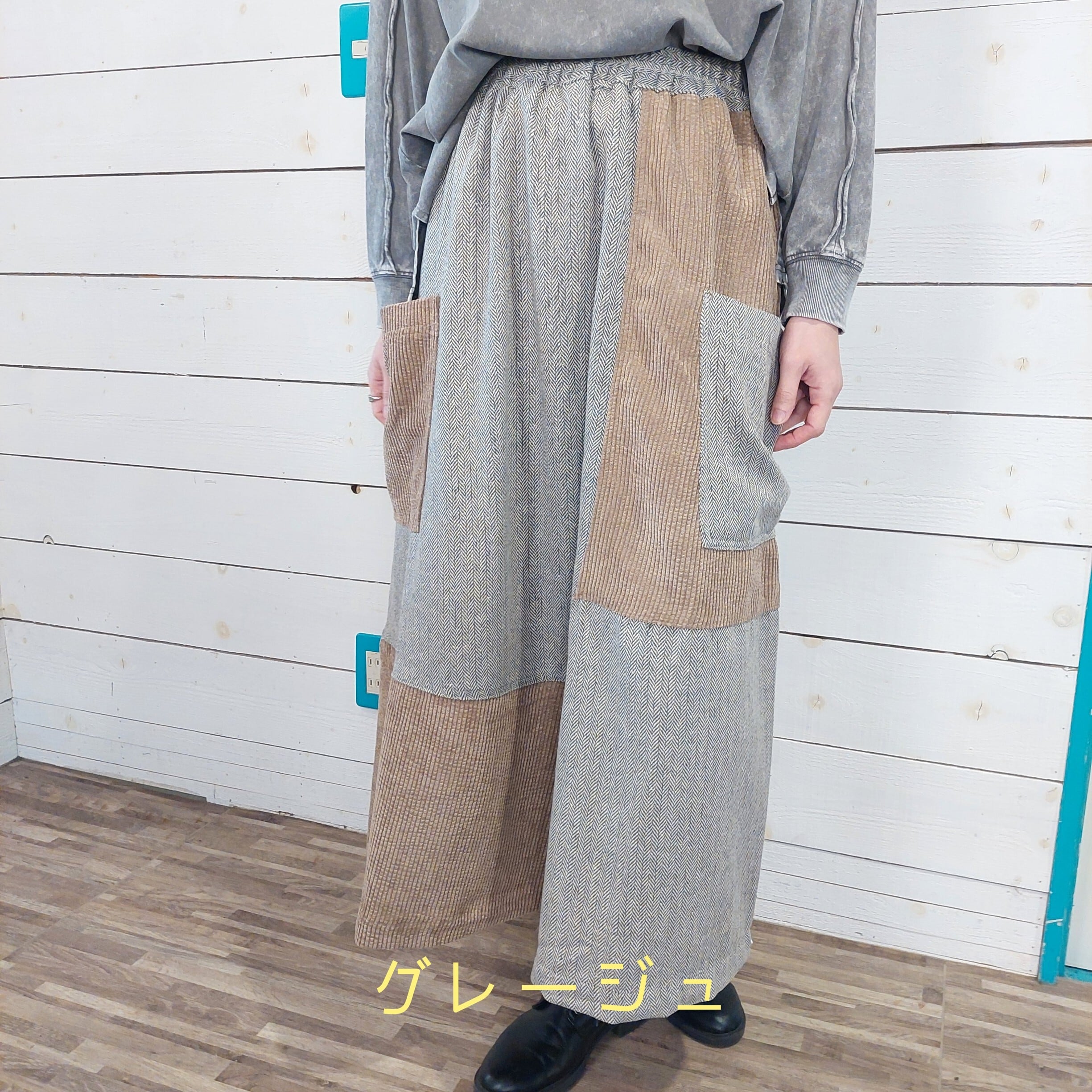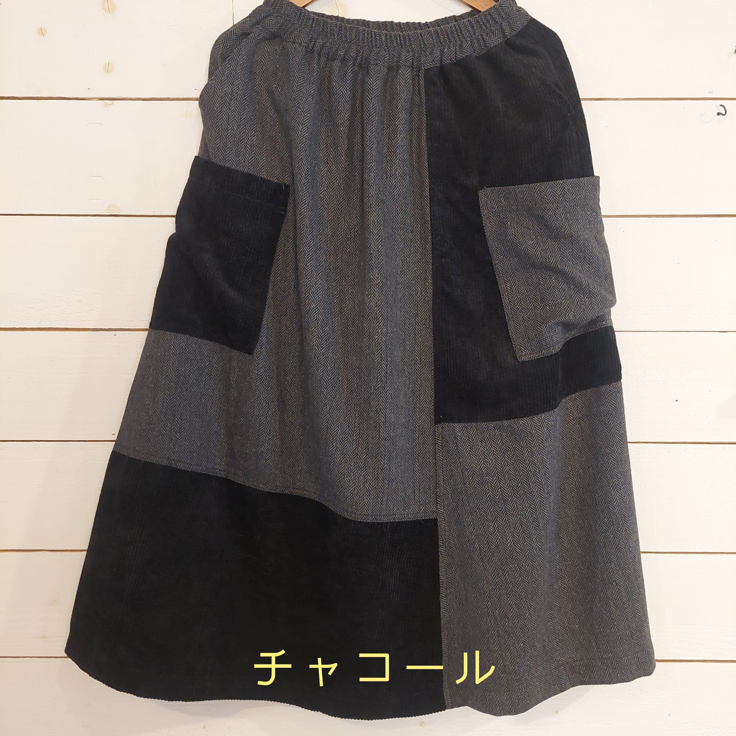 スタイリッシュでありながら、カジュアルな印象を与えるヘリンボーンパッチワークフレアスカートは、ヘリンボーン素材にコーデュロイパッチを施した、オシャレで個性的な一着です。ウエストはゴム仕様で、着心地も抜群。大きめのポケット付きで、実用性も兼ね備えています。