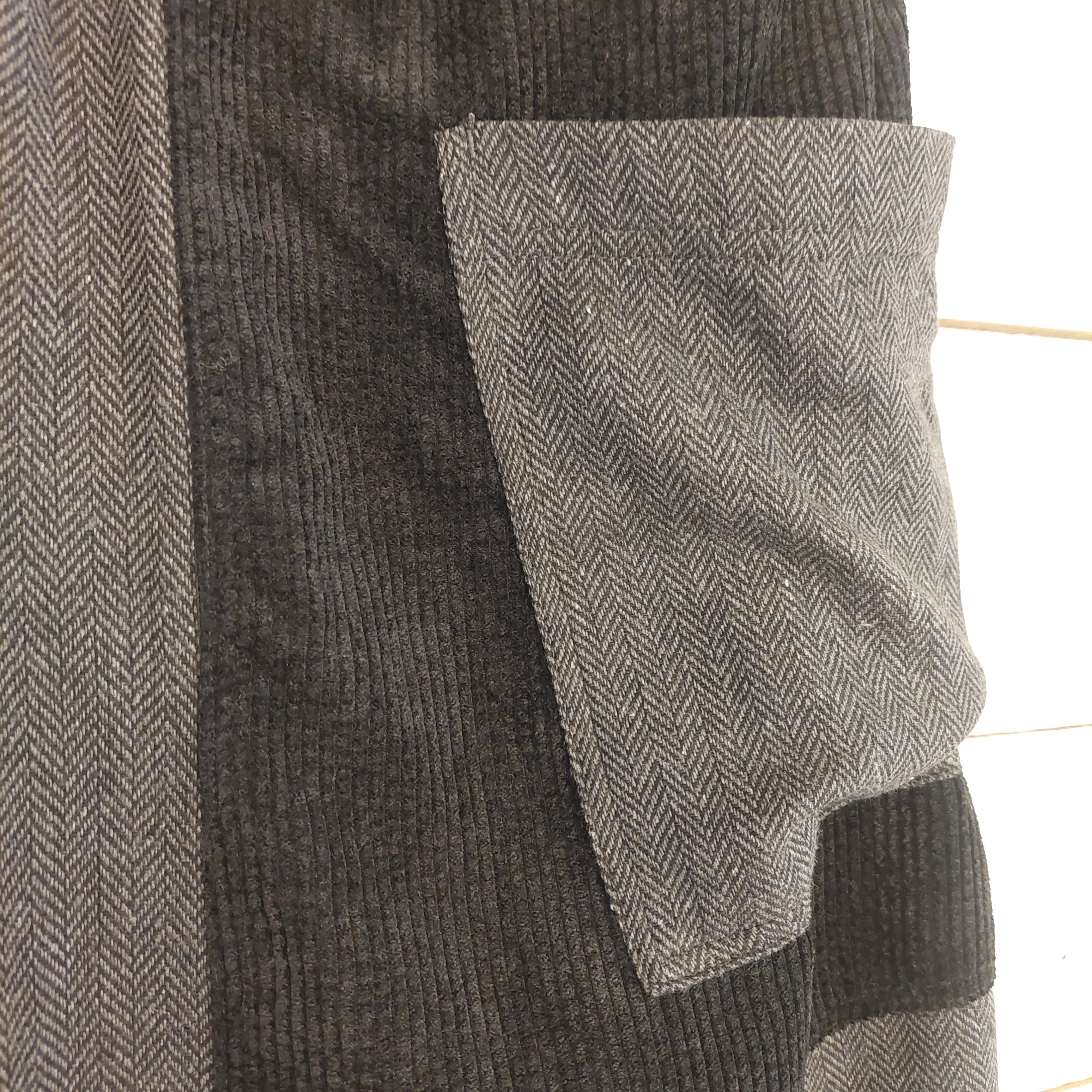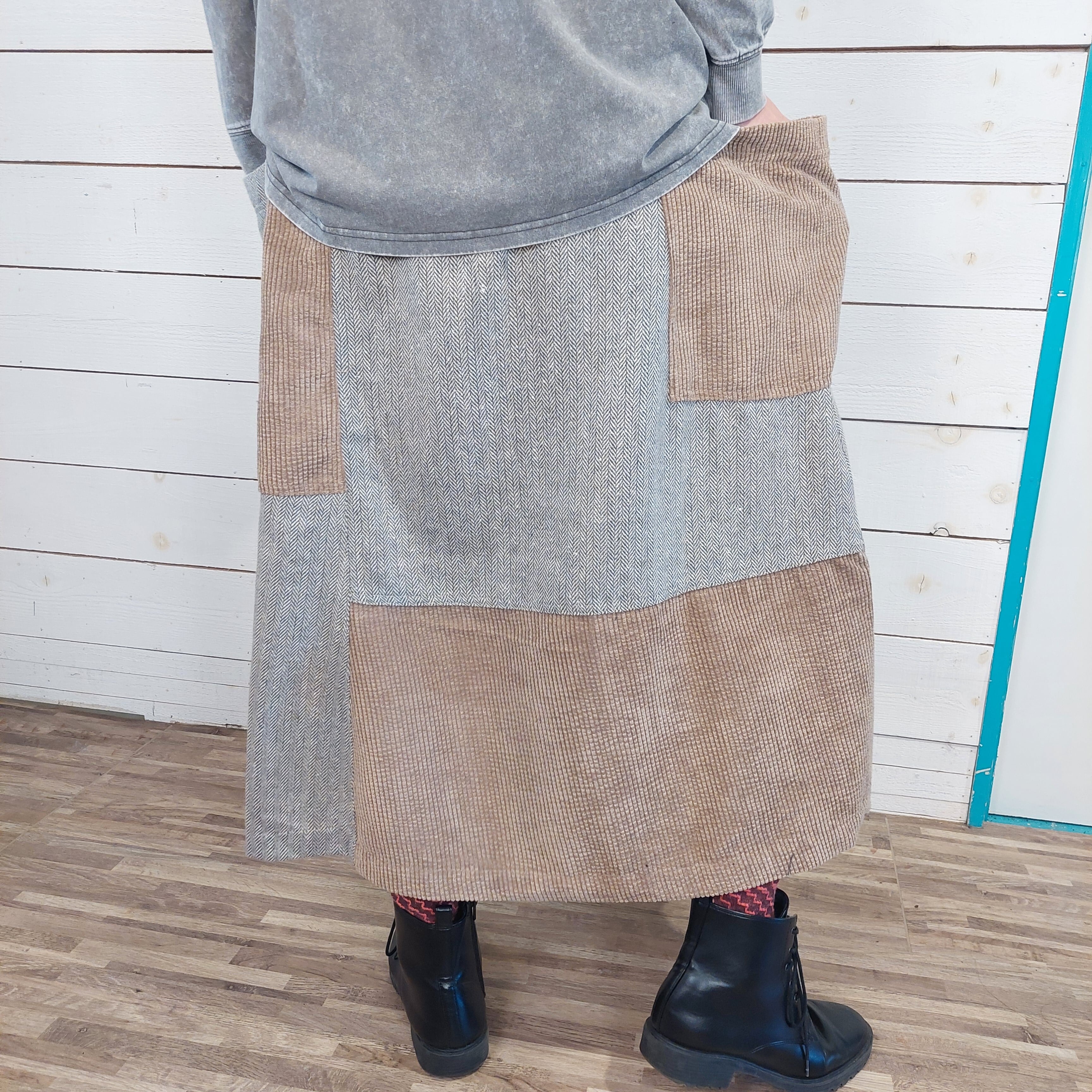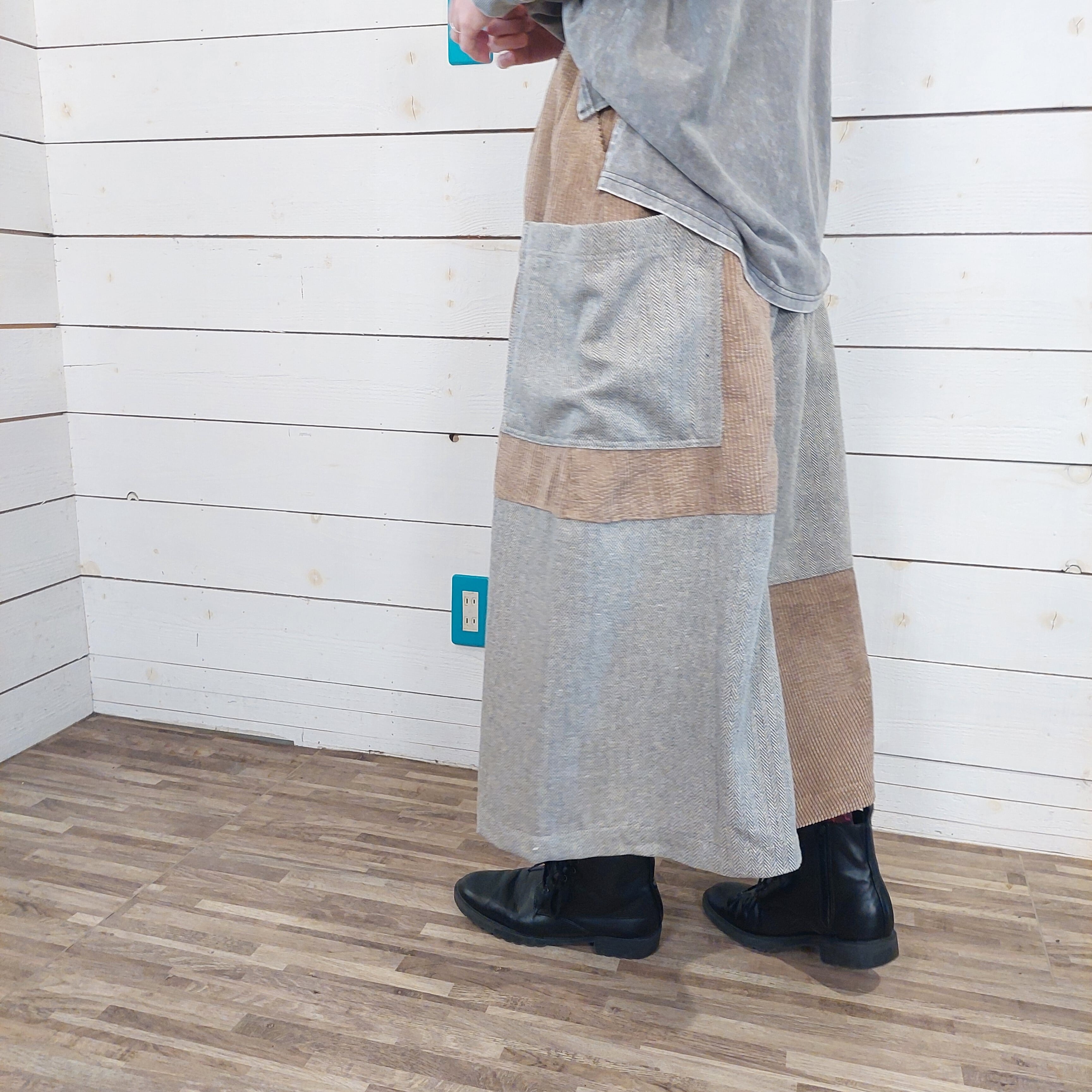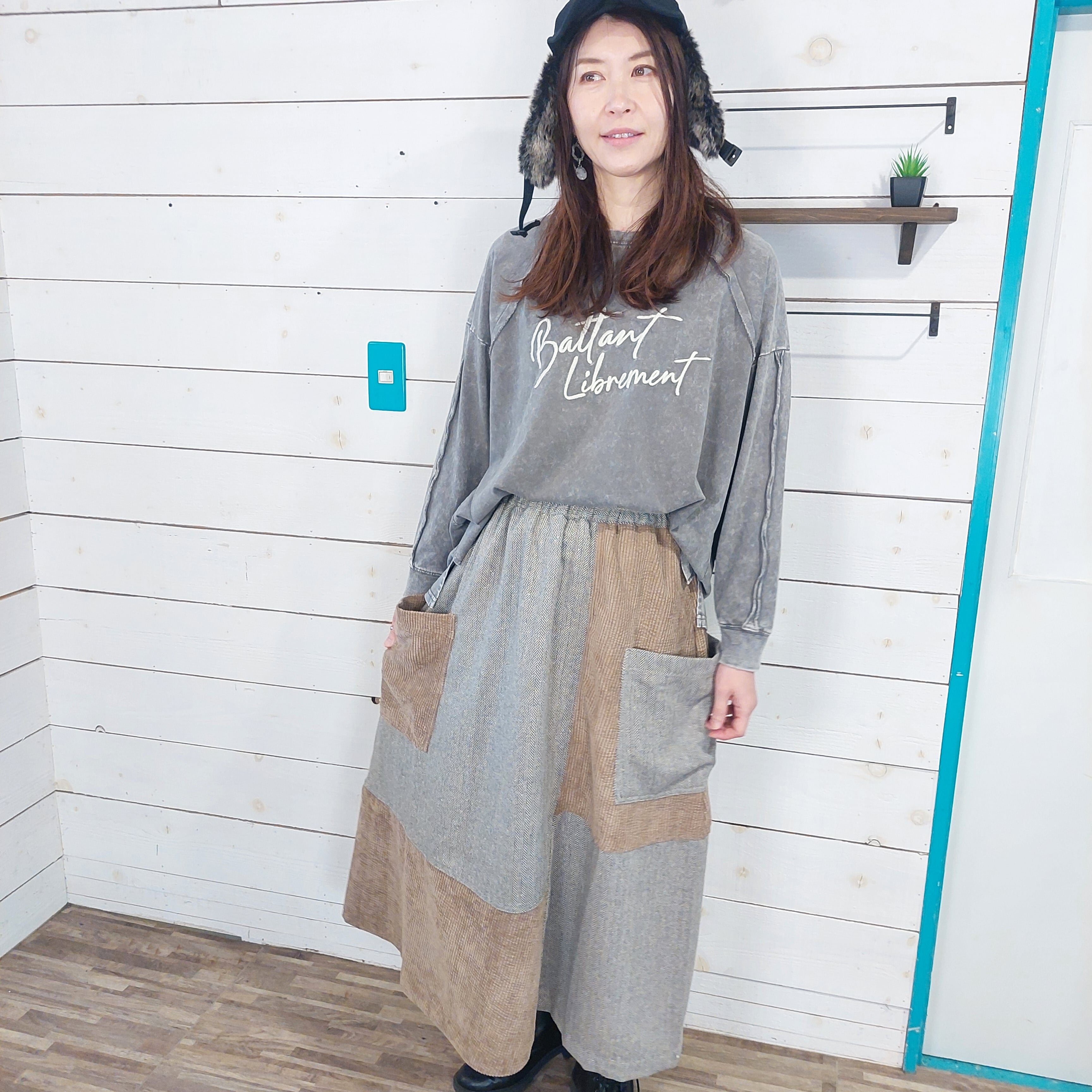 スタイリッシュでありながら、カジュアルな印象を与えるヘリンボーンパッチワークフレアスカートは、ヘリンボーン素材にコーデュロイパッチを施した、オシャレで個性的な一着です。ウエストはゴム仕様で、着心地も抜群。大きめのポケット付きで、実用性も兼ね備えています。