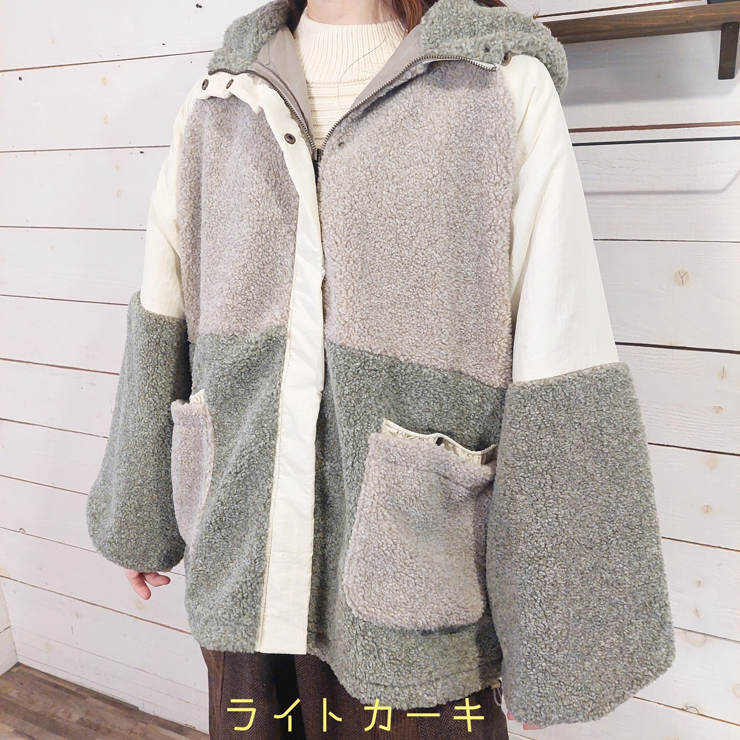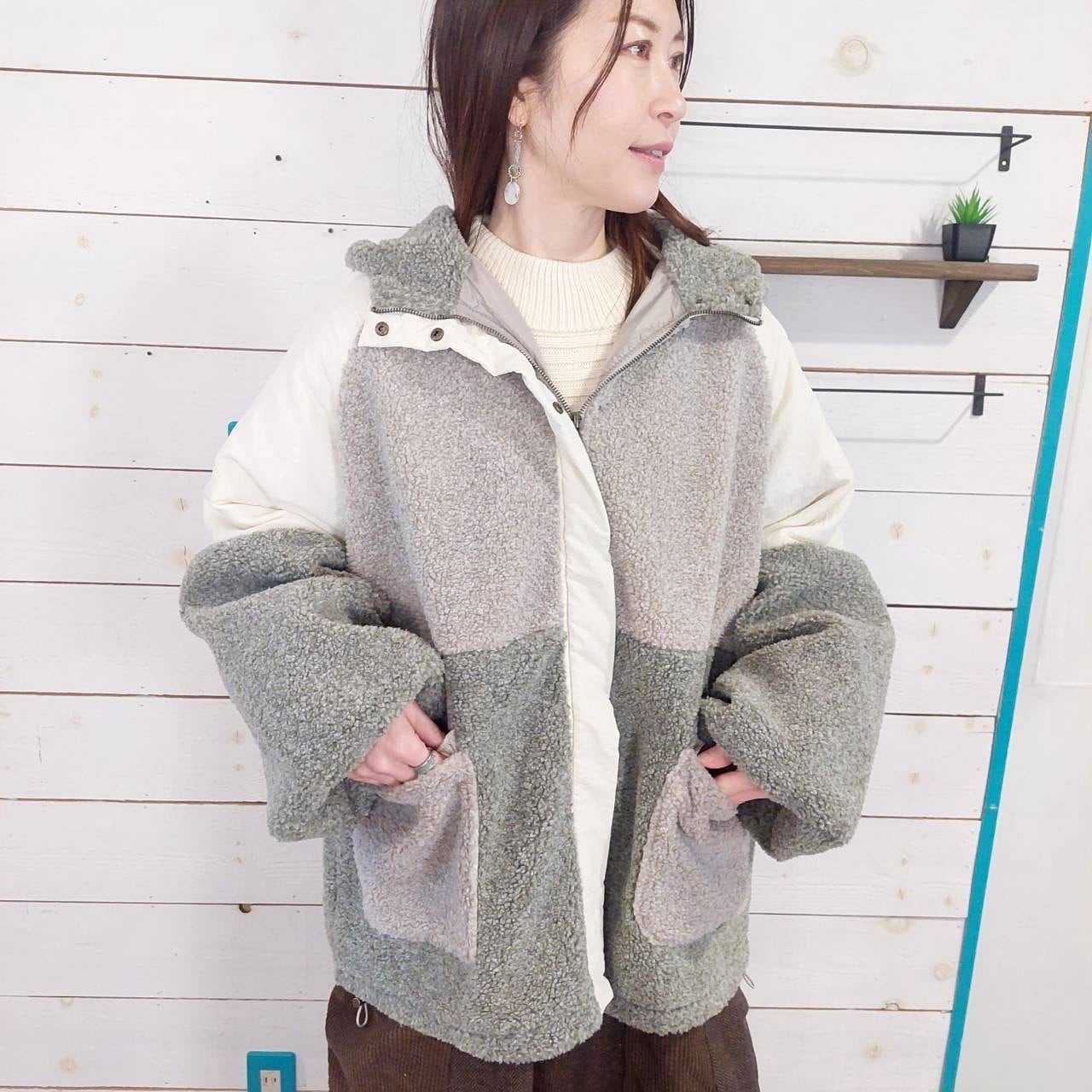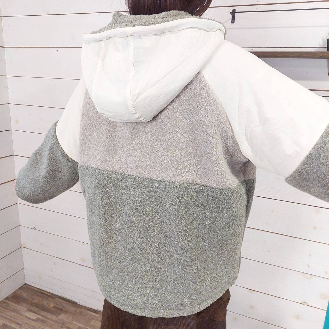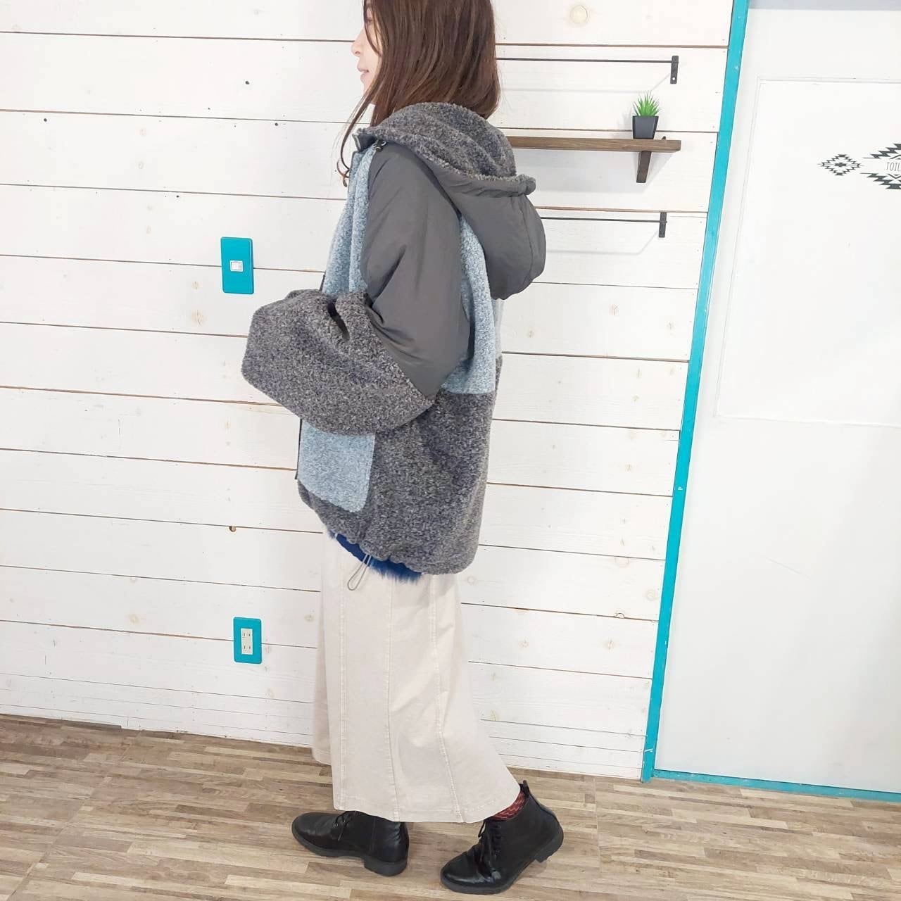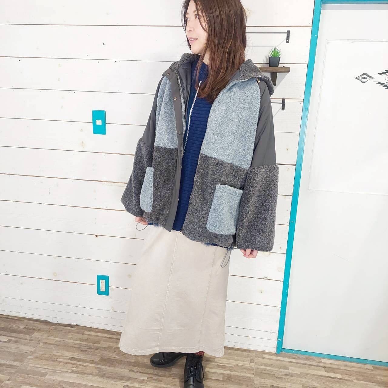 ボアナイロン配色ボアフーディージャケットは、異素材の切り替えが魅力的な一着です。柔らかなボアと撥水性のあるナイロン生地を組み合わせることで、スタイリッシュさと機能性を両立させました。フード付きのデザインは、寒い日でもしっかりと温かさを提供し、快適な着心地を実現します。