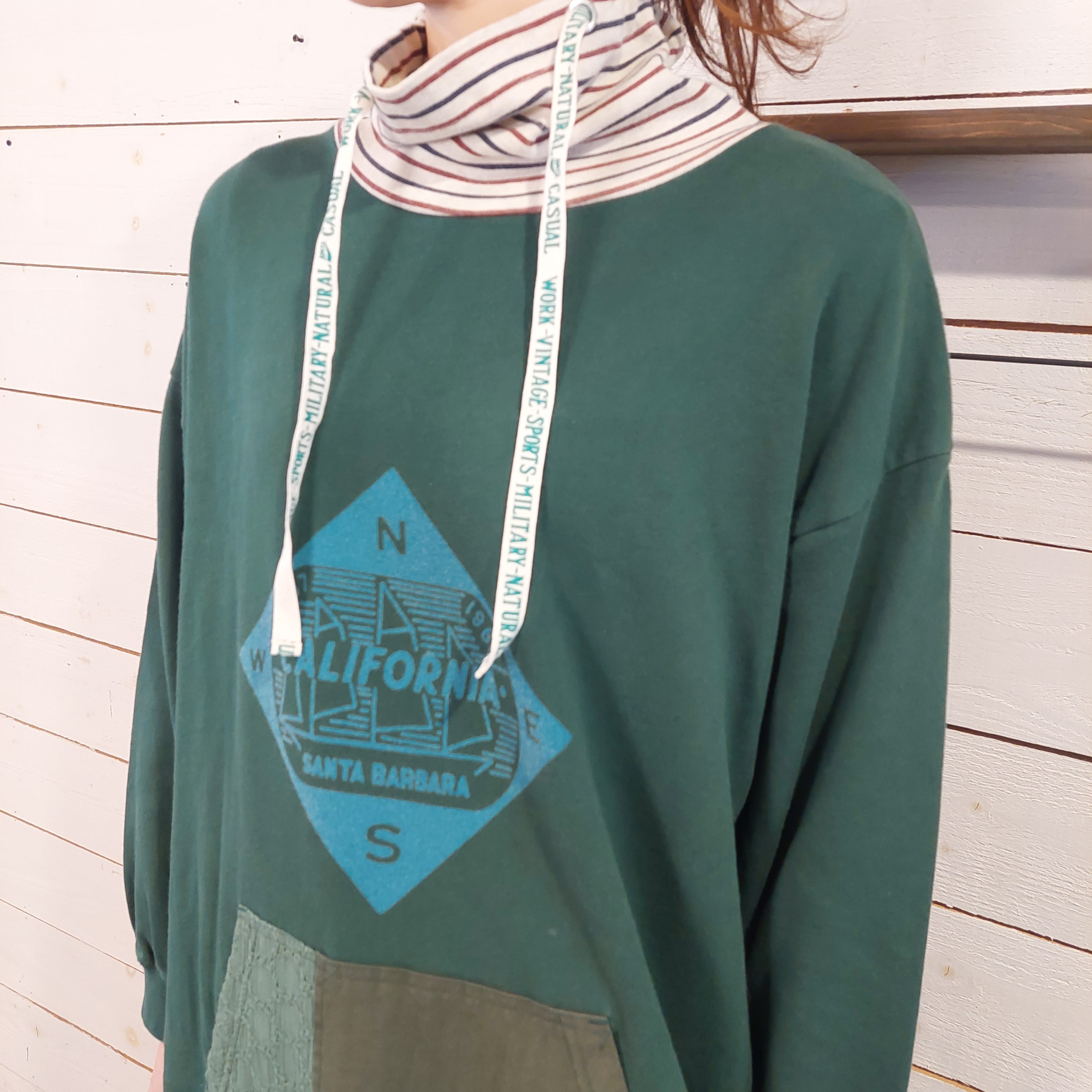 フロントには大きめの英字ロゴプリントと異素材ポケットを配置。ハイネック部分のドローコードと、裾のコードが程よいアクセントになり、シルエットの変化を楽しめます。ラグランスリーブ仕様で肩回りもゆったりとしており、動きやすくリラックスした着心地。両サイドポケット付きで実用性も兼ね備えています。