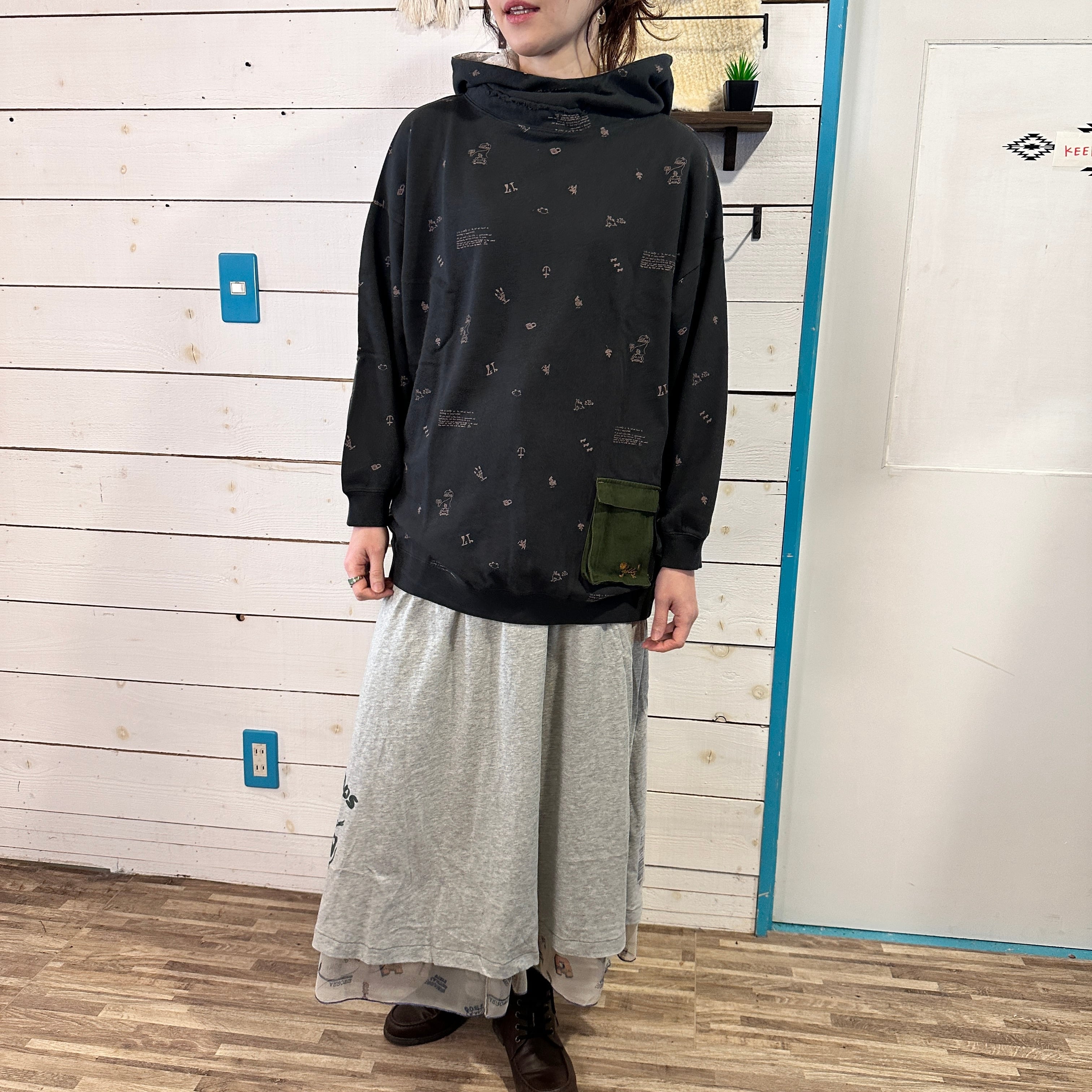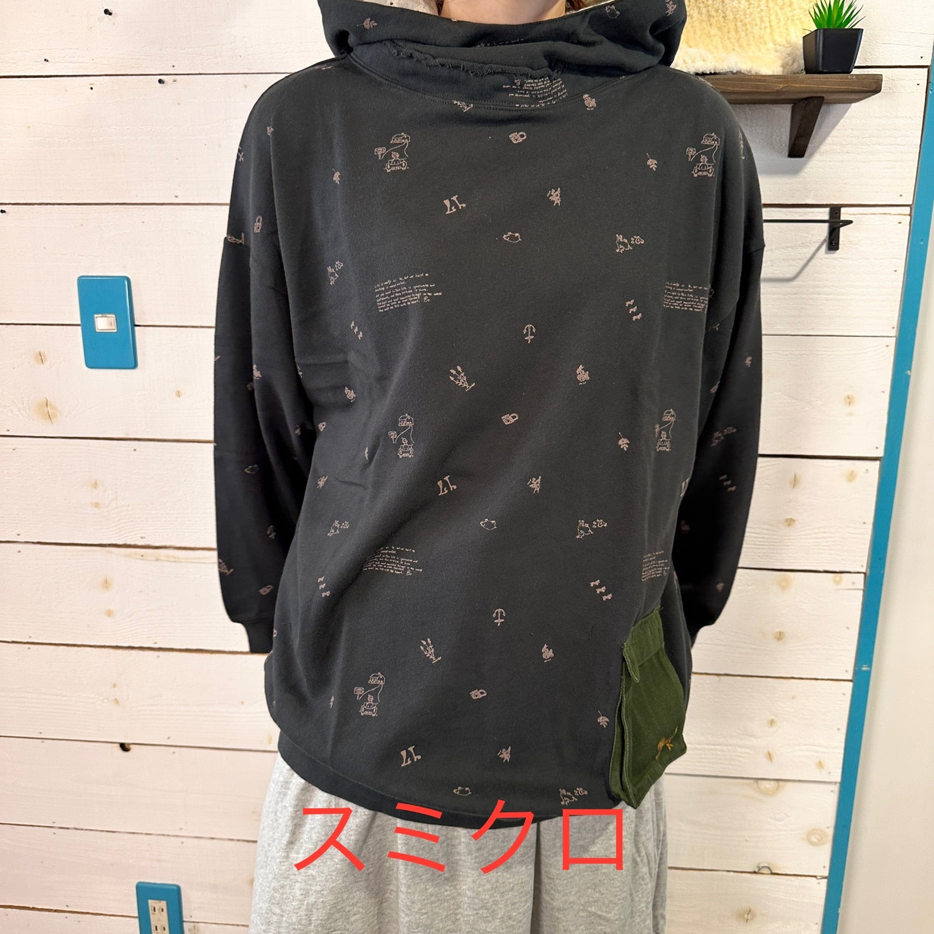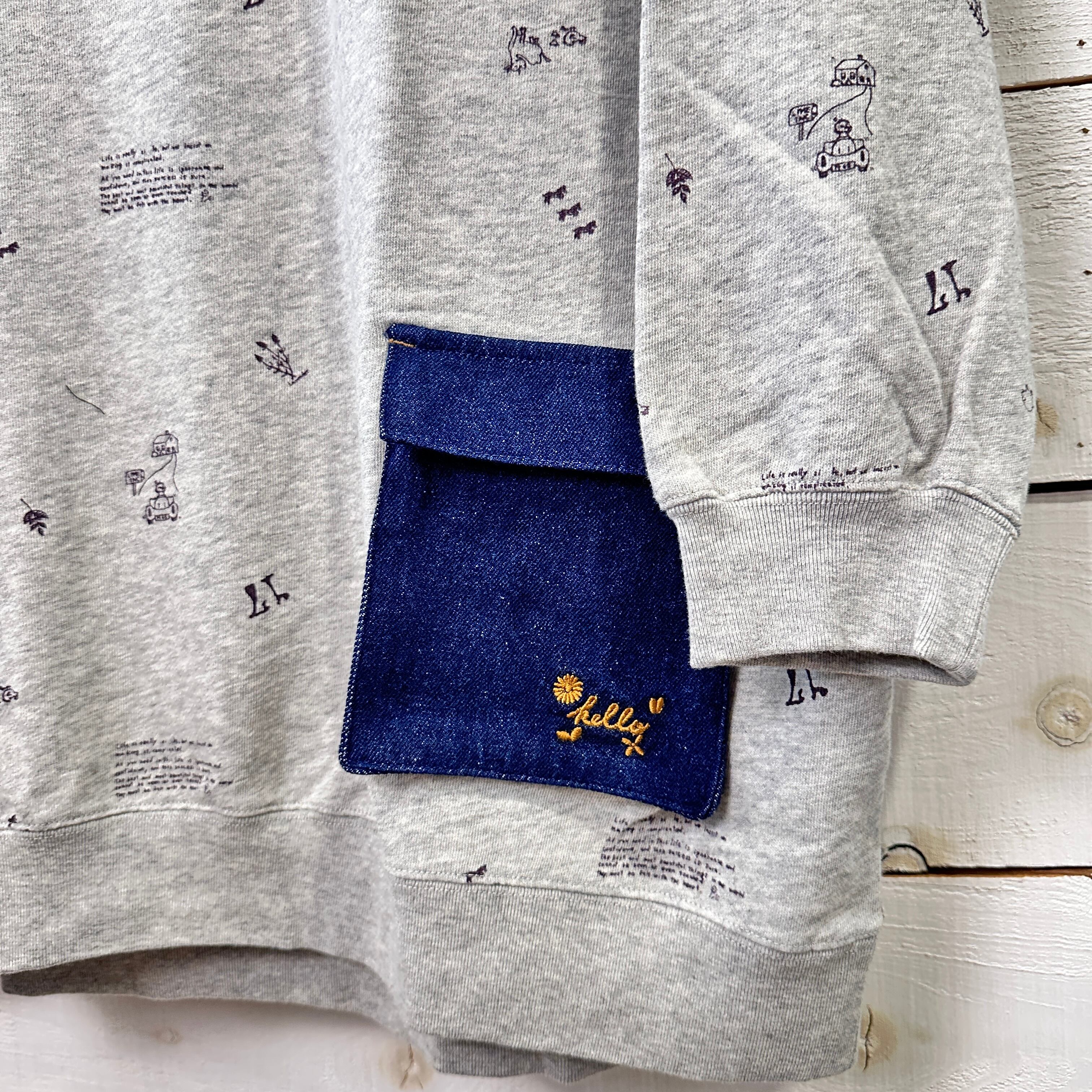 どこかほっとするような、牧場の風景を手描きタッチで表現した総柄が目を惹くプルパーカー。