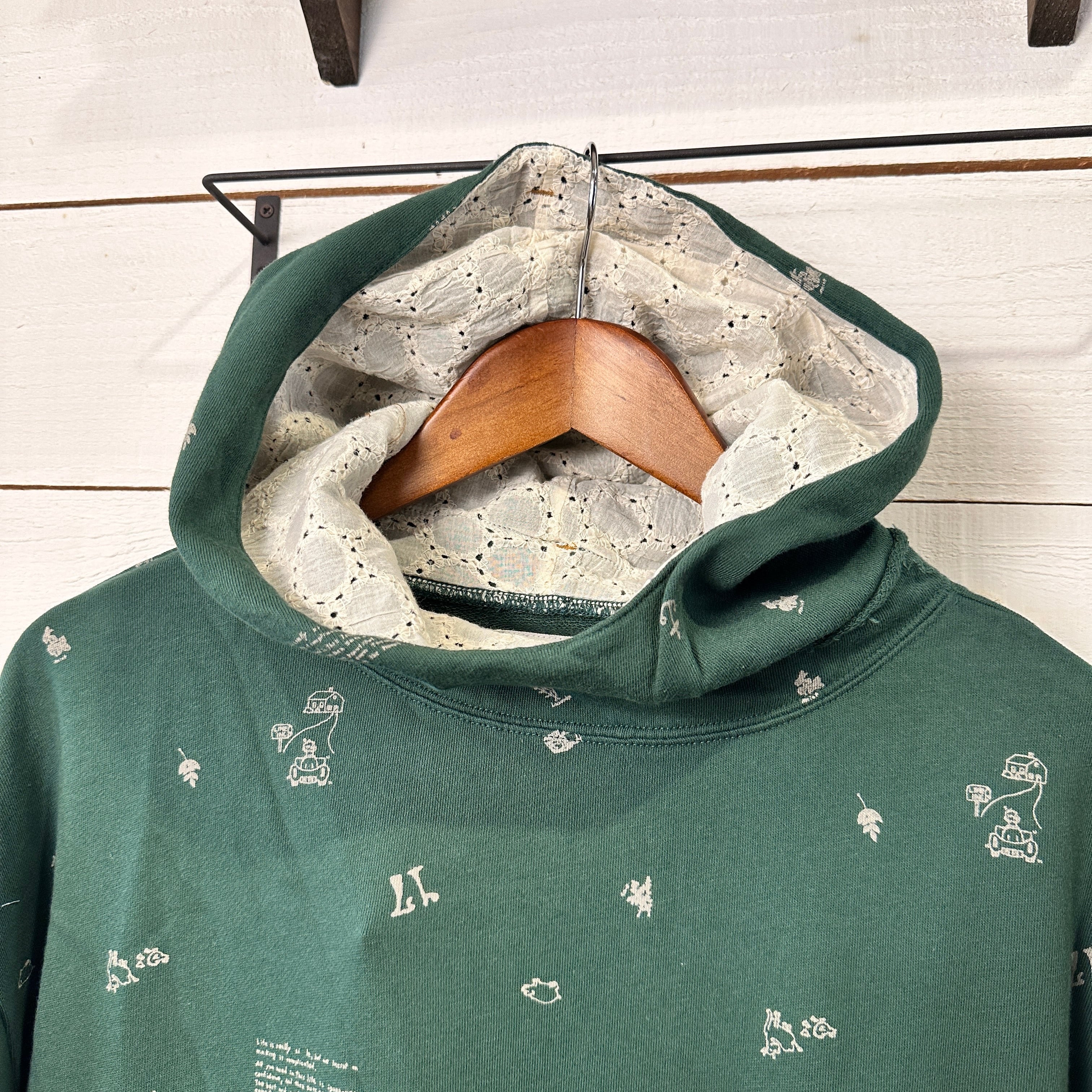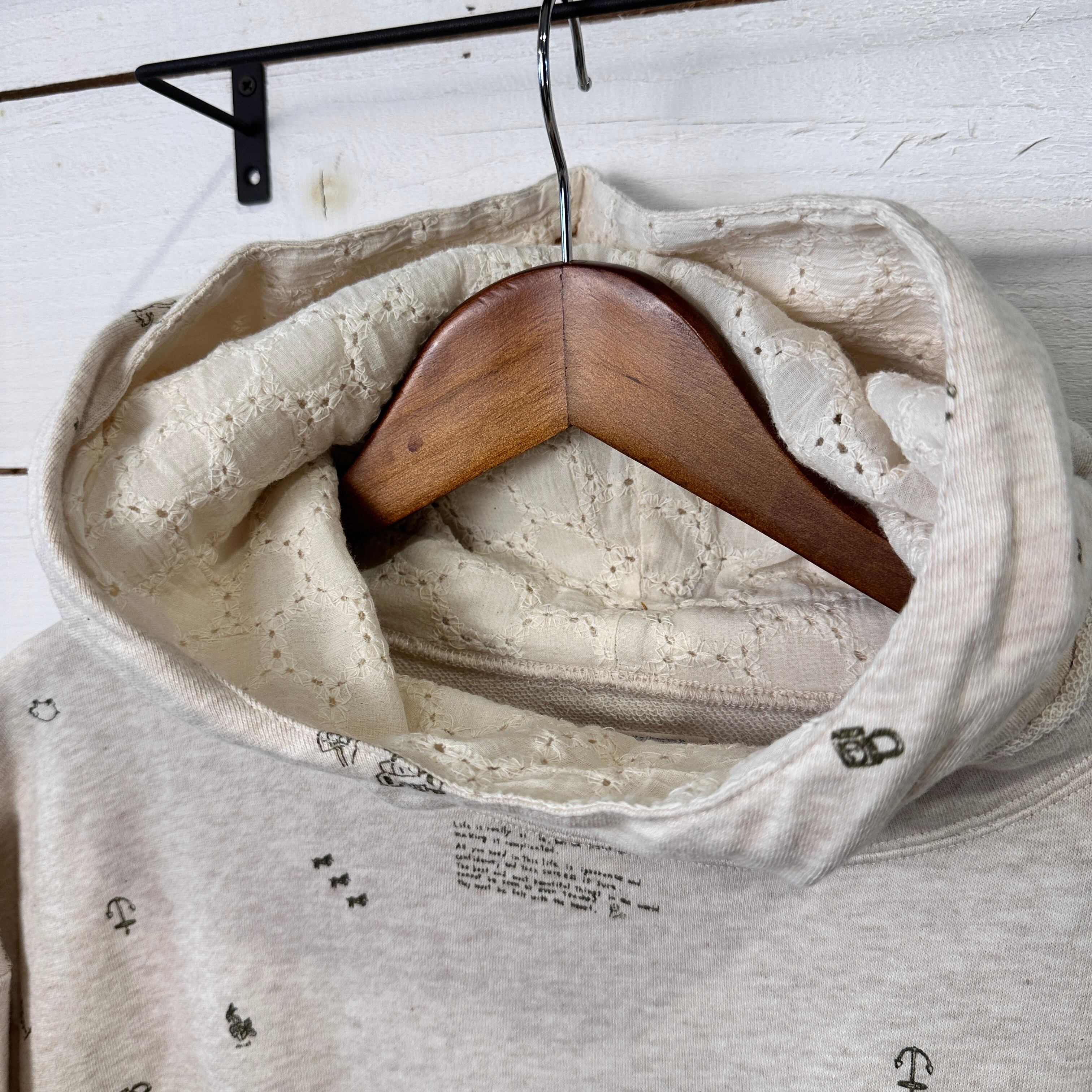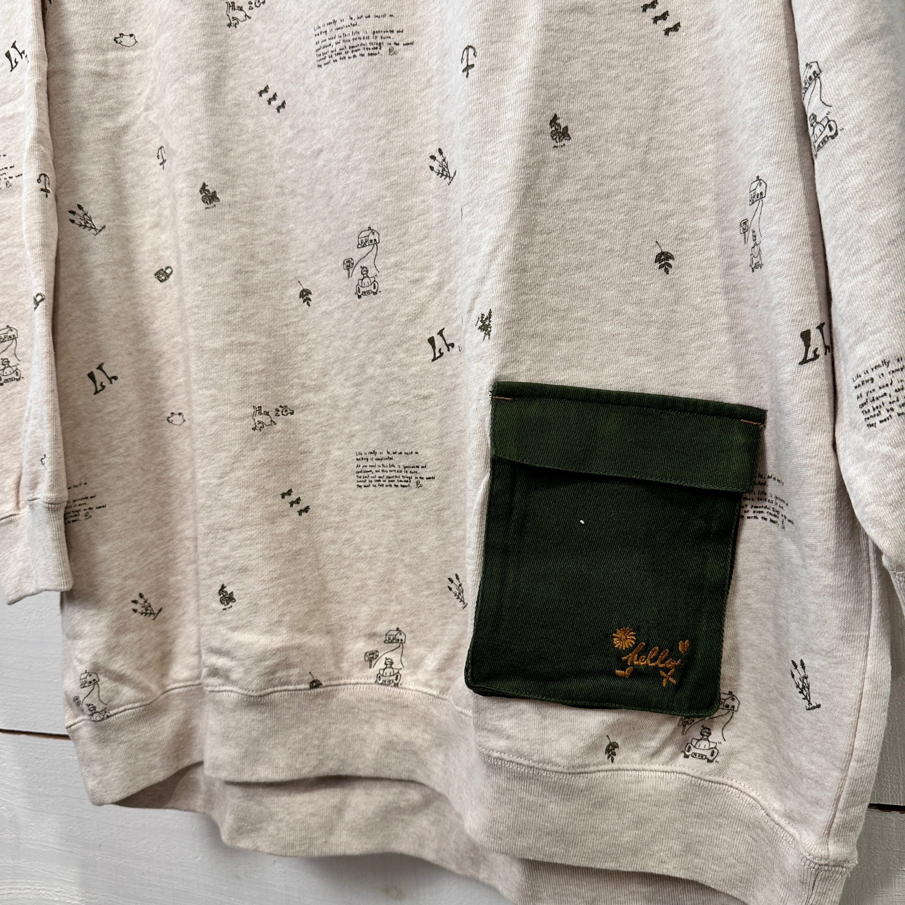 どこかほっとするような、牧場の風景を手描きタッチで表現した総柄が目を惹くプルパーカー。