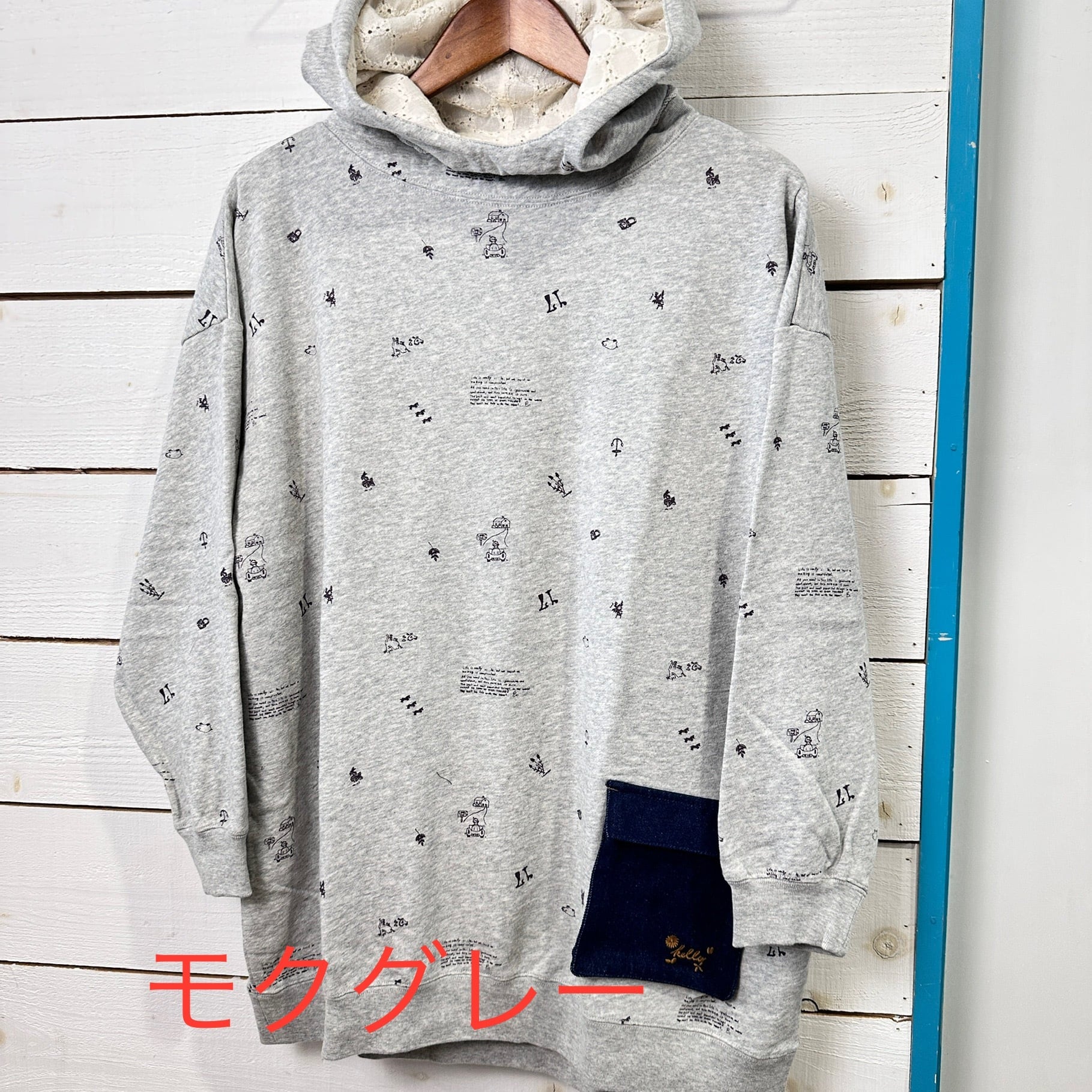 ゆったりしたフードは顔まわりを柔らかく包み込み、ドロップショルダーのシルエットが肩のラインをきれいに見せます。裾には軽くゴムを通し、ふんわりと丸みを帯びたフォルムに。袖口のリブがしっかりと手元をフィットさせ、全体のバランスを整えています。ラフに着ても可愛く、体のラインを拾わないリラックス感が魅力です。