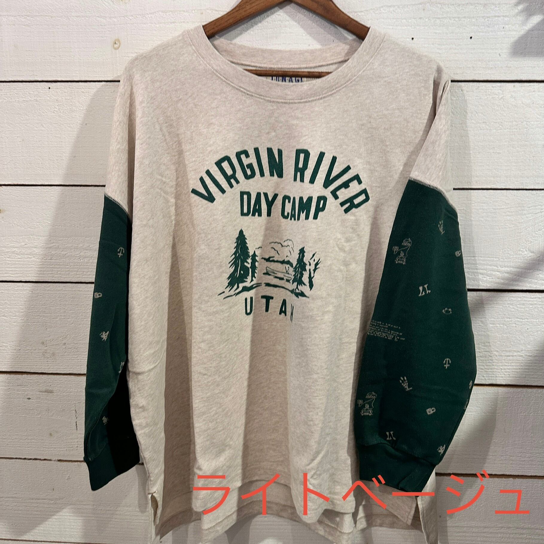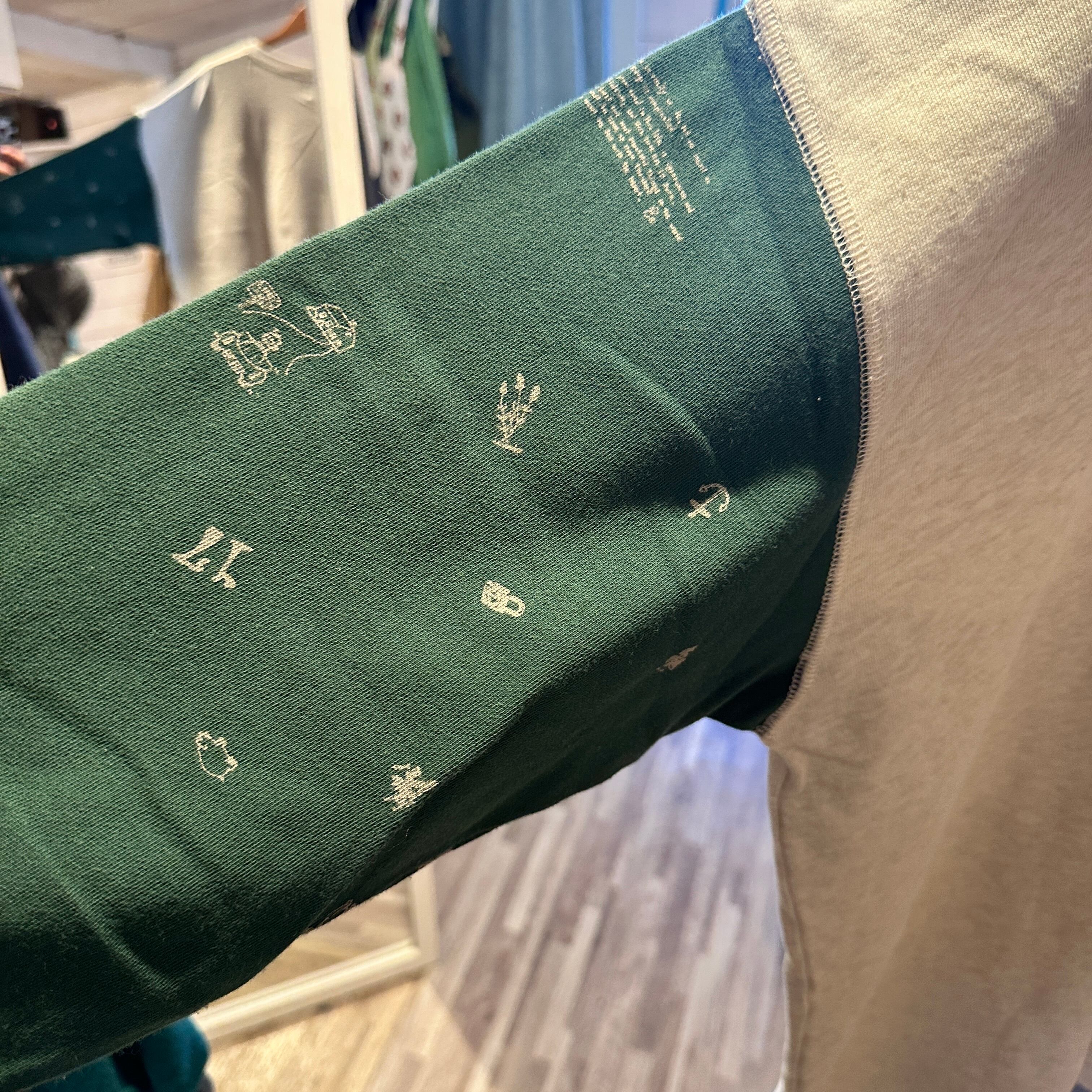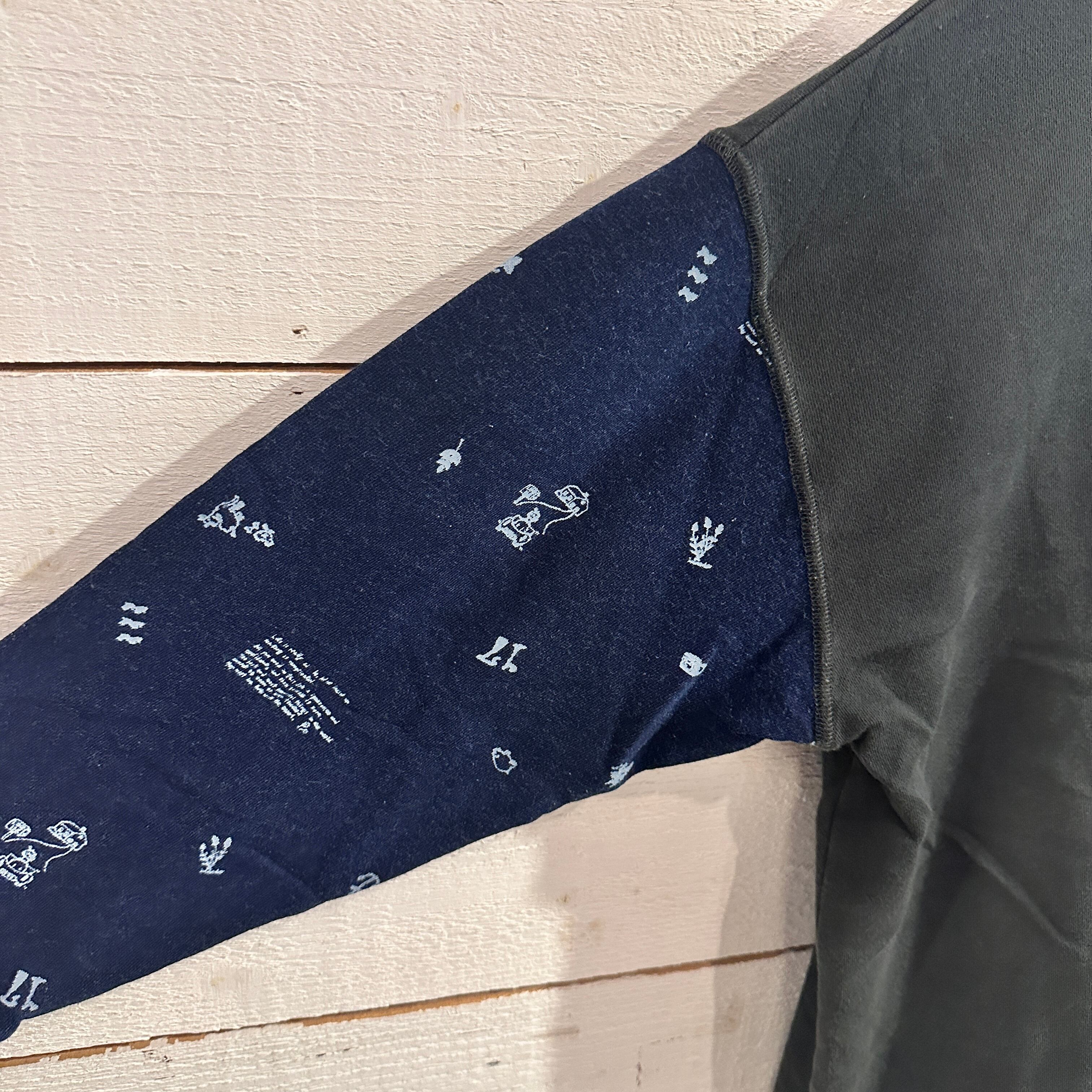 ゆるやかな肩落ちと長めの着丈で、リラックス感のある抜けたシルエットが特徴です。袖部分には牧場をモチーフにした総柄プリントをあしらい、遊び心と温もりを感じるデザインに。胸元の小さな刺繍ロゴがアクセントとなり、シンプルな中にもブランドらしい世界観を漂わせます。