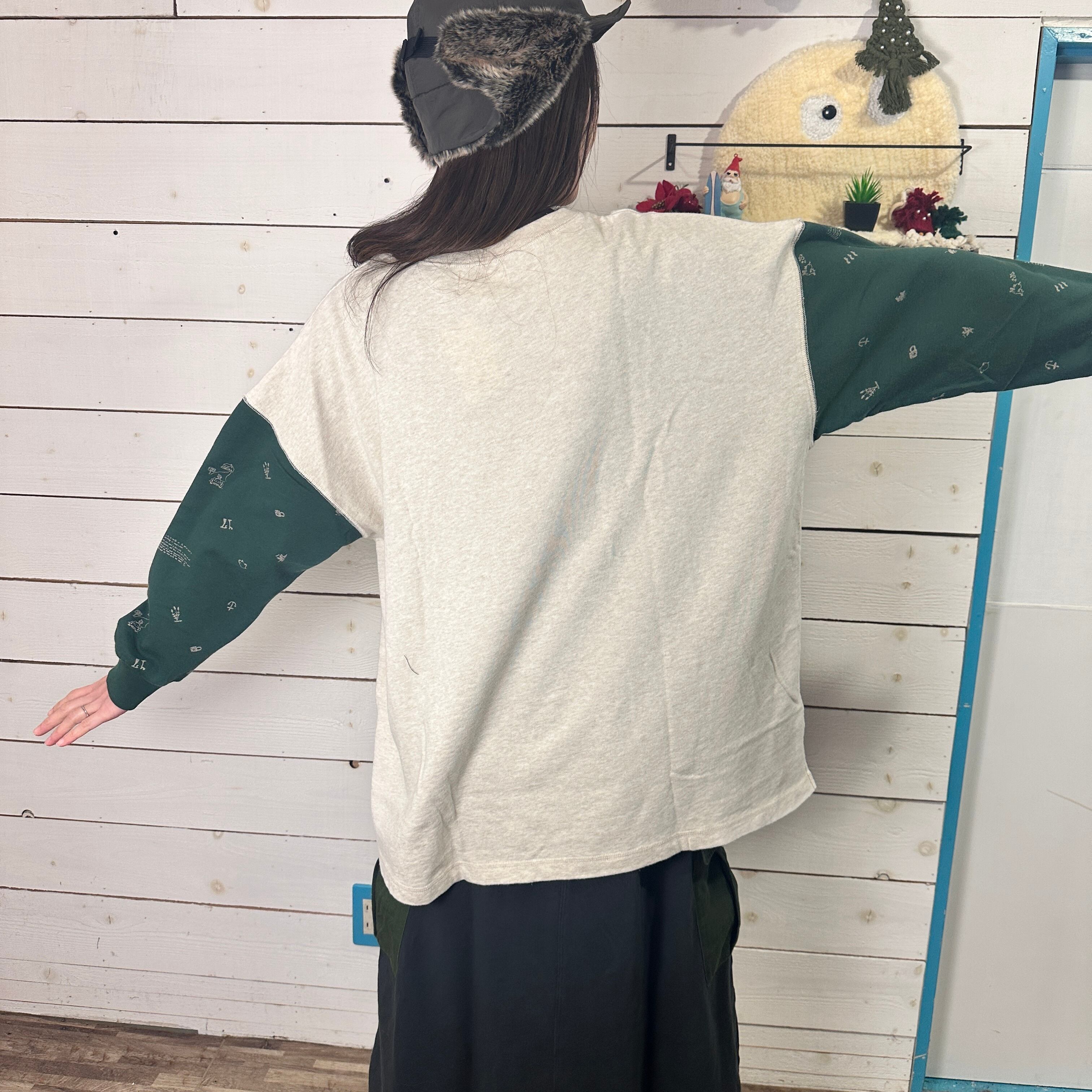 生地は裏側がループ状の柔らかなミニ裏毛。表面は程よく度詰めで、滑らかなタッチと自然なコシを両立しています。厚すぎず薄すぎず、季節の変わり目にも重宝する中肉素材。洗いをかけることで生まれるふっくらとした風合いと、綿糸ならではの通気性のよさがあり、長時間の着用でも肌あたりが優しいのが魅力です。袖の別布はさらりとした天竺素材で切り替えており、異素材のコントラストが軽やかな印象に仕上がっています。