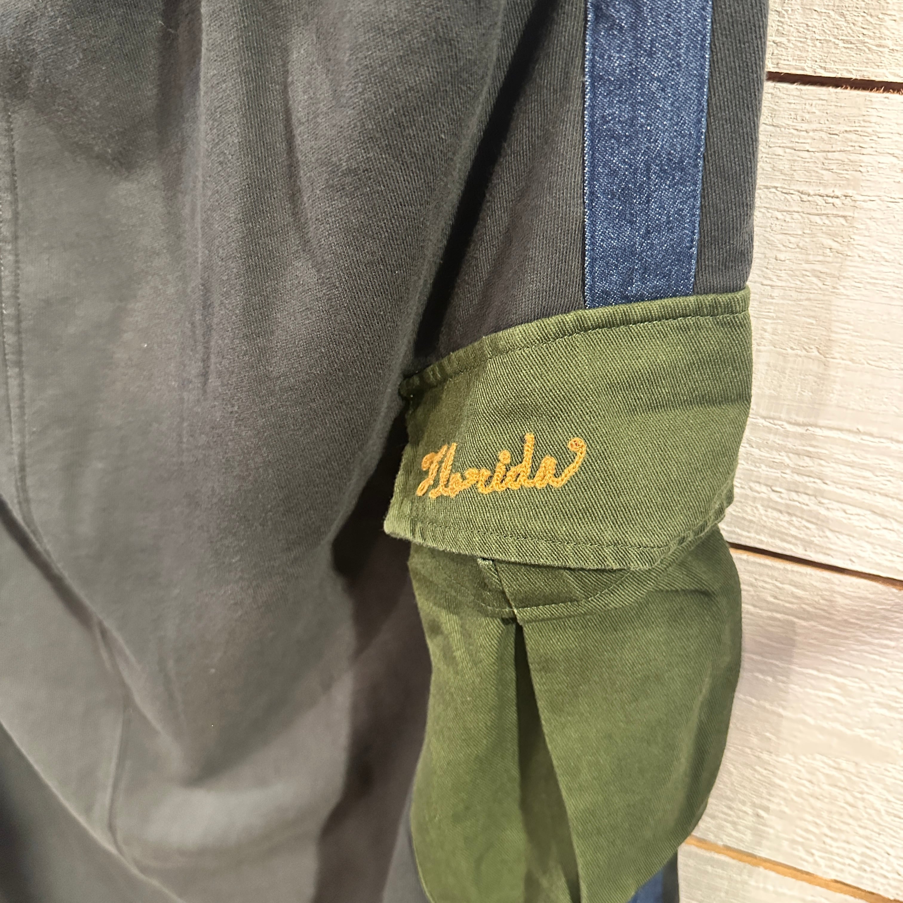 生地は260gのミニ裏毛スウェット素材。表面はしっかりと目が詰まりつつも、ほどよい柔らかさがあり、裏側はループ状のパイルでふっくらとした触り心地。空気を含んだような軽さがあり、長時間の着用でもストレスを感じにくいのが特徴です。中肉厚で保温性もあり、秋冬から春先までロングシーズン活躍。綿100%のナチュラルな風合いが素材の魅力を引き立てています。サイドのデニム生地はウォッシュ感のある風合いで、スウェット素材との異素材バランスが奥行きを添えてくれます。