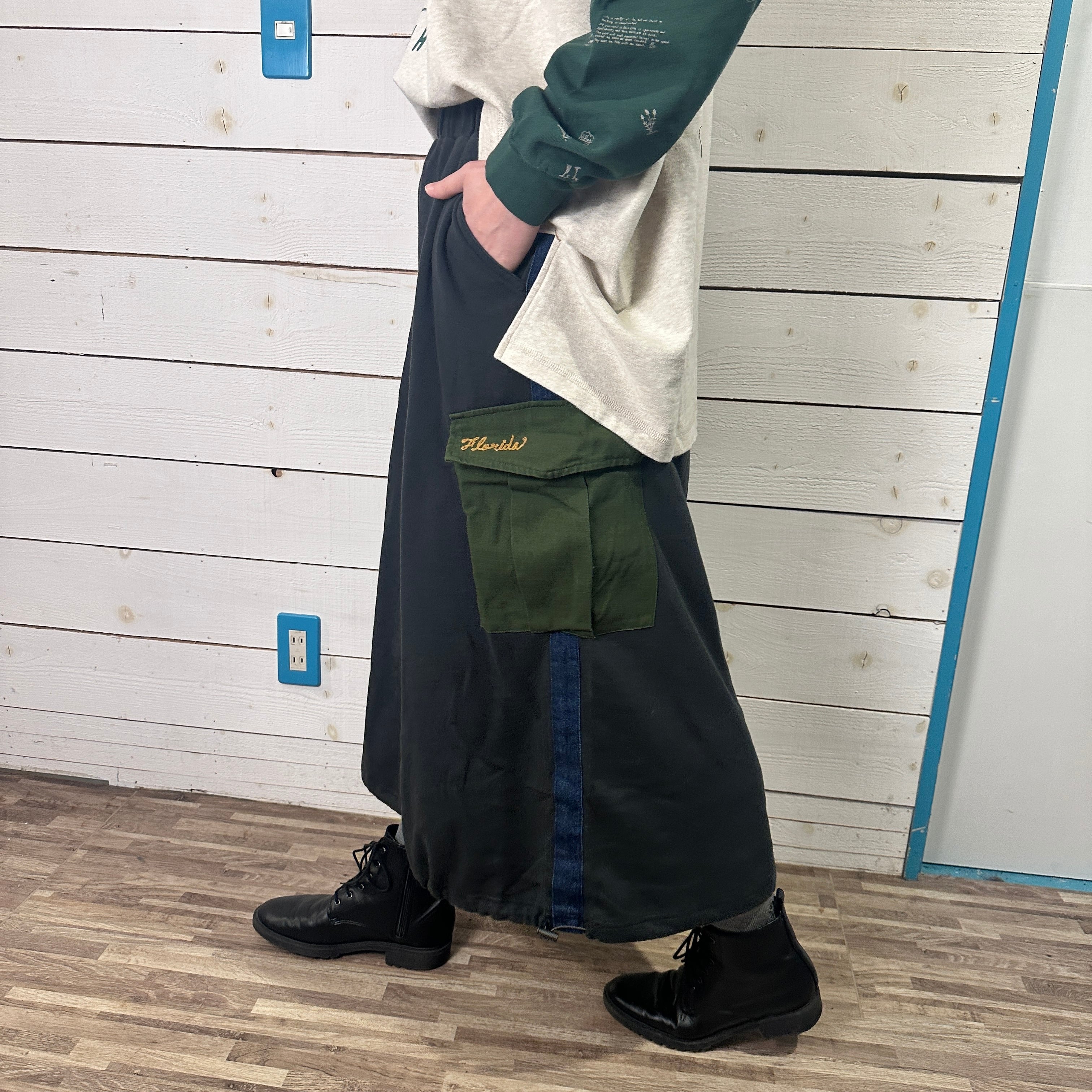 サイドに施したデニム切替えと立体的なカーゴポケットがアクセントになり、カジュアルながらも雰囲気のある一本です。裾にはドローコードを配し、シルエットの調整ができるため、その日の気分でボリューム感を変えられるのも魅力。