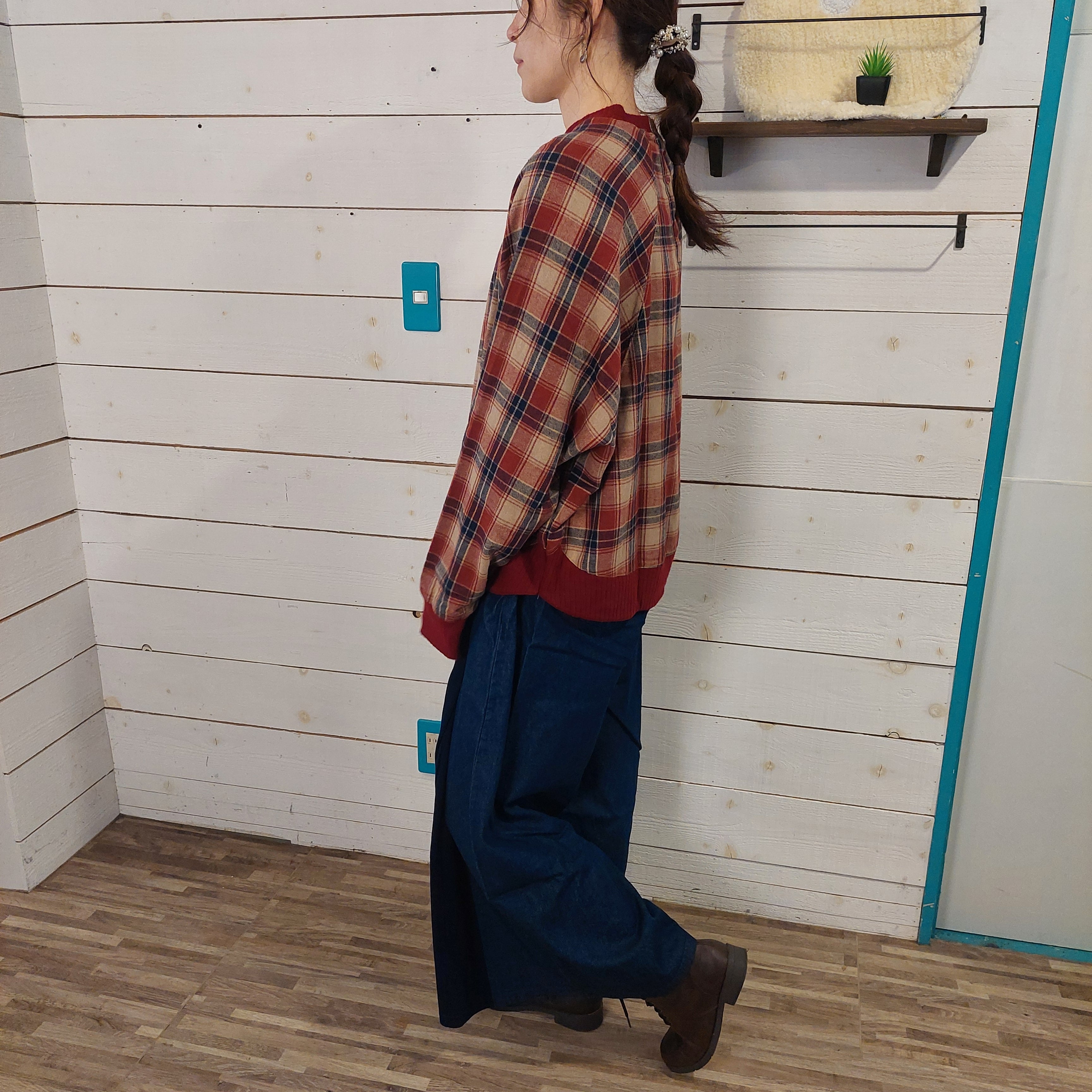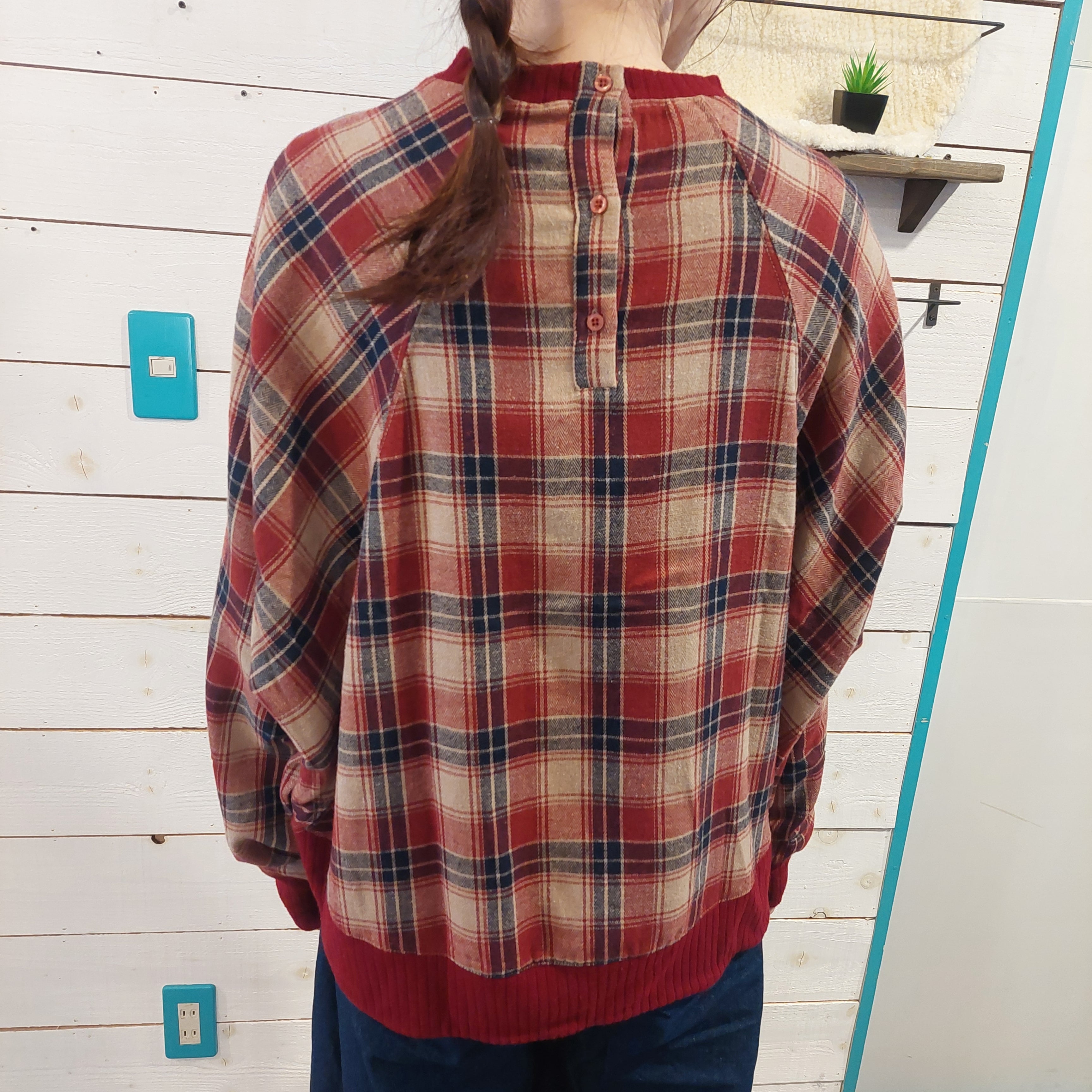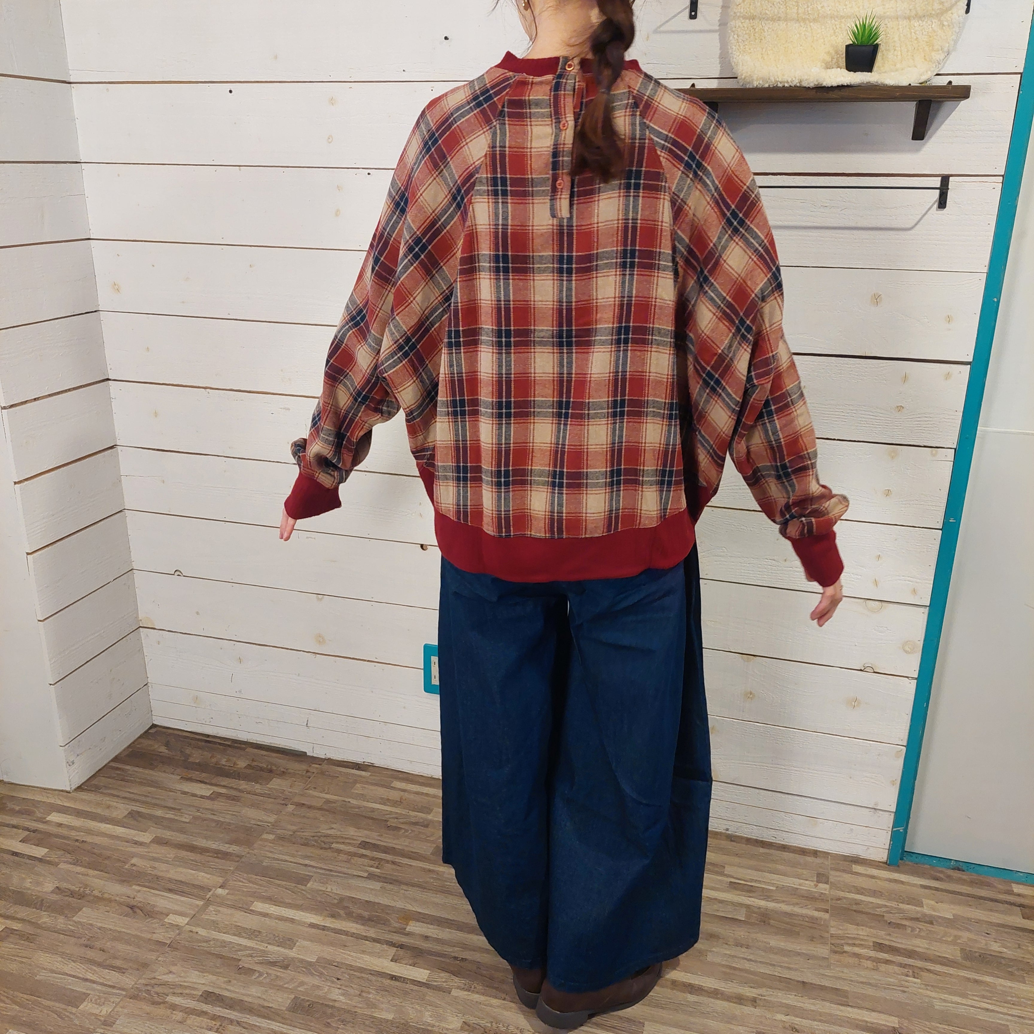 やわらかな起毛感が心地よく、冬の装いに自然な温もりを添えるチェック柄ドルマンプルオーバー。