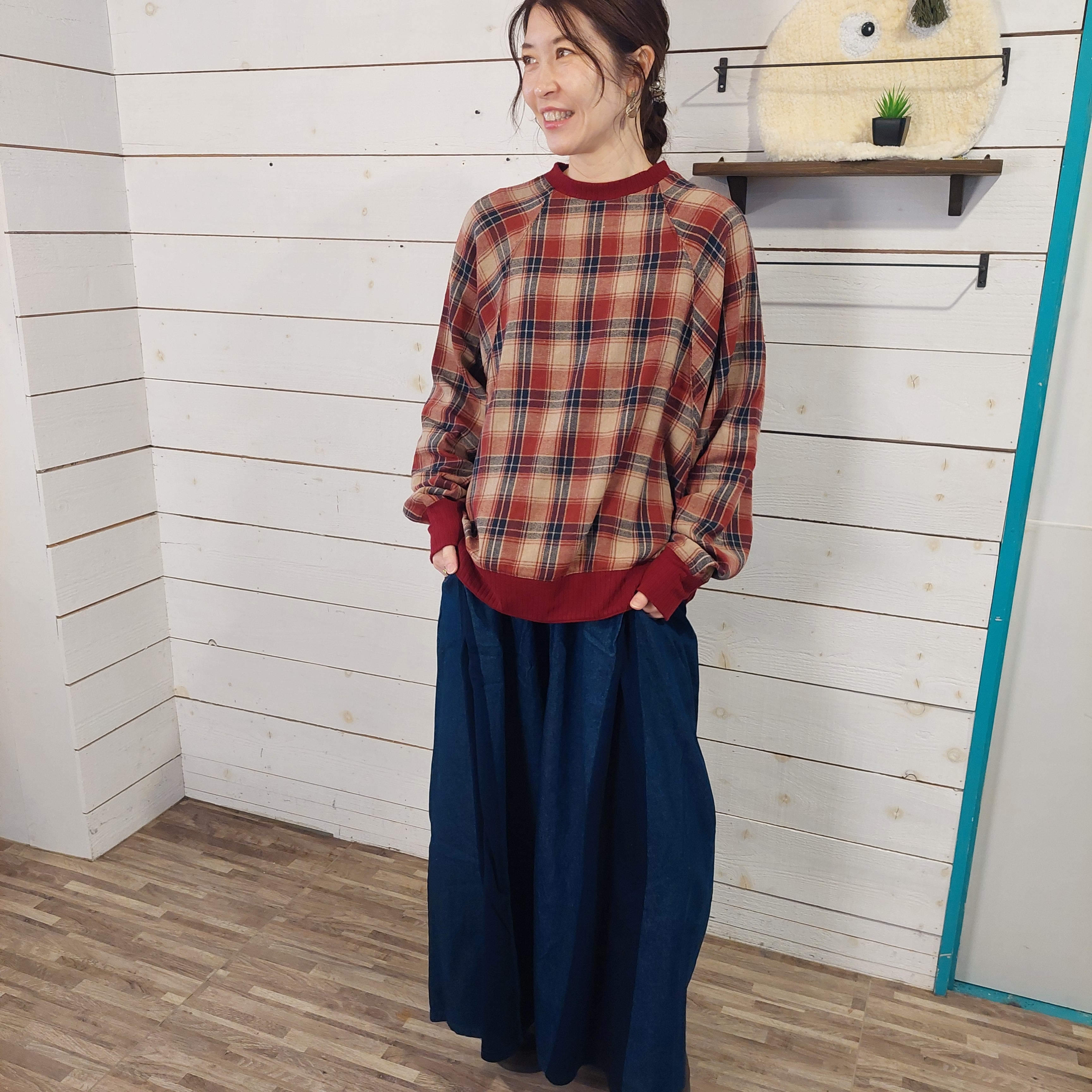 デニムスカートやワイドパンツを合わせたカジュアルな冬コーデはもちろん、コーデュロイ素材のボトムやプリーツスカートとも相性抜群。足元はスニーカーでラフに、ブーツで季節感を添えるのもおすすめ。アウターの中に着てもごわつきにくいので、冬のインナートップスとしても重宝します。