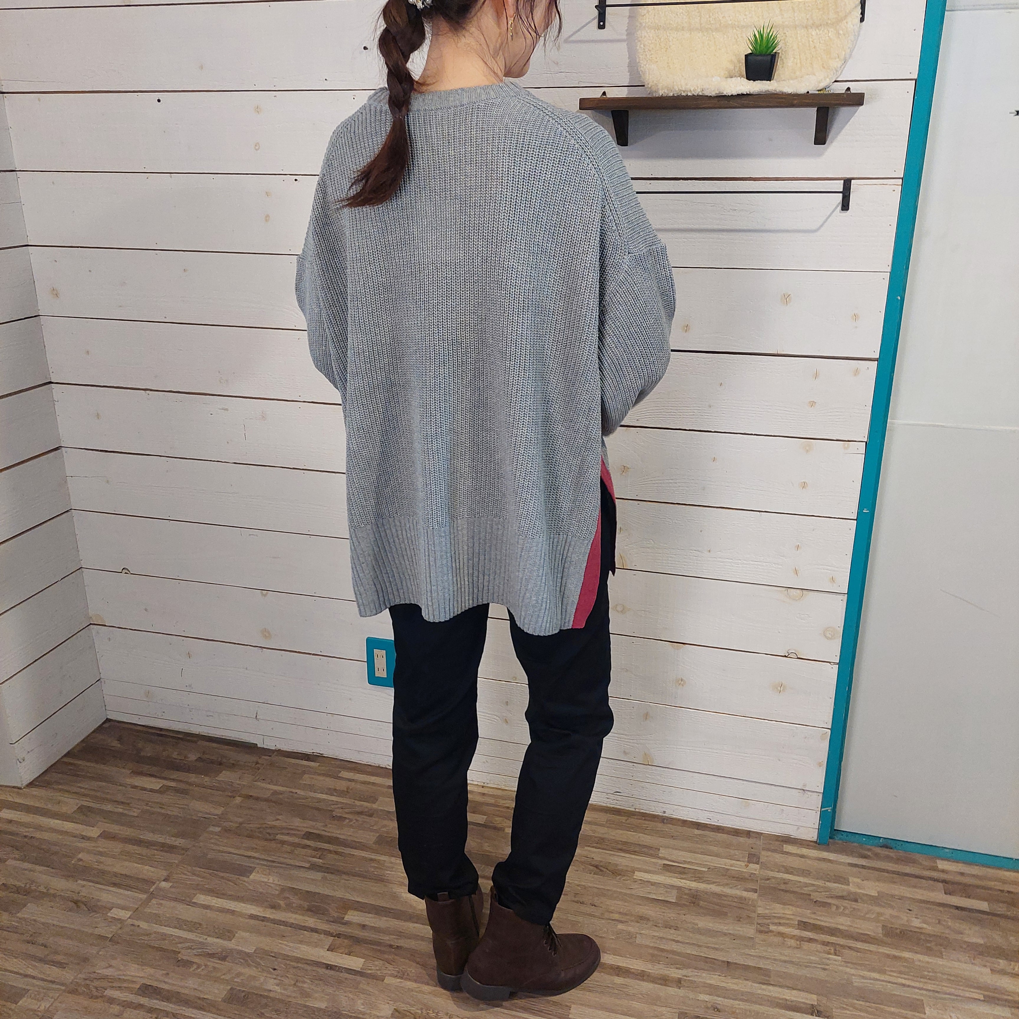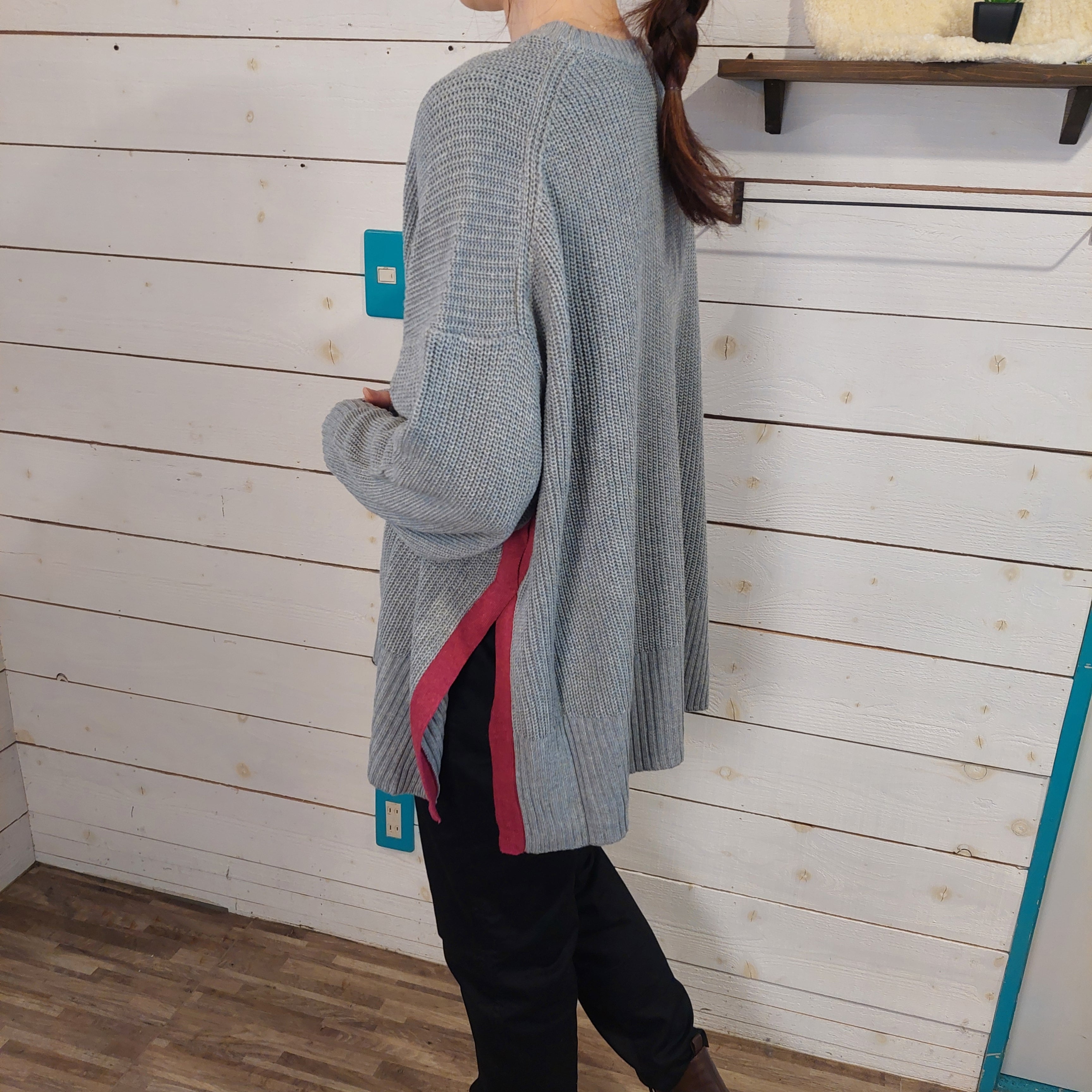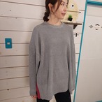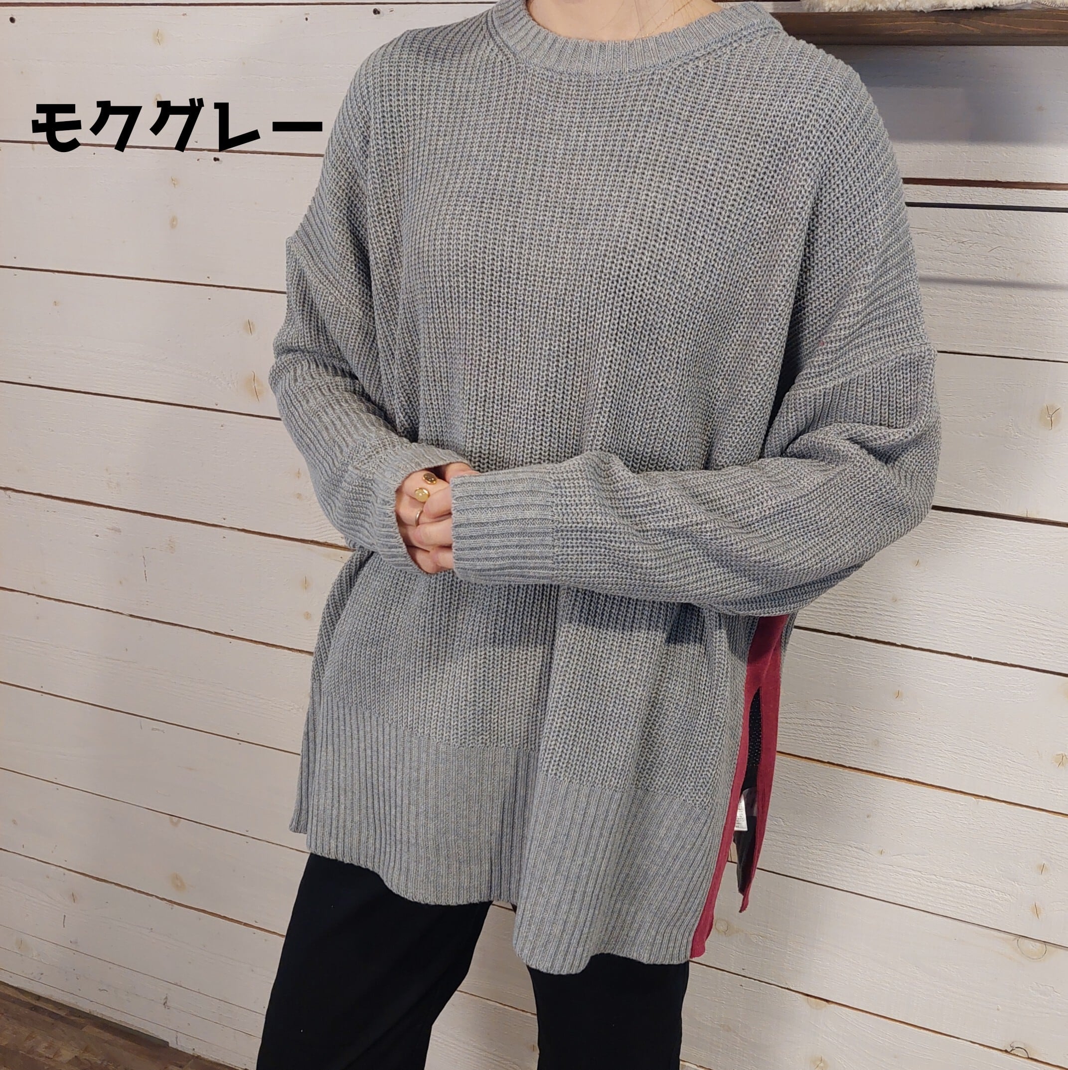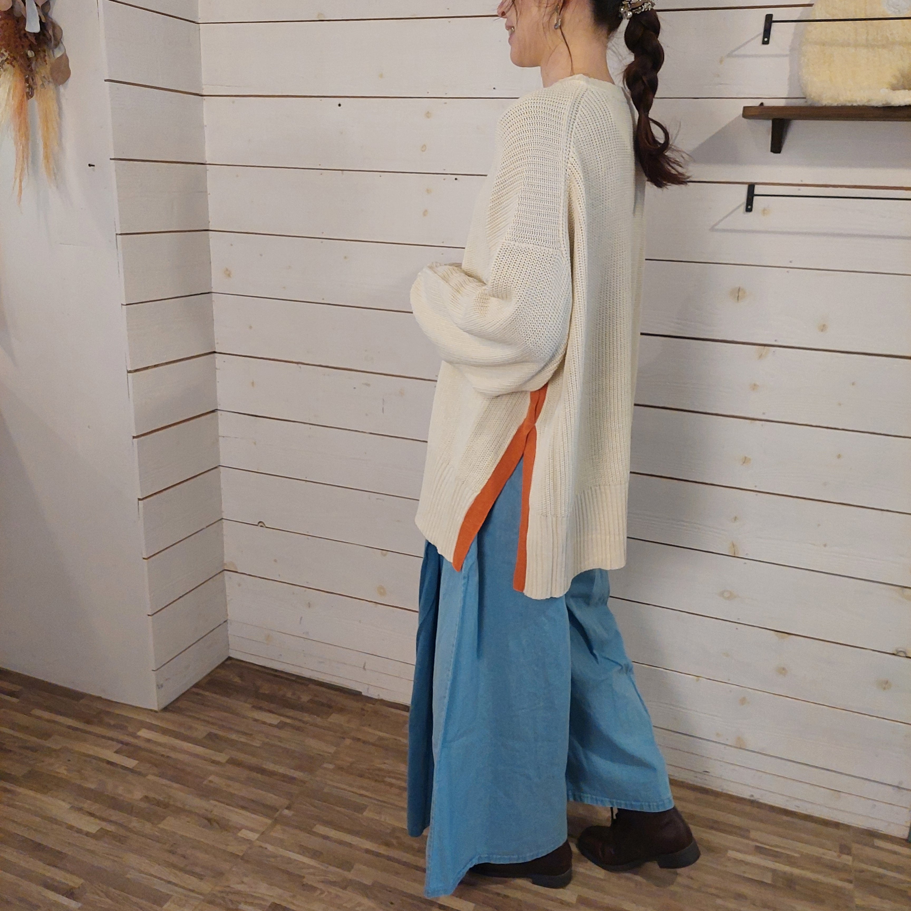 両サイドには深めのスリットを入れ、内側に覗く配色パネルがコーディネートのアクセントに。動くたびにちらりとのぞく色が、無地ニットの単調さをほどよく和らげ、日常のスタイリングに遊び心を添えてくれます。サイドの縦ラインが生まれることで、ゆったりとしたシルエットでも重たく見えず、腰まわりに自然な抜け感をつくり出すのもポイント。