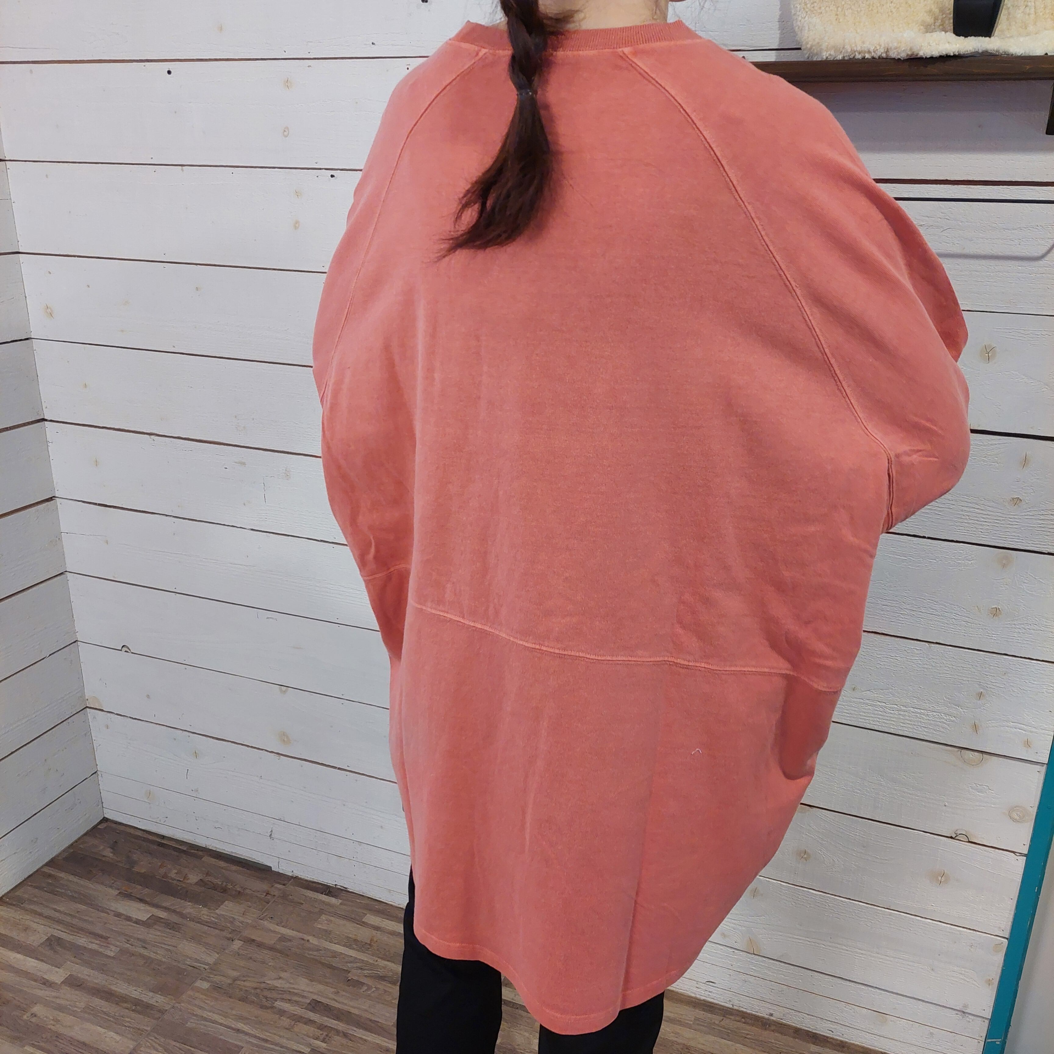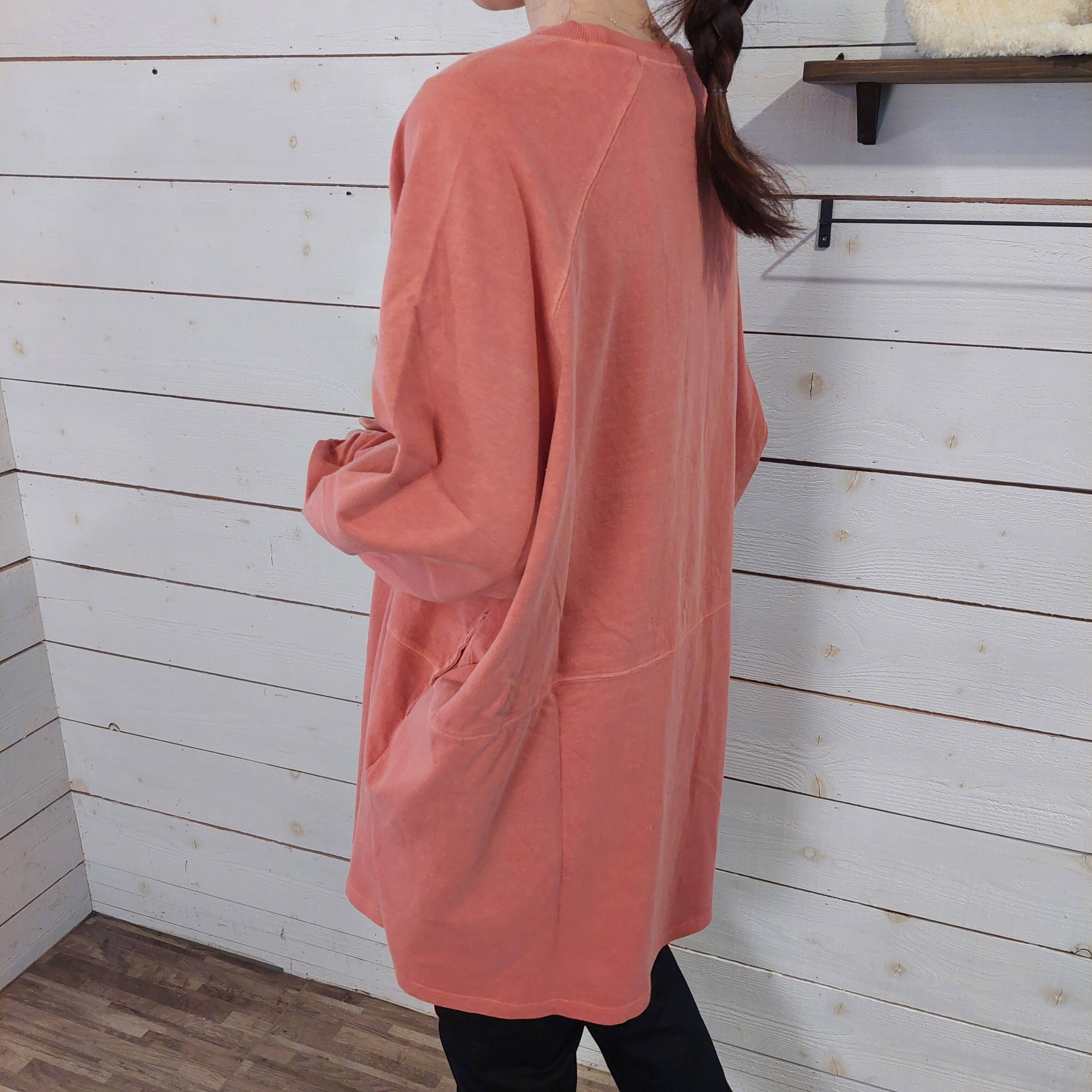 全体にゆとりを持たせたチュニック丈で、気になる腰回りをカバーしつつも動きやすさを確保。