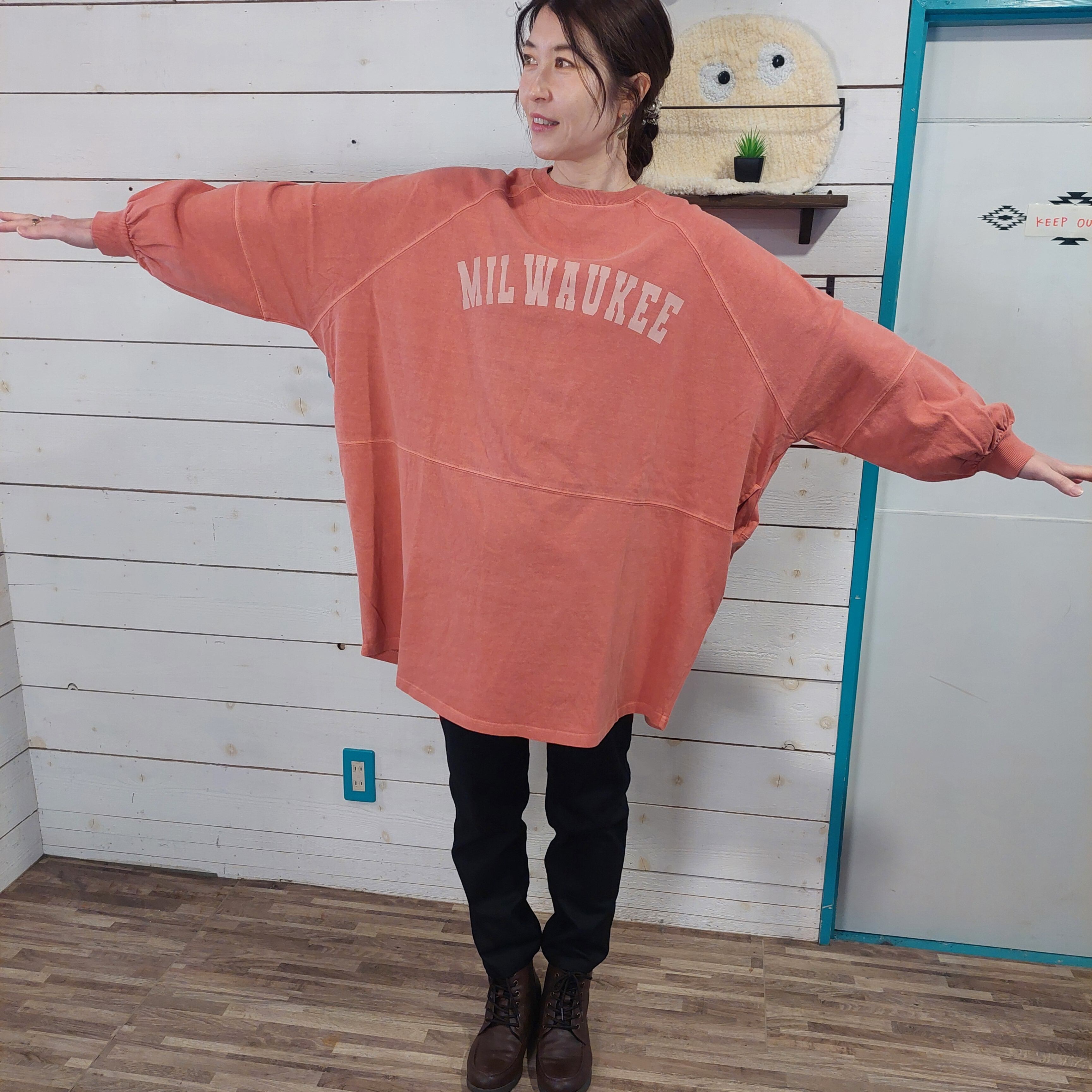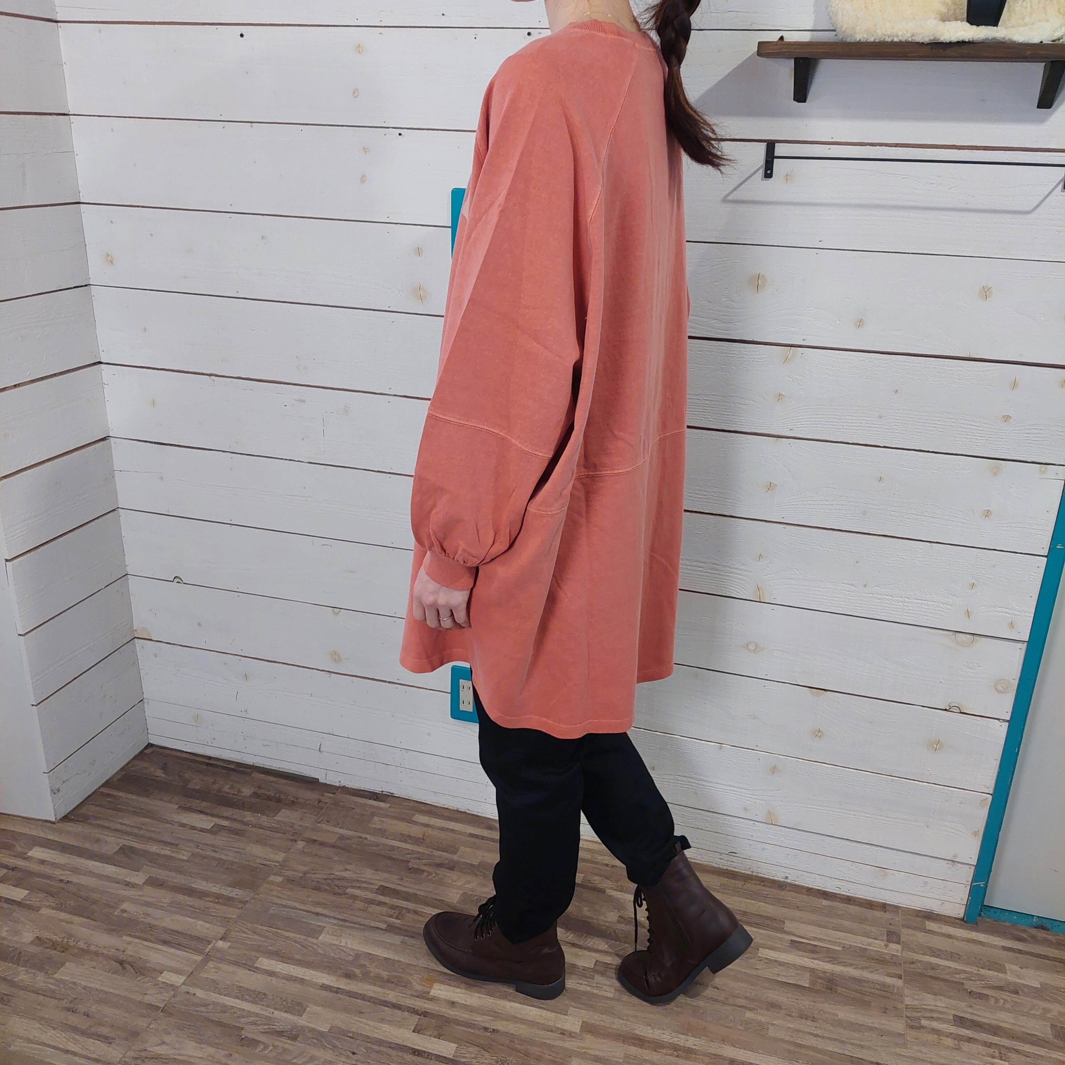 レギンスやスウェットパンツと合わせてラフなリラックススタイルにもマッチします。