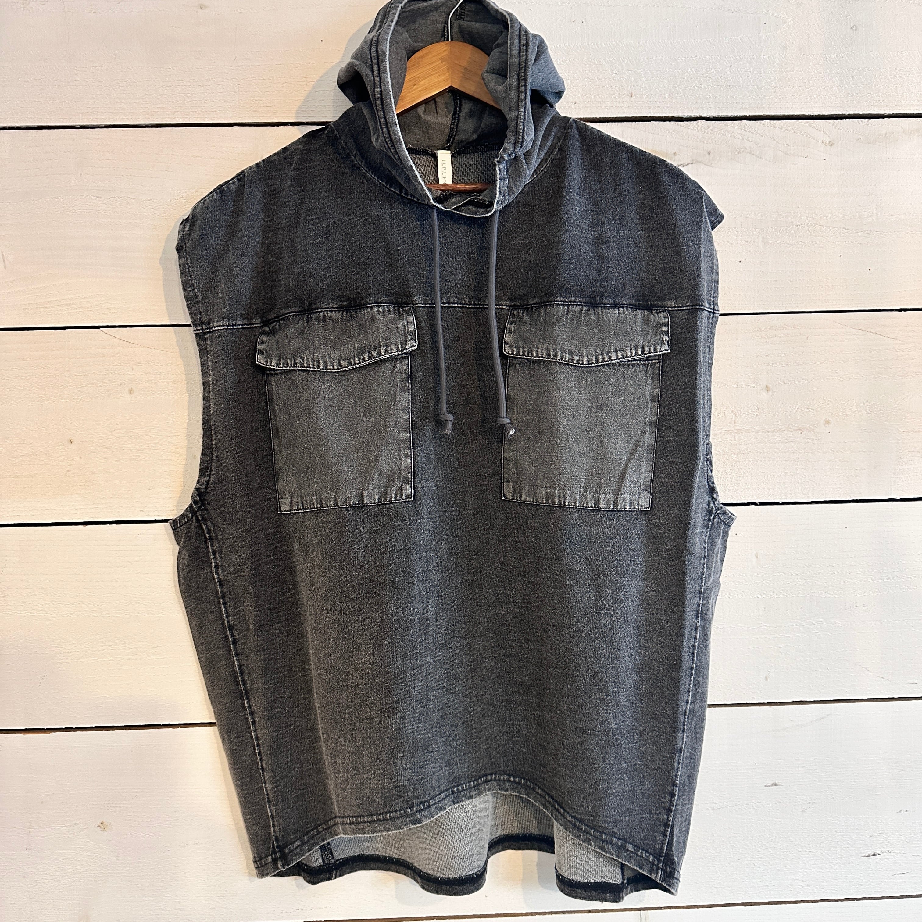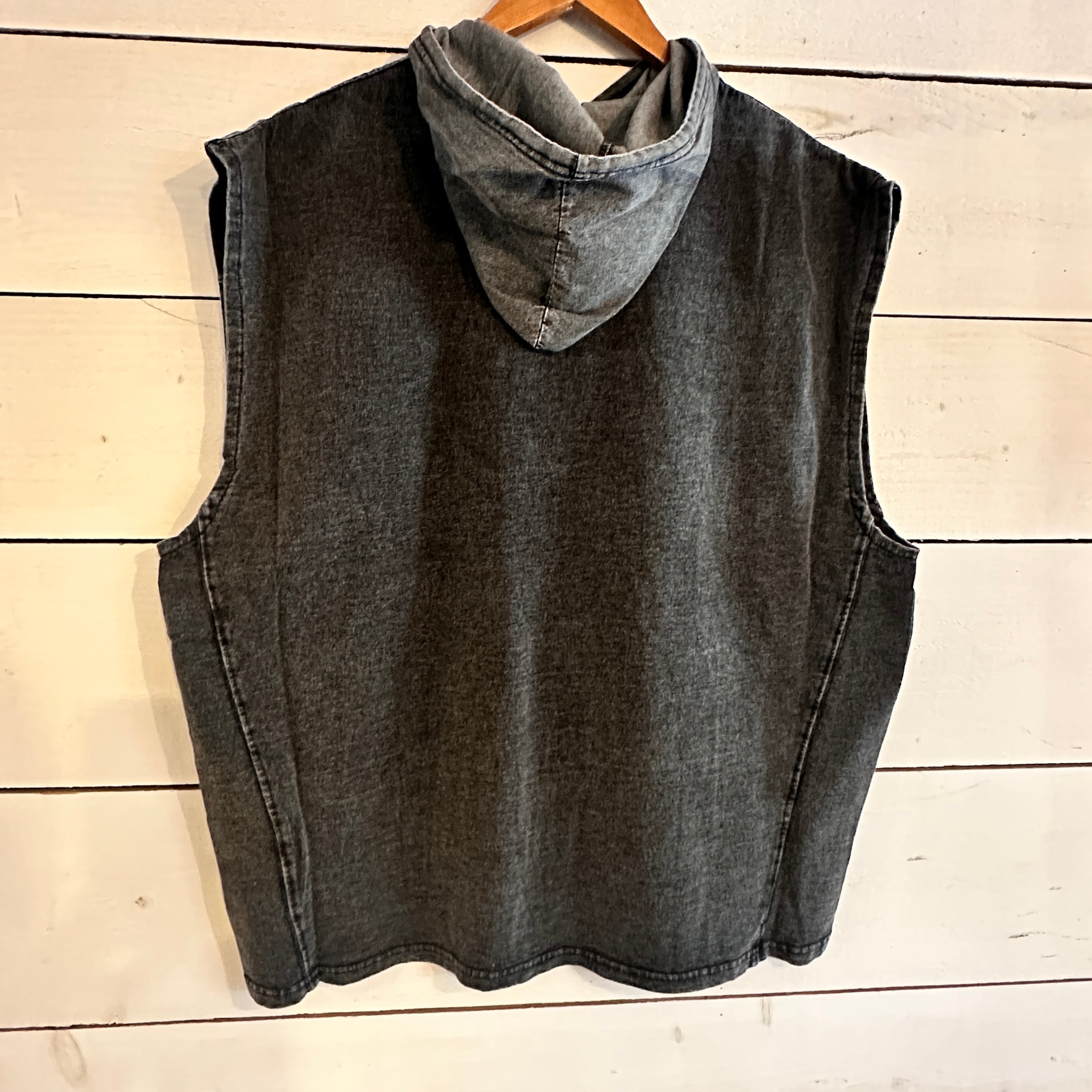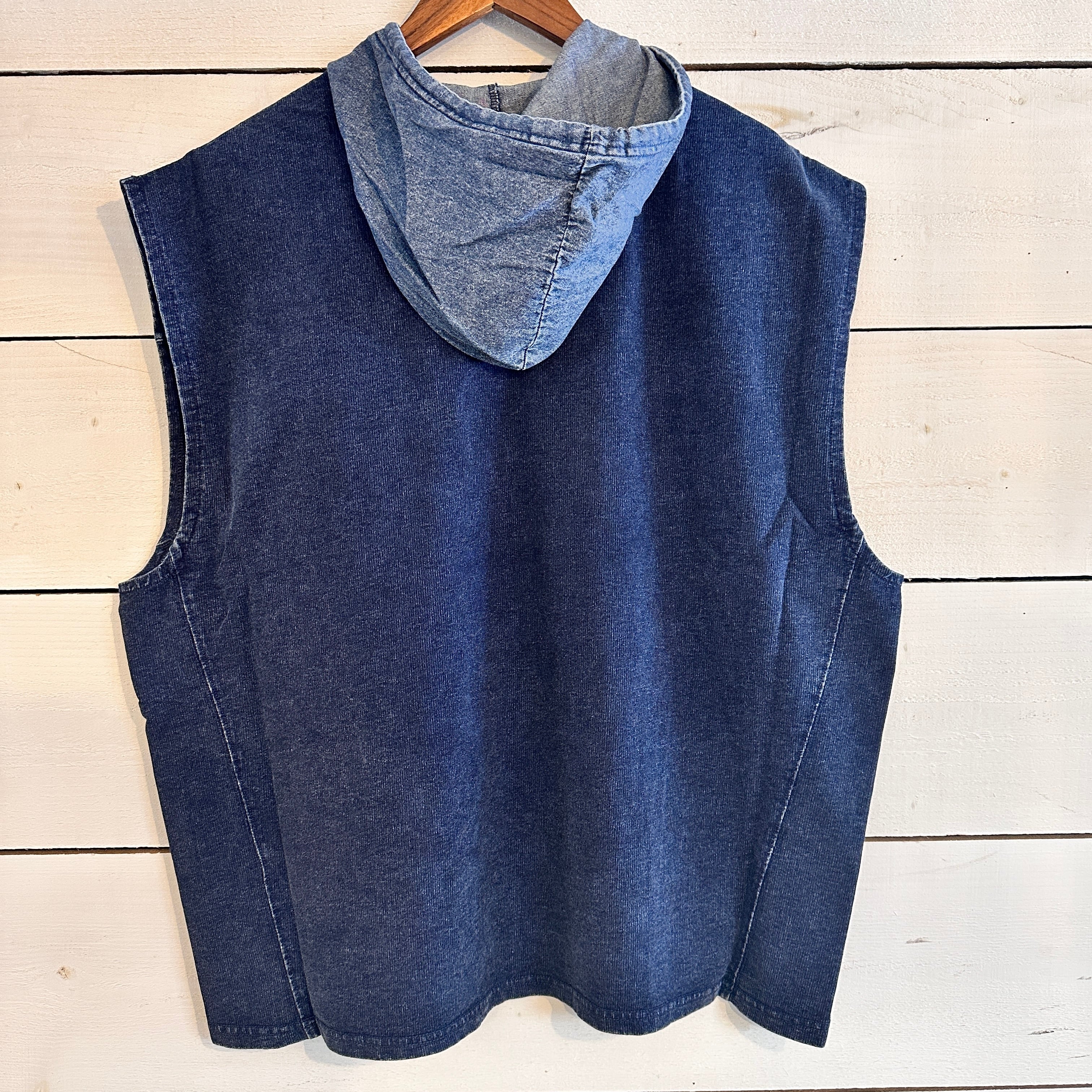 インディゴ染めの250g裏毛と、6ozのケミカルデニムを切り替えた、ナチュラルな存在感を放つフード付きベスト。表地には肉厚すぎず軽やかな裏毛素材を使用し、内側はふっくらとした起毛感で肌あたりもソフト。ふだん使いにちょうどよい厚みで、ロンTやスウェットの上から気軽に重ねられる万能な一枚です。コントラストの効いたケミカルデニムのフラップポケットとフードが、全体にメリハリを加え、カジュアルな中にもさりげない個性を添えています。