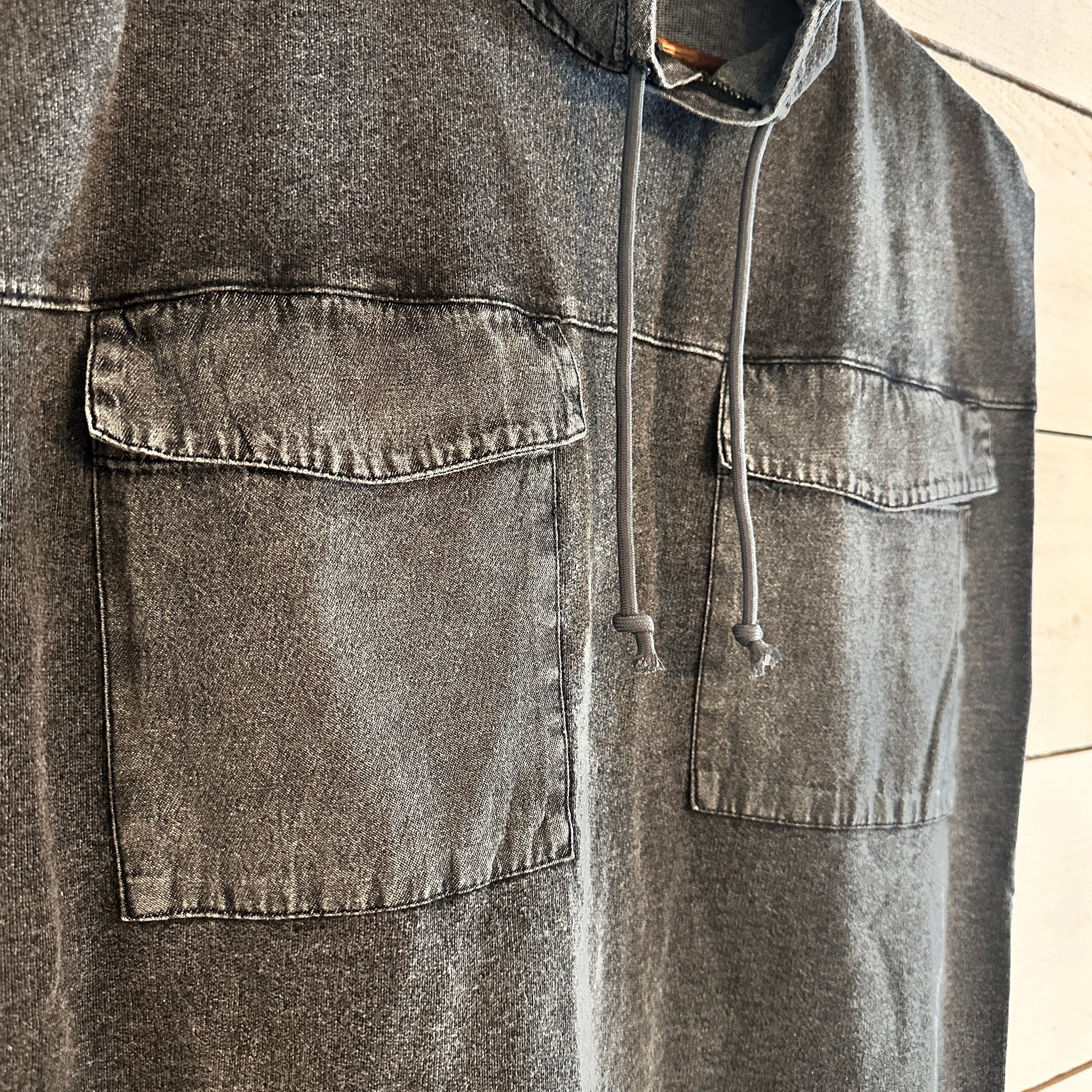 肩を落としたリラックス感のあるシルエットに、程よくラウンドした裾ラインが絶妙な抜け感を演出。ボックス型の身幅で、中に着込んでもごわつかず、寒暖差のある季節の温度調整にも最適。両胸に配置された立体的なフラップポケットは、デザイン性はもちろん、機能面でもアクセントに。フードは裏面にもケミカルデニムを使用し、視覚的な奥行きを与える立体的な仕上がり。ディテールの細やかさが際立ち、シンプルながらもこだわりを感じる一着です。