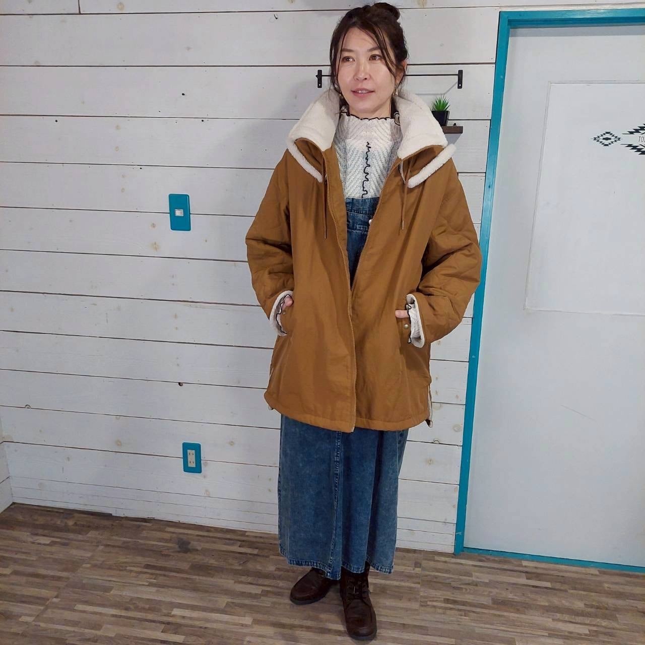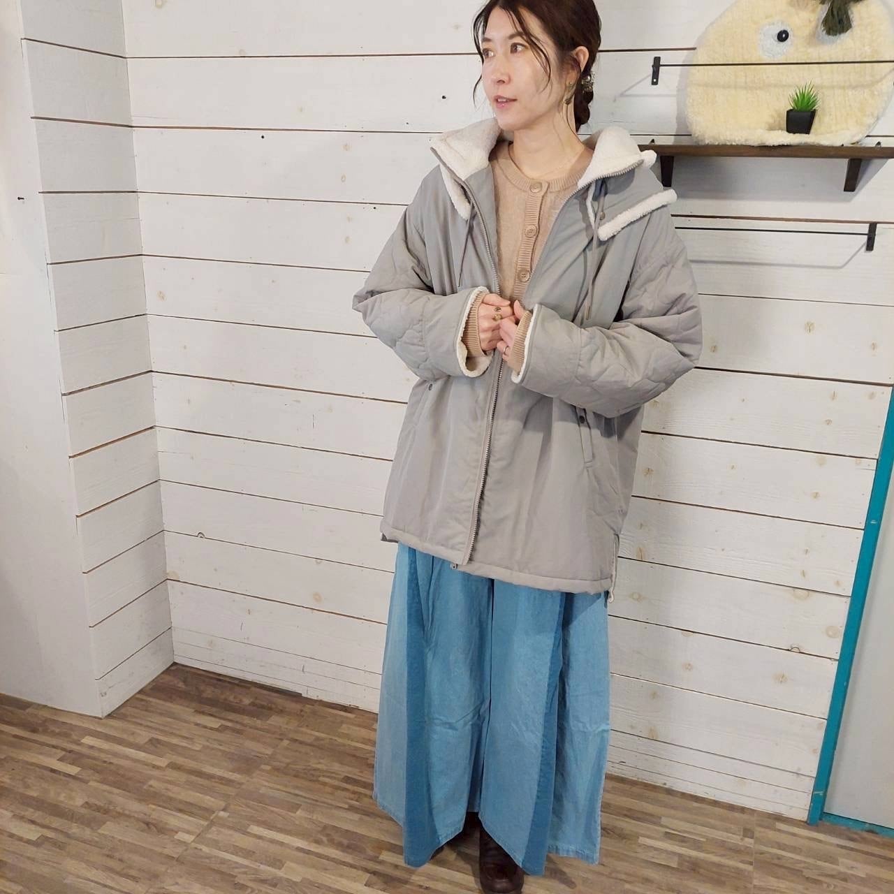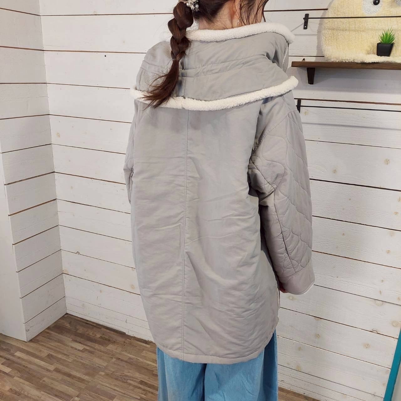 このコートは、セーラーカラーのハイネックデザインが特徴で、首元は心地よいボア仕様に仕上げられています。袖を折り返すとボアが覗き、暖かさを保ちながら、スタイリッシュな印象を与えます。ナイロンキルティング素材を使用しており、中綿も入っているため、寒い季節でも快適に着用いただけます。また、ダブルネックのデザインが首元をしっかりと包み込み、温かさを逃しません。シンプルながらもおしゃれさを感じさせるアイテムで、デイリーコーデにもぴったりです。