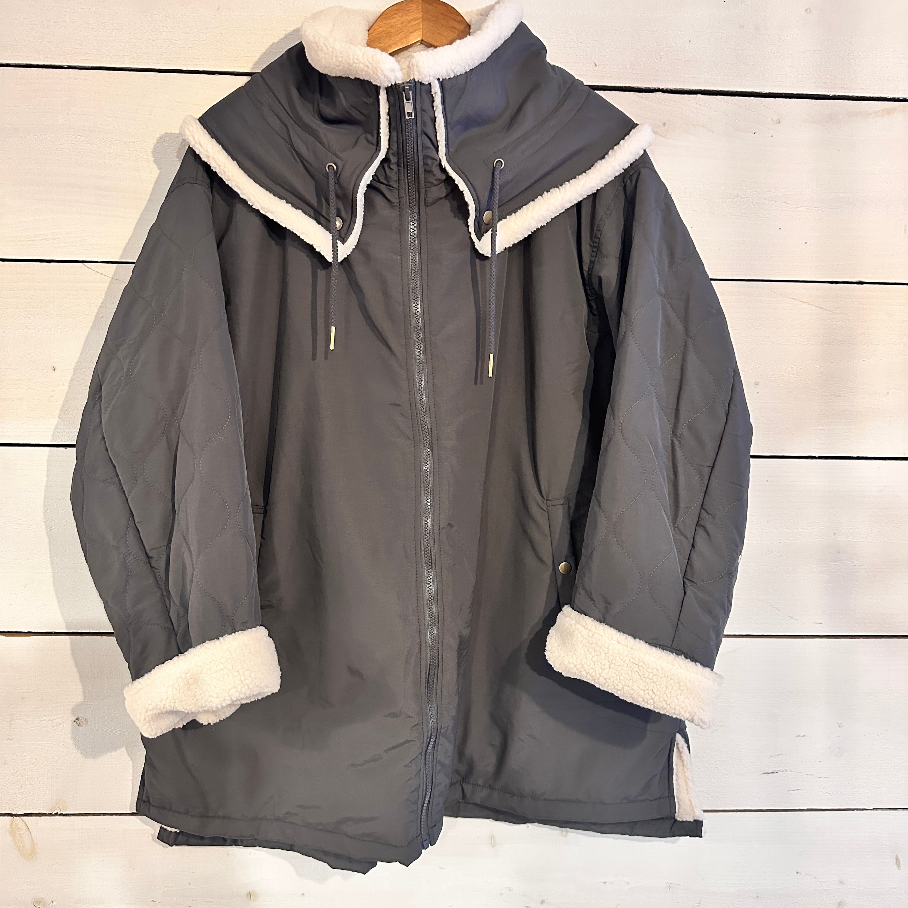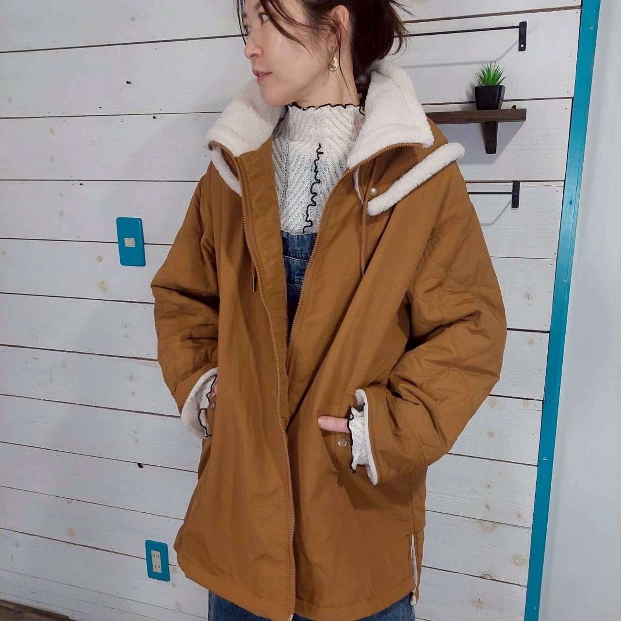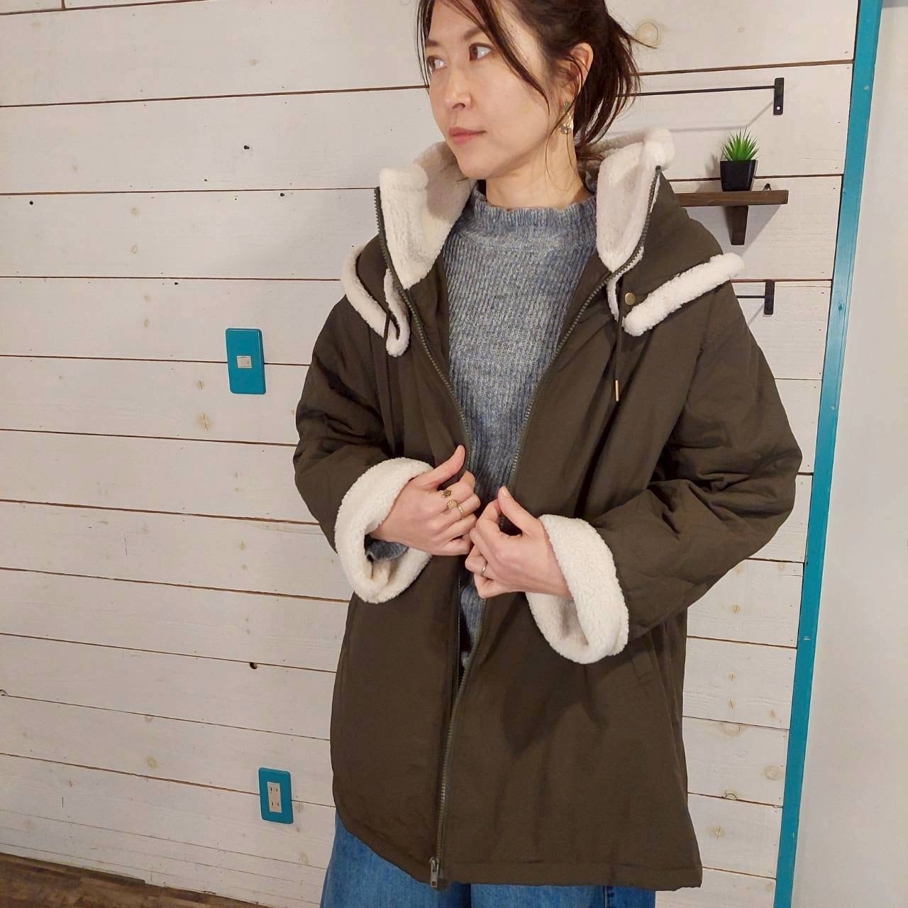 このコートは、セーラーカラーのハイネックデザインが特徴で、首元は心地よいボア仕様に仕上げられています。袖を折り返すとボアが覗き、暖かさを保ちながら、スタイリッシュな印象を与えます。ナイロンキルティング素材を使用しており、中綿も入っているため、寒い季節でも快適に着用いただけます。また、ダブルネックのデザインが首元をしっかりと包み込み、温かさを逃しません。シンプルながらもおしゃれさを感じさせるアイテムで、デイリーコーデにもぴったりです。