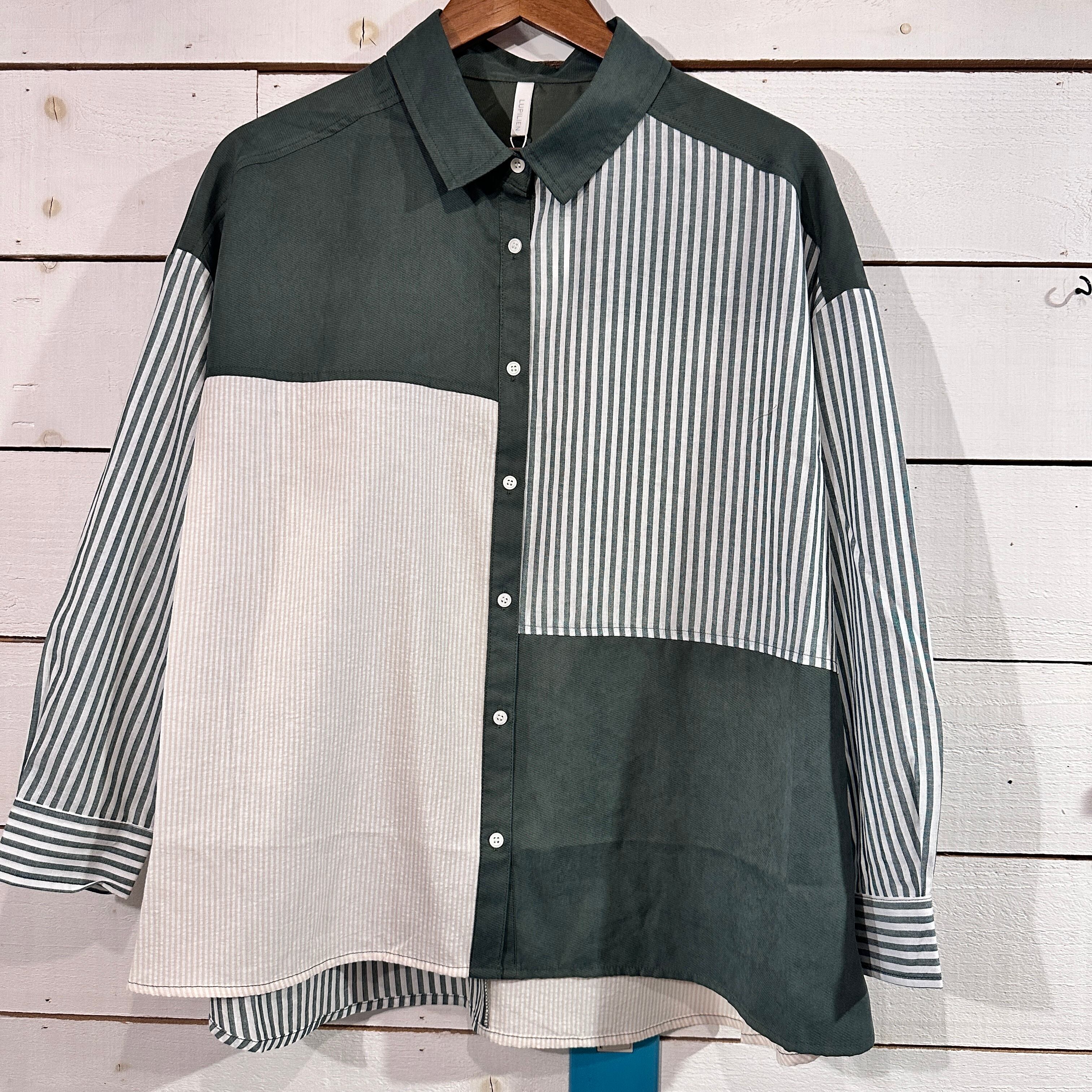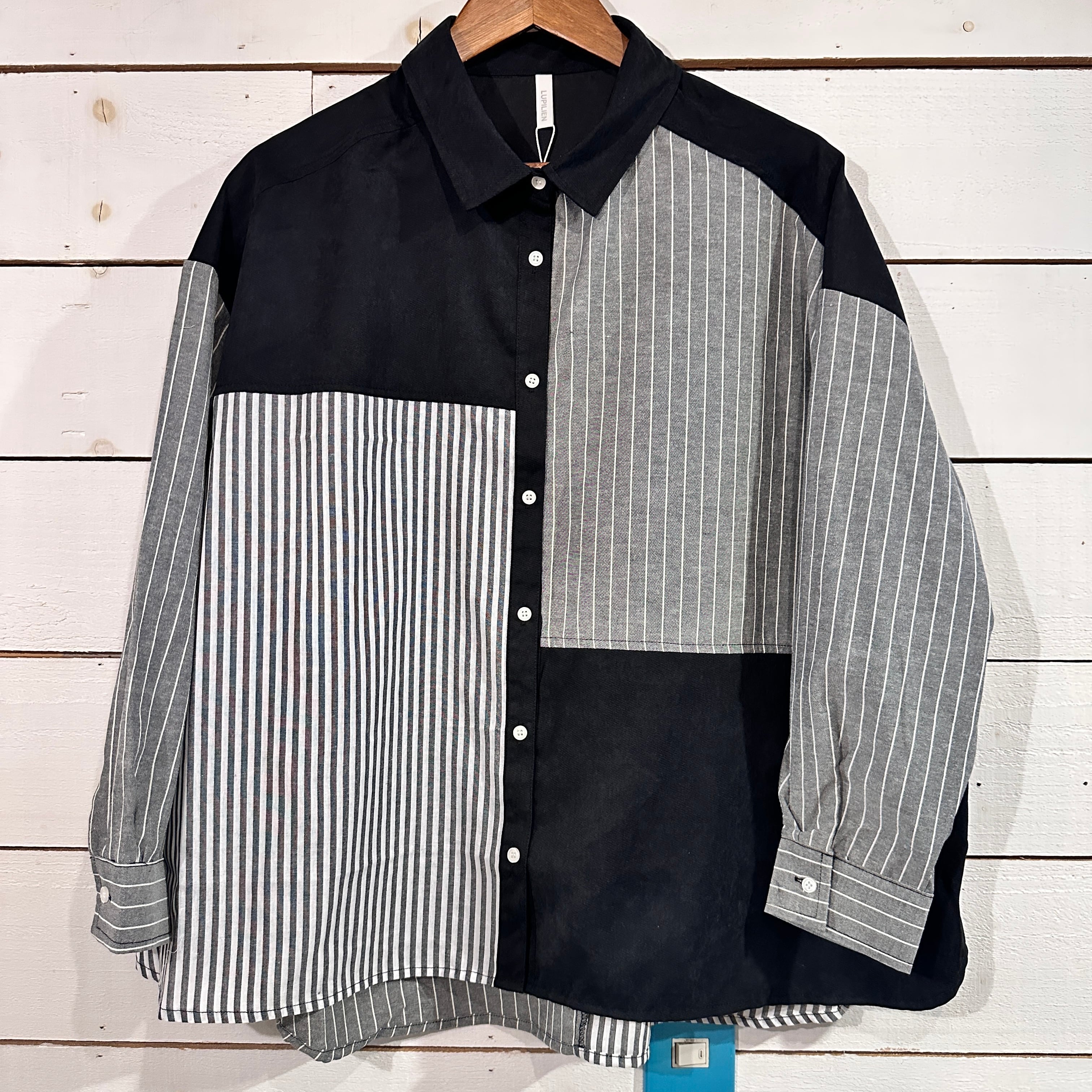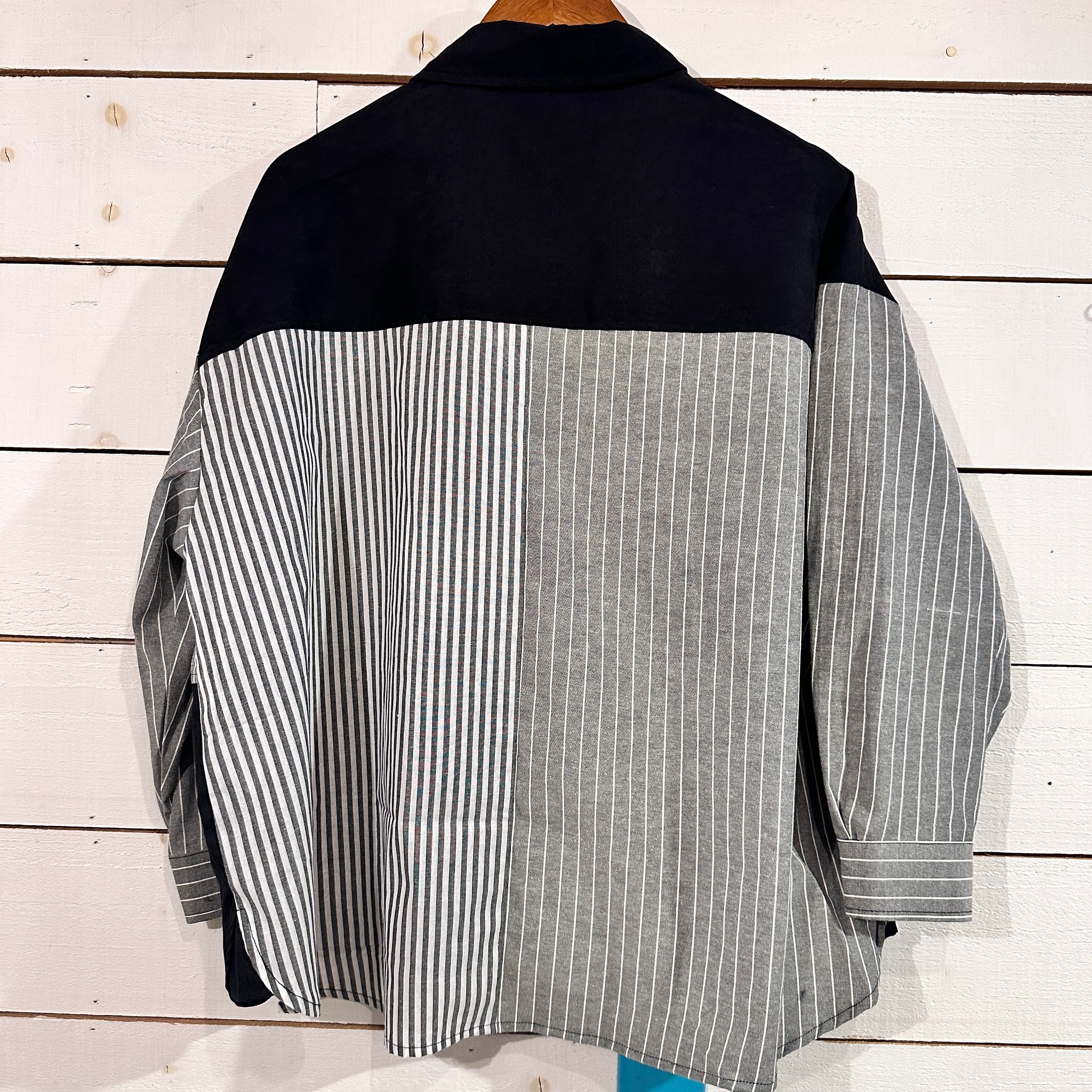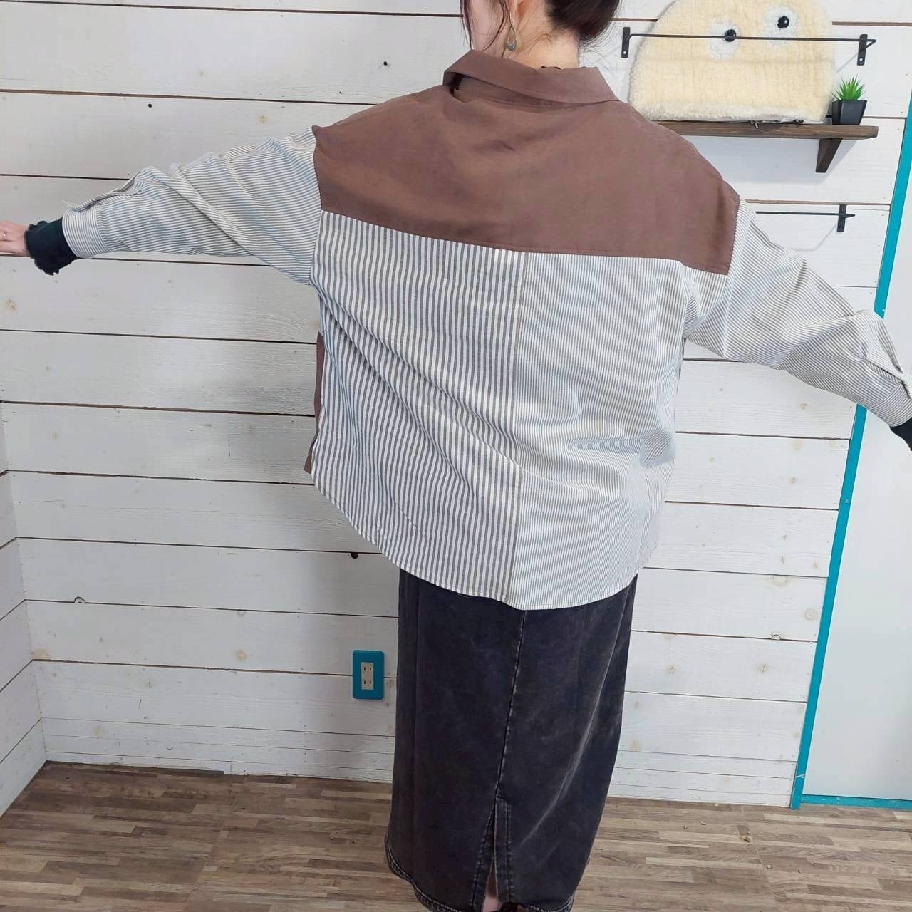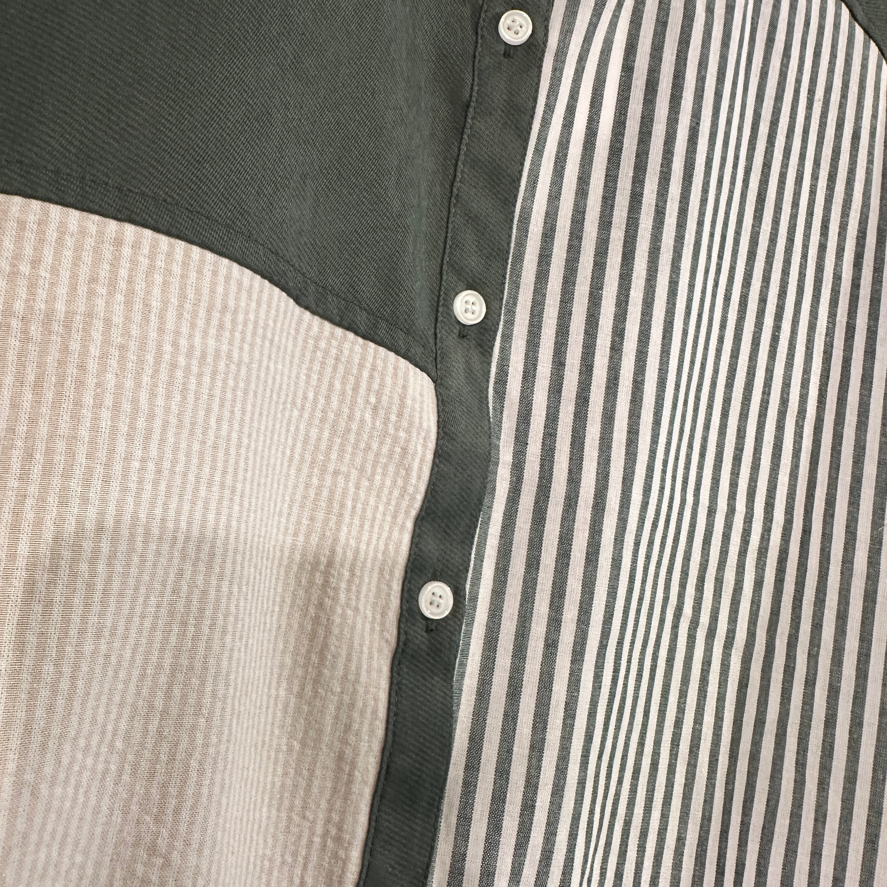 こだわりのある素材を使用した、MIXストライプ切替シャツです。このシャツは、太ピッチのストライプと細ピッチのストライプ、無地がドッキングした切替デザインが特徴で、スタイリッシュなコーディネートを楽しむことができます。