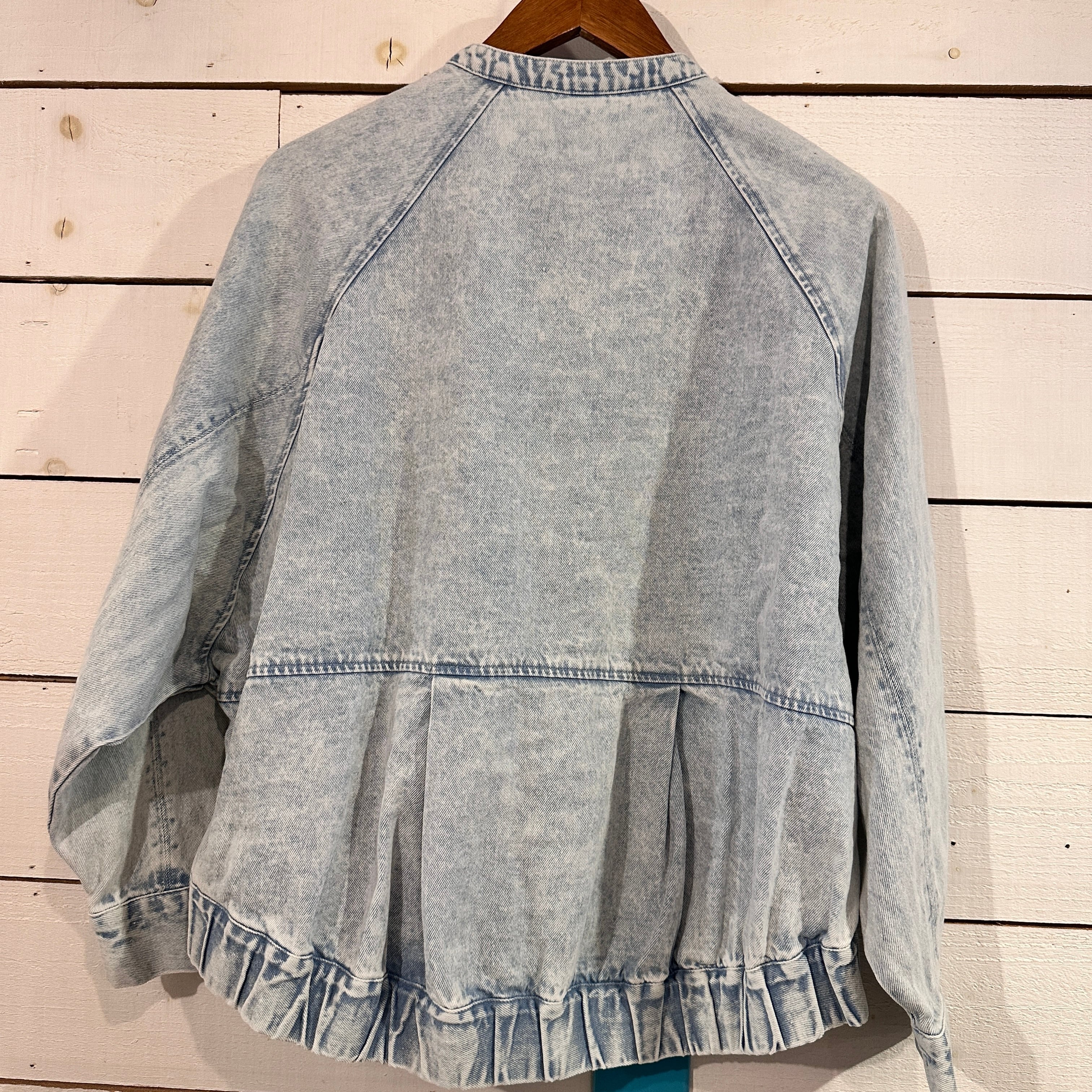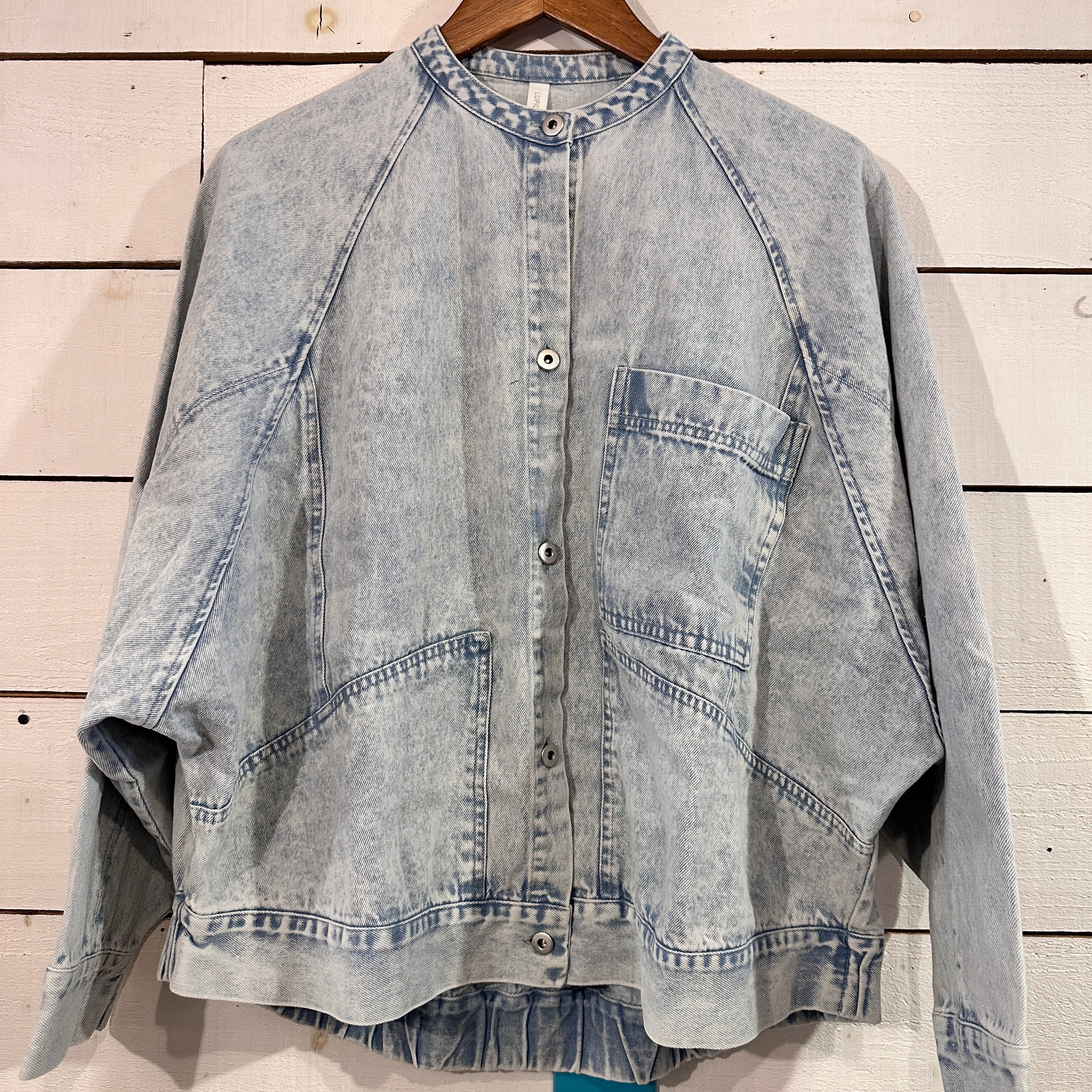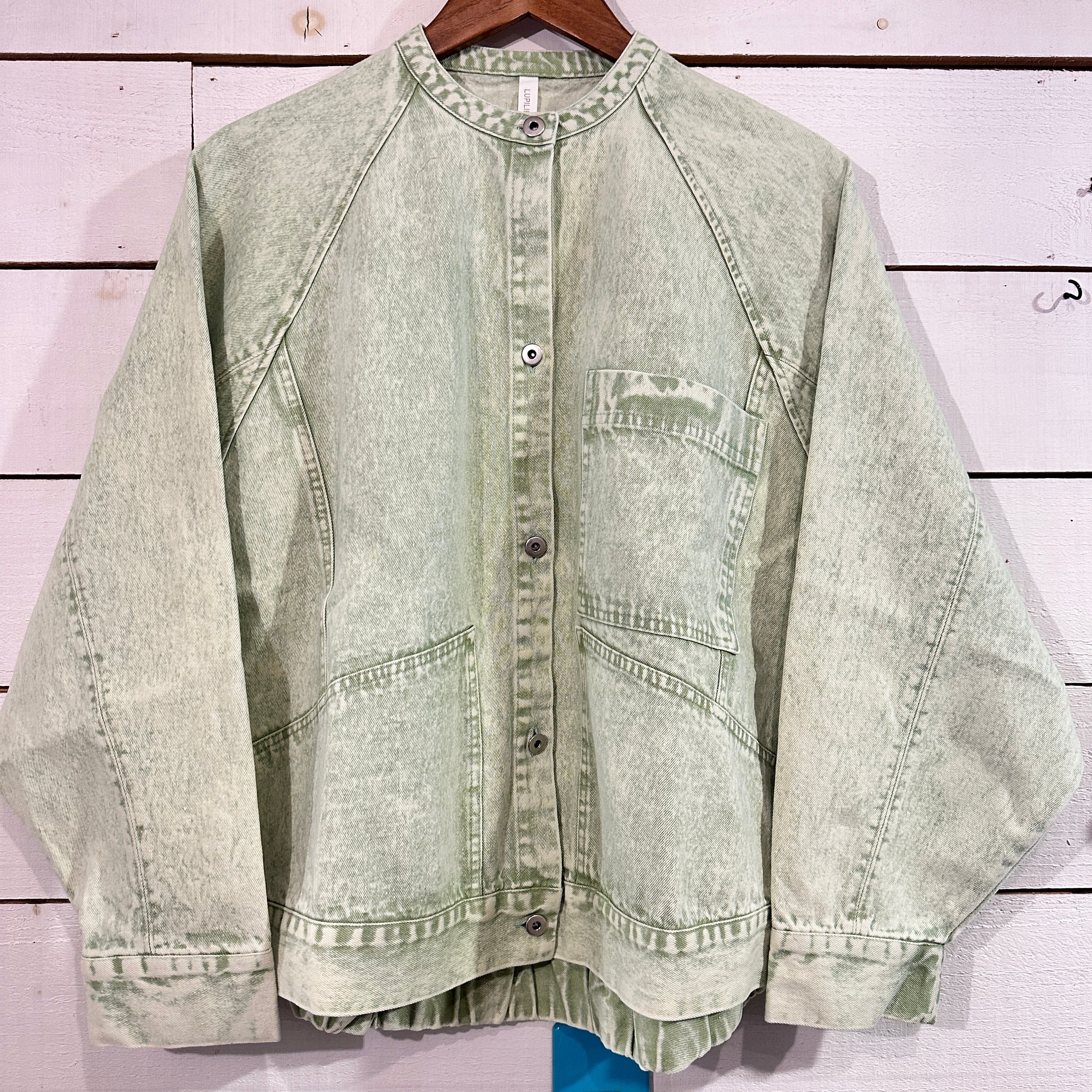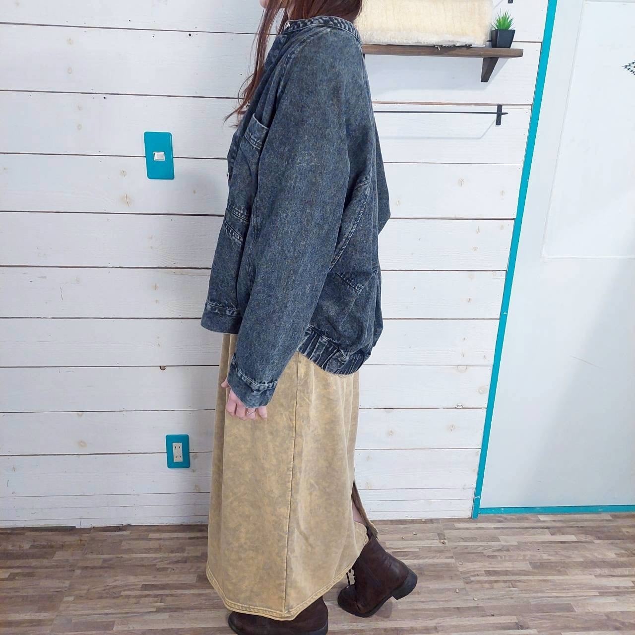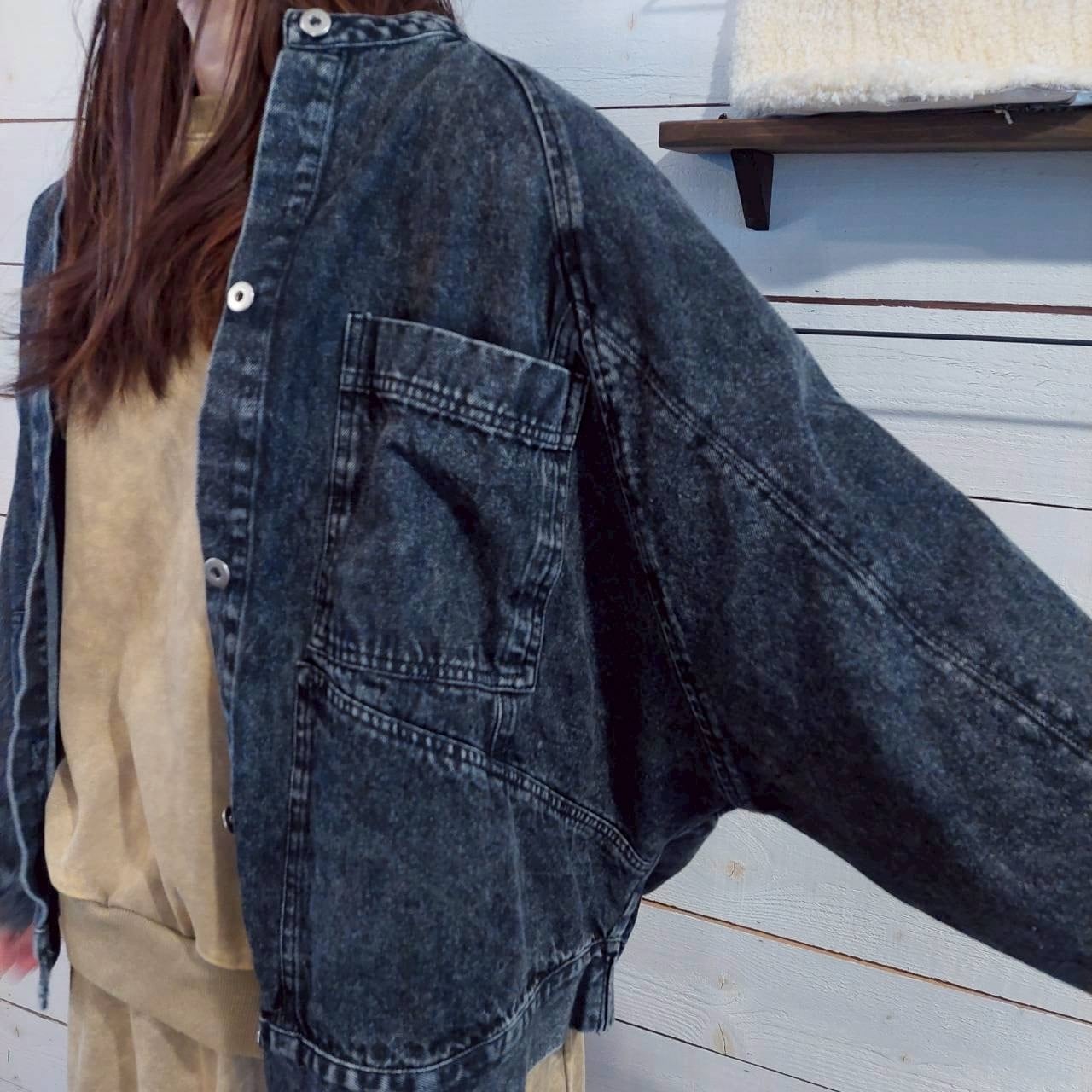 こだわりのあるカラーデニム素材を使用した、カラーデニムラグランブルゾンです。このブルゾンは、しっかりとした生地感が特徴で、袖周りがゆったりしているため、動きやすさを実現しています。また、後ろが長めのデザインがスタイリッシュさを引き立て、日常のコーディネートにアクセントを加えてくれる一枚です。