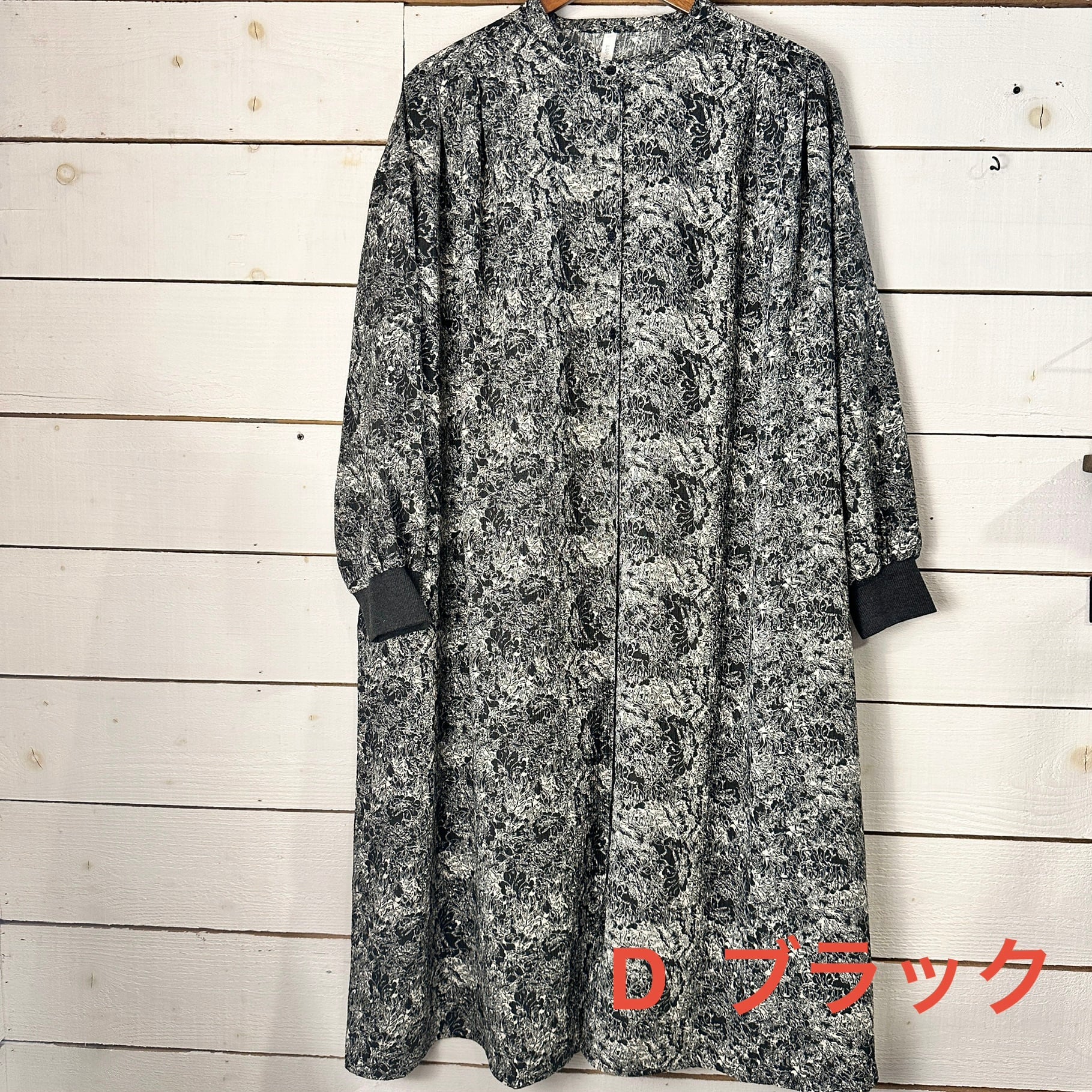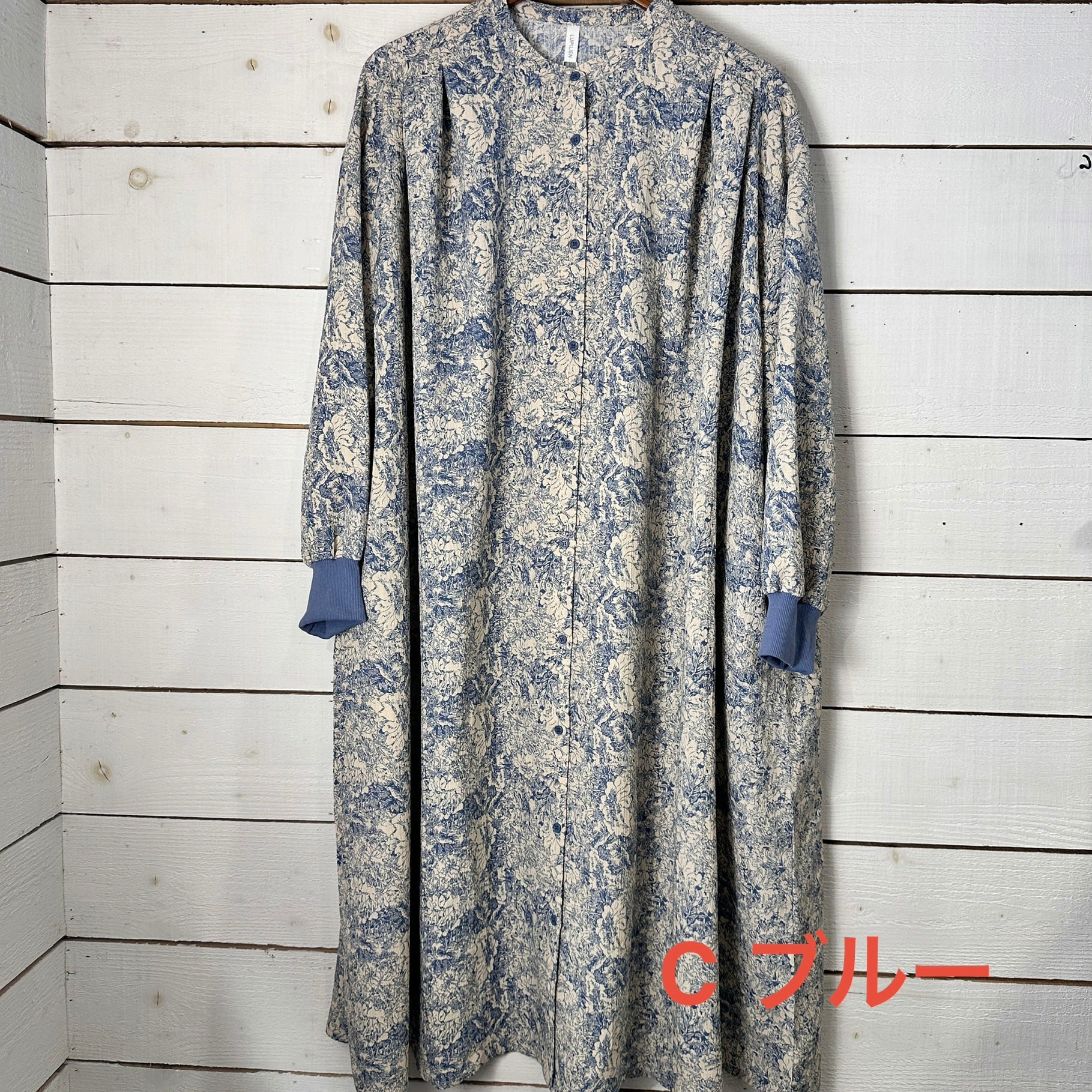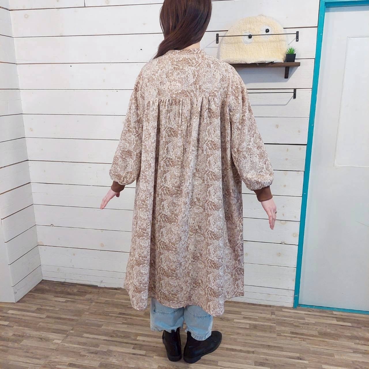 肩まわりや身幅には程よいゆとりを持たせ、リラックス感がありながらも、広がりすぎない分量感に調整されています。袖口にはリブを配し、甘さのあるワンピースにほどよいカジュアルさをプラス。袖をたくし上げたときも収まりがよく、実用性の高い仕様です。前立ては途中まで開くデザインで、着脱のしやすさと縦ラインを強調する視覚効果を両立。後ろ身頃にはギャザーを入れ、後ろ姿にも柔らかな動きを持たせています。一枚で着映えしつつ、日常使いしやすいバランスに仕上げたワンピースです。