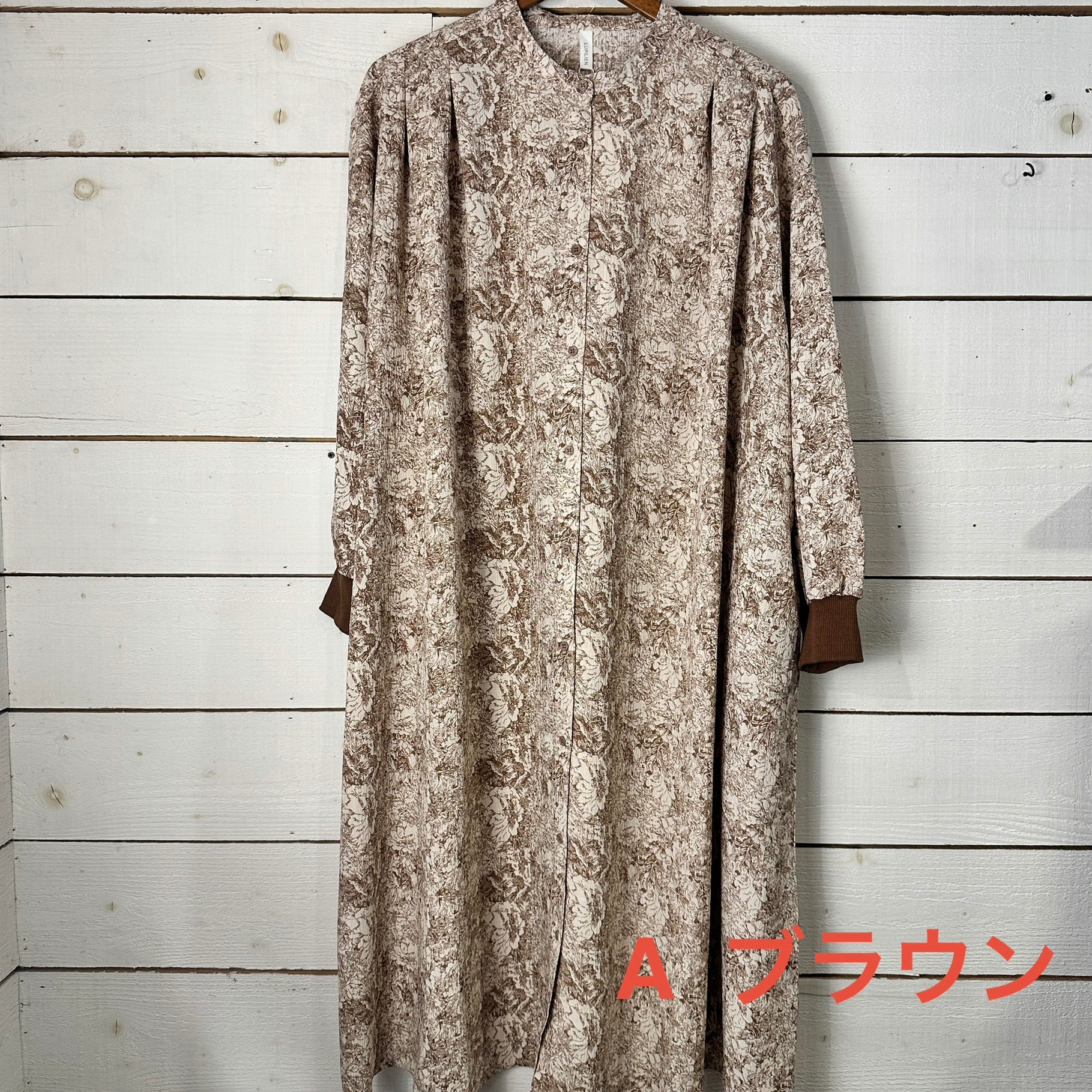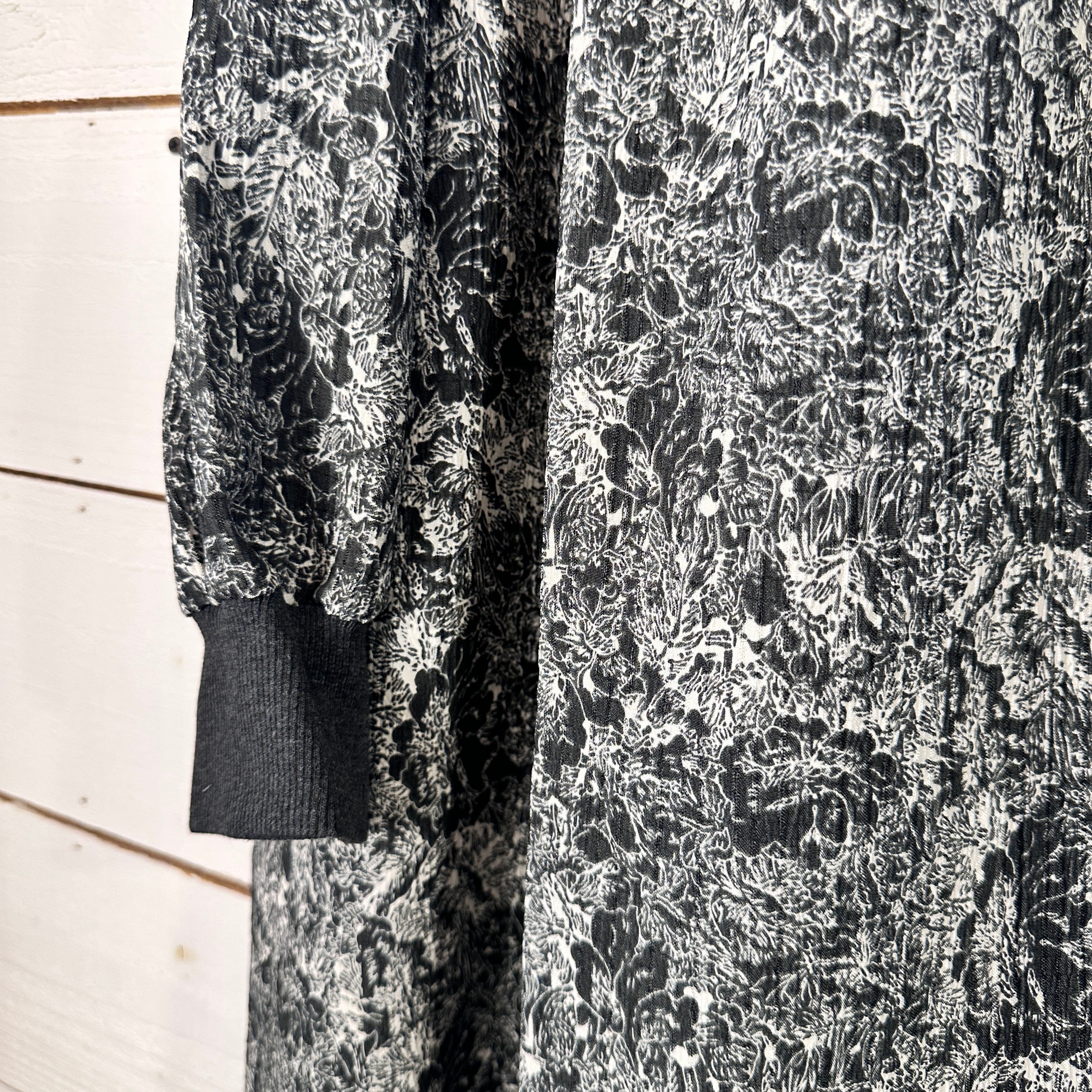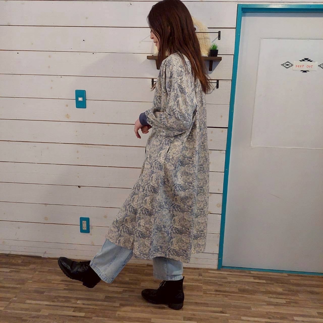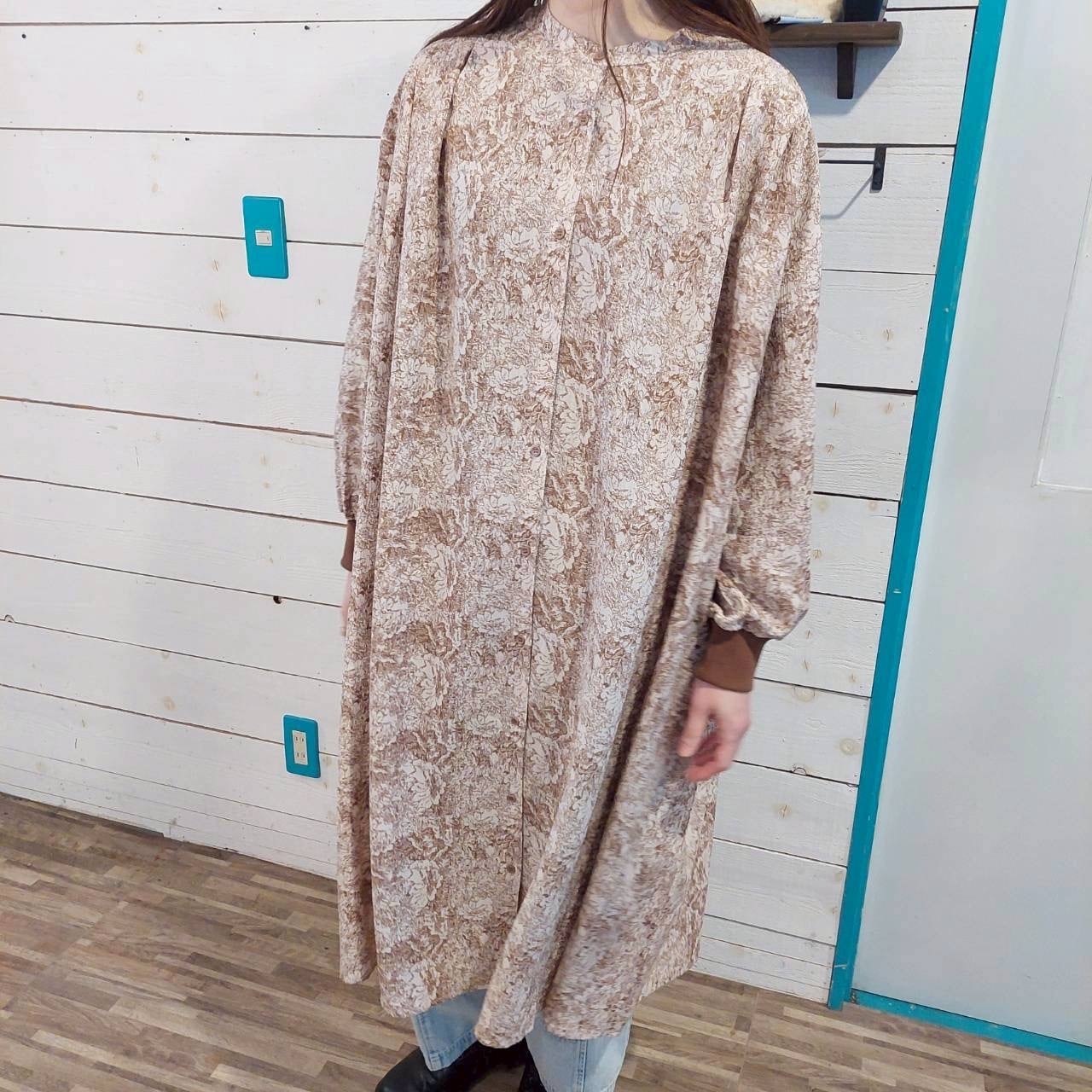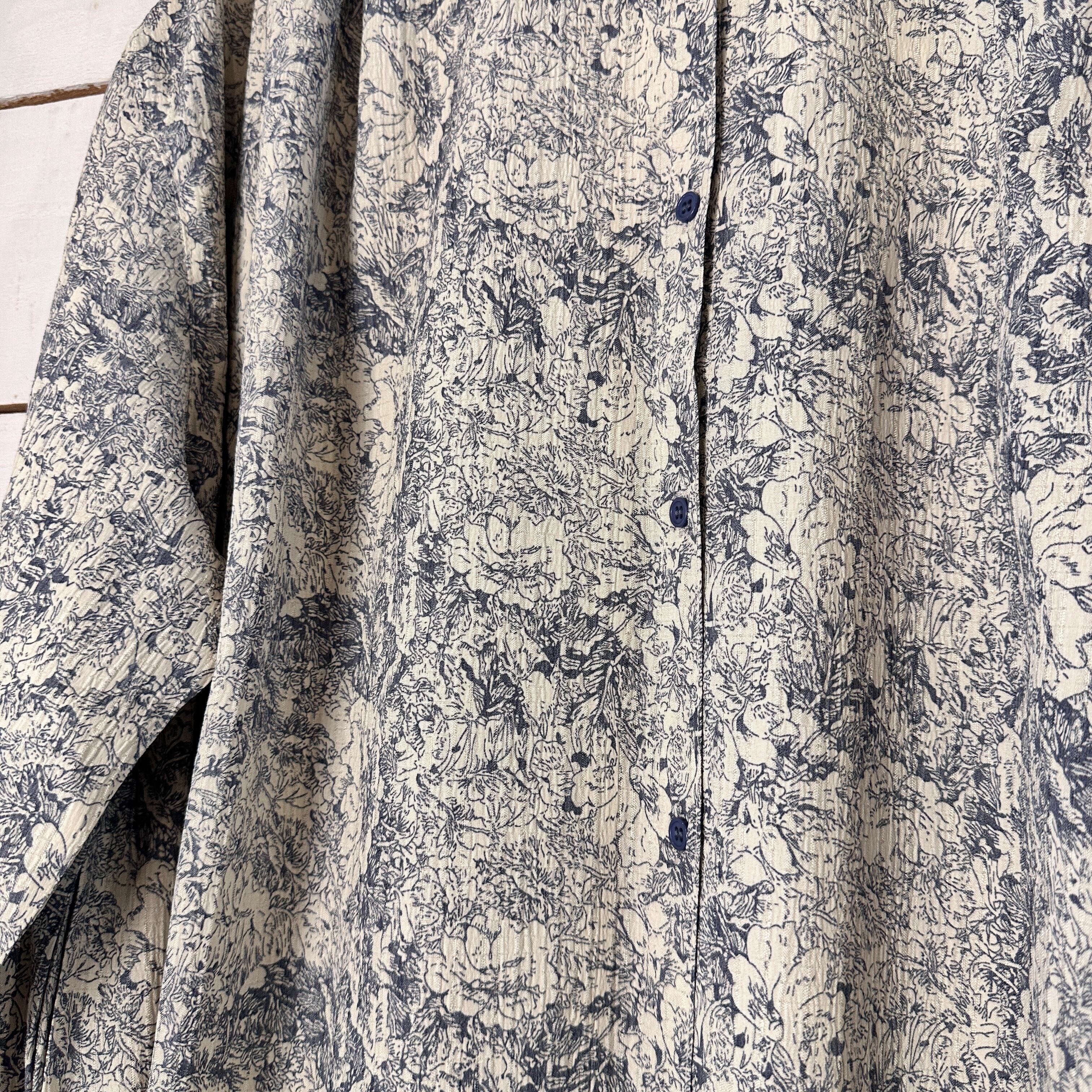 全体に施された花柄は、細かな線で描かれたボタニカル調のモチーフをベースに、ワッシャー加工による自然なシワ感を重ねることで、単なるプリントでは出せない立体的な表情を生み出しています。薄手ながらも頼りなさはなく、落ち感とふくらみのバランスが良いため、動くたびにやさしく揺れる素材感が楽しめます。