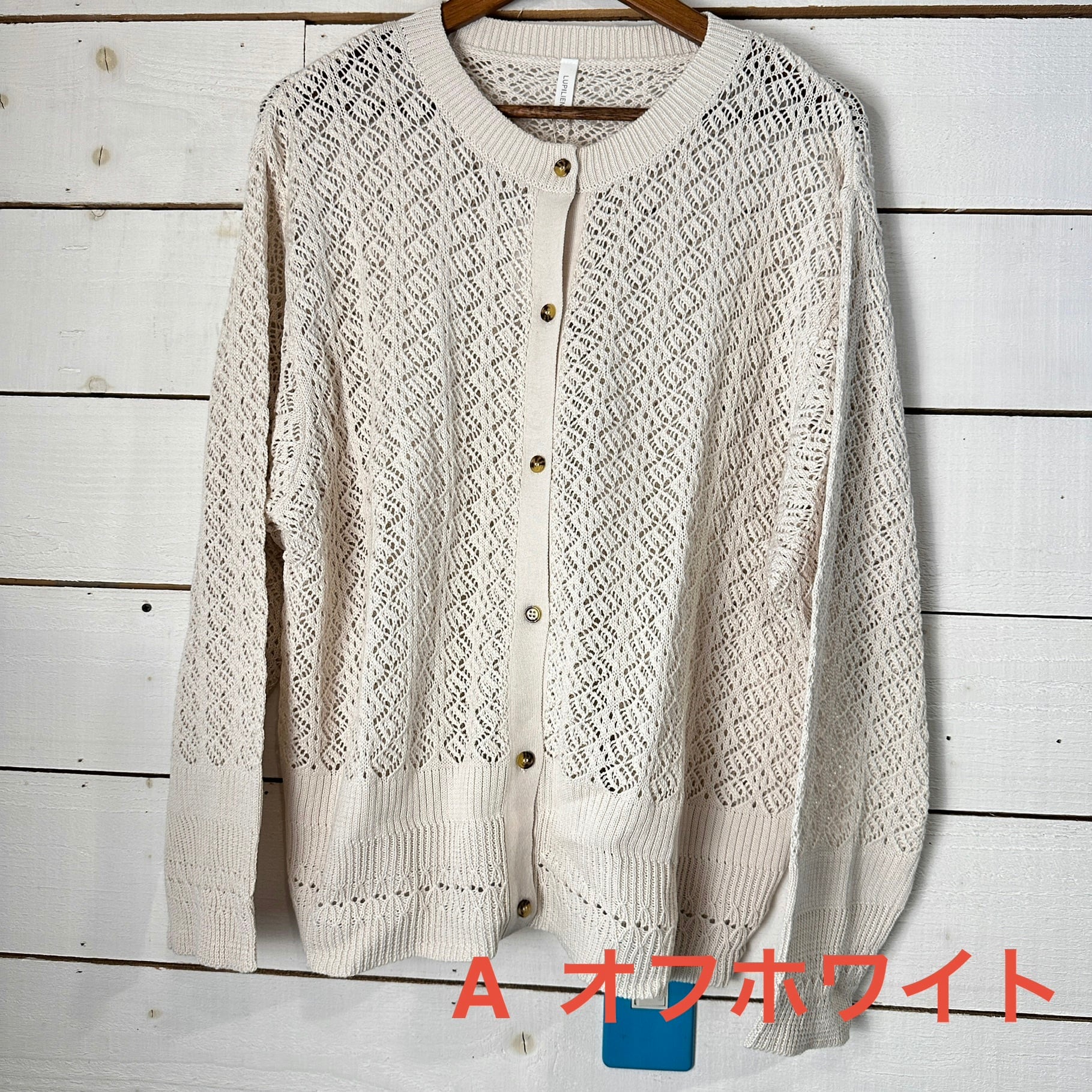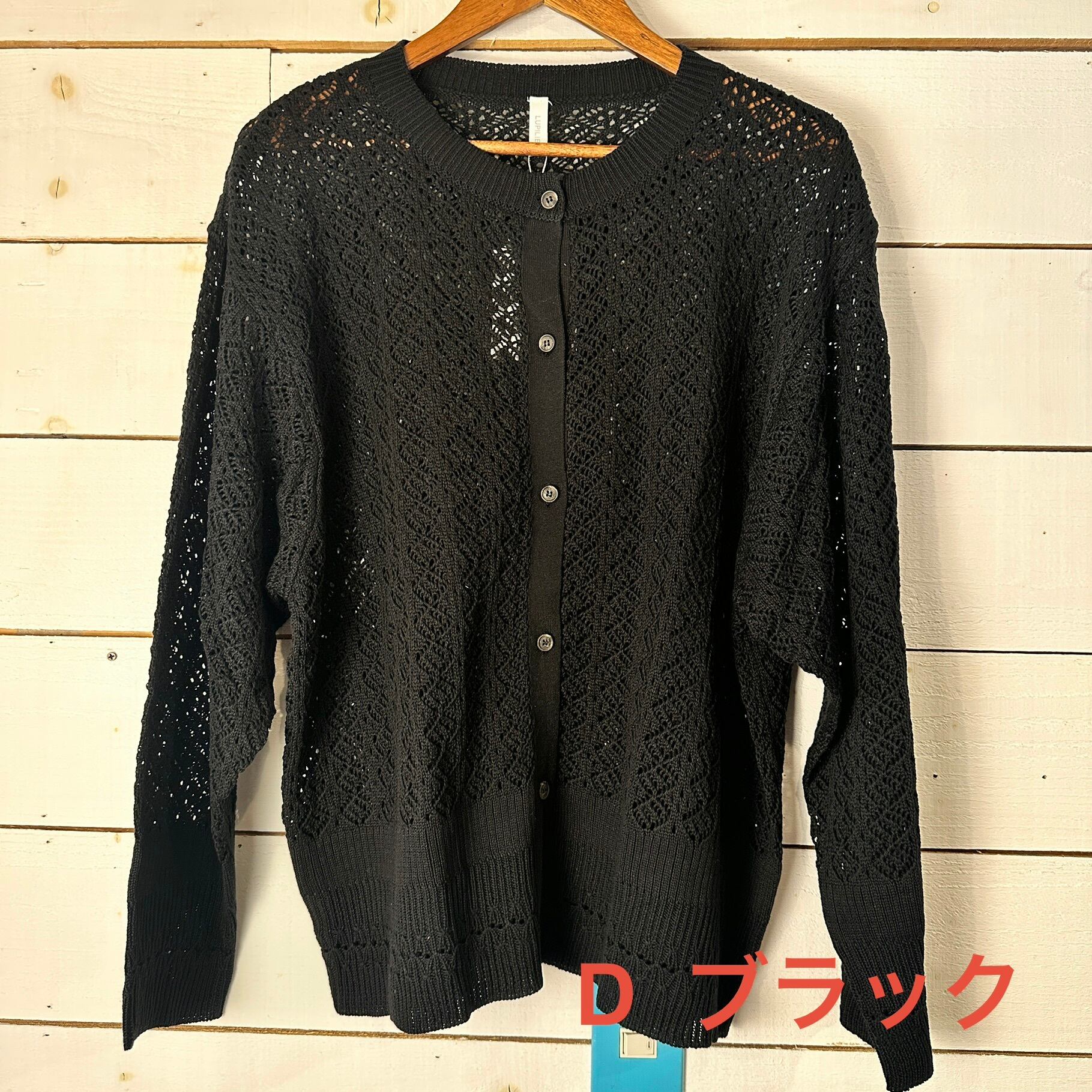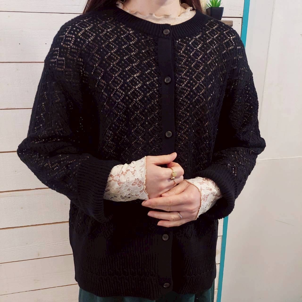 全体に施された透かし編みは、編み目の大小と密度に変化をつけることで、単調にならず、ボタニカルモチーフが自然に浮かび上がる表情豊かな仕上がりです。さらっとした触感で、長時間着用してもストレスを感じにくいのが特徴です。透けすぎない絶妙な編みバランスのため、インナーの色や素材感を選ぶことで、印象を調整できる点も卸向けとして提案しやすいポイントです。