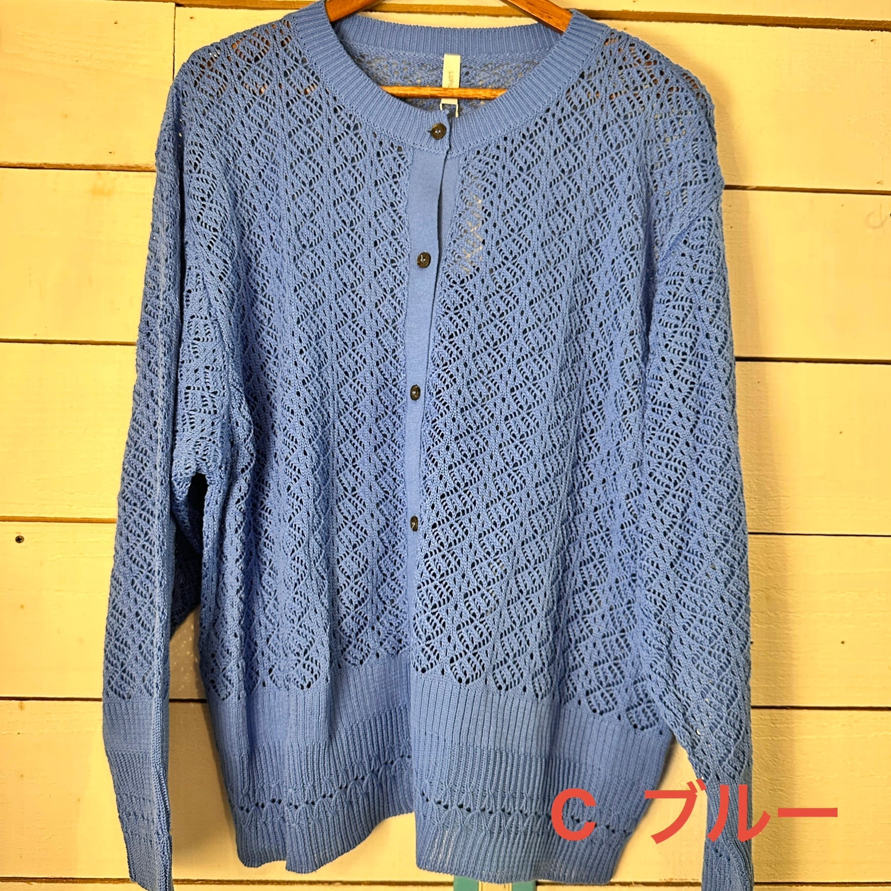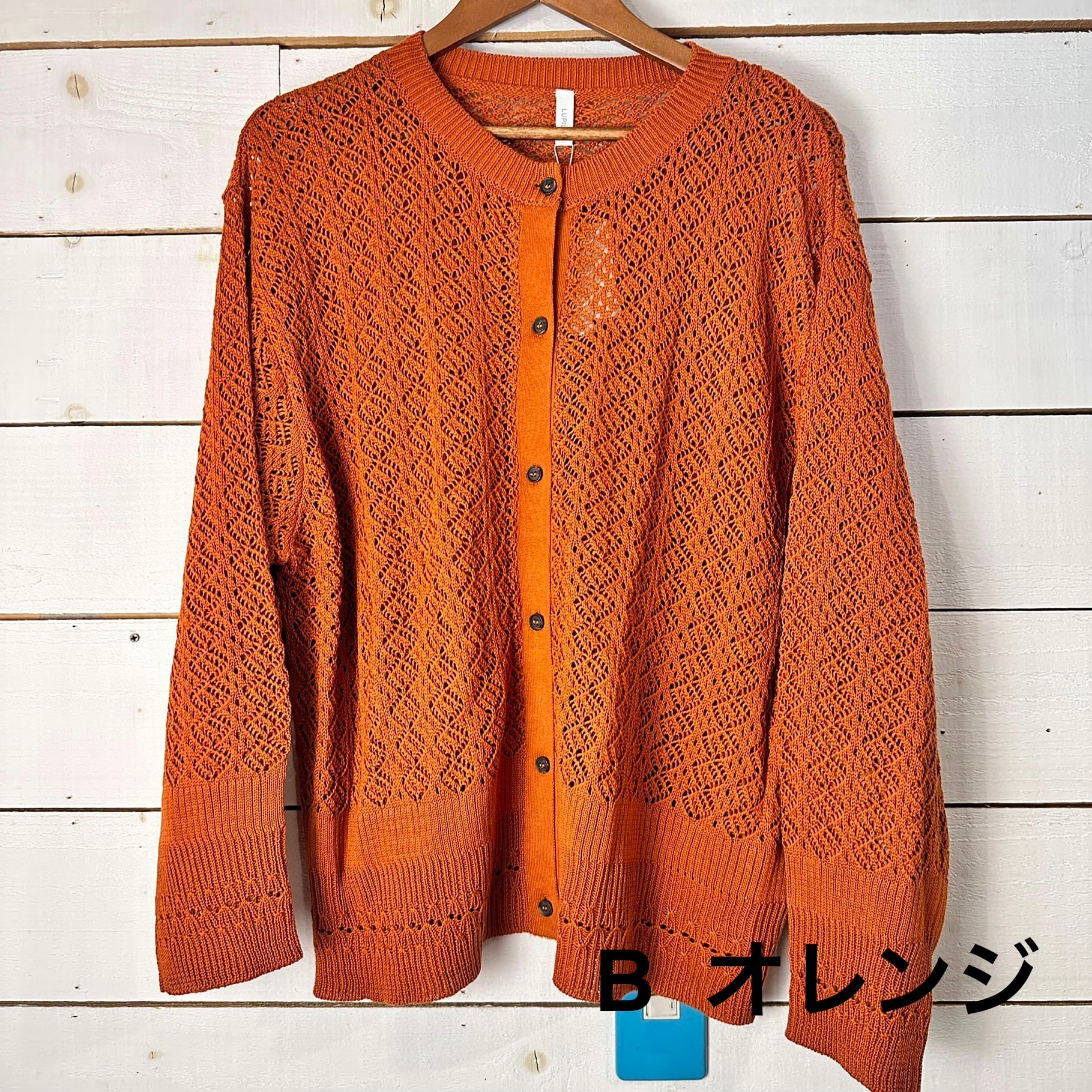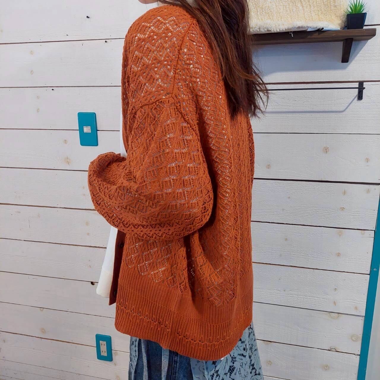 全体に施された透かし編みは、編み目の大小と密度に変化をつけることで、単調にならず、ボタニカルモチーフが自然に浮かび上がる表情豊かな仕上がりです。さらっとした触感で、長時間着用してもストレスを感じにくいのが特徴です。透けすぎない絶妙な編みバランスのため、インナーの色や素材感を選ぶことで、印象を調整できる点も卸向けとして提案しやすいポイントです。