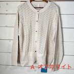 シルエットは身幅にゆとりを持たせたベーシックなカーディガン型。肩や袖まわりも窮屈感がなく、重ね着しやすい設計です。前立てや裾、袖口にはリブ編みを施し、透かし編みの軽やかさの中に、程よい安定感をプラスしています。ボタンを留めてプルオーバー感覚で着用することもでき、前を開ければさっと羽織れるため、温度調節アイテムとしても活躍します。ボタニカル柄は主張しすぎず、ナチュラルな印象にまとまっているため、柄物が苦手な方にも取り入れやすい一枚です。