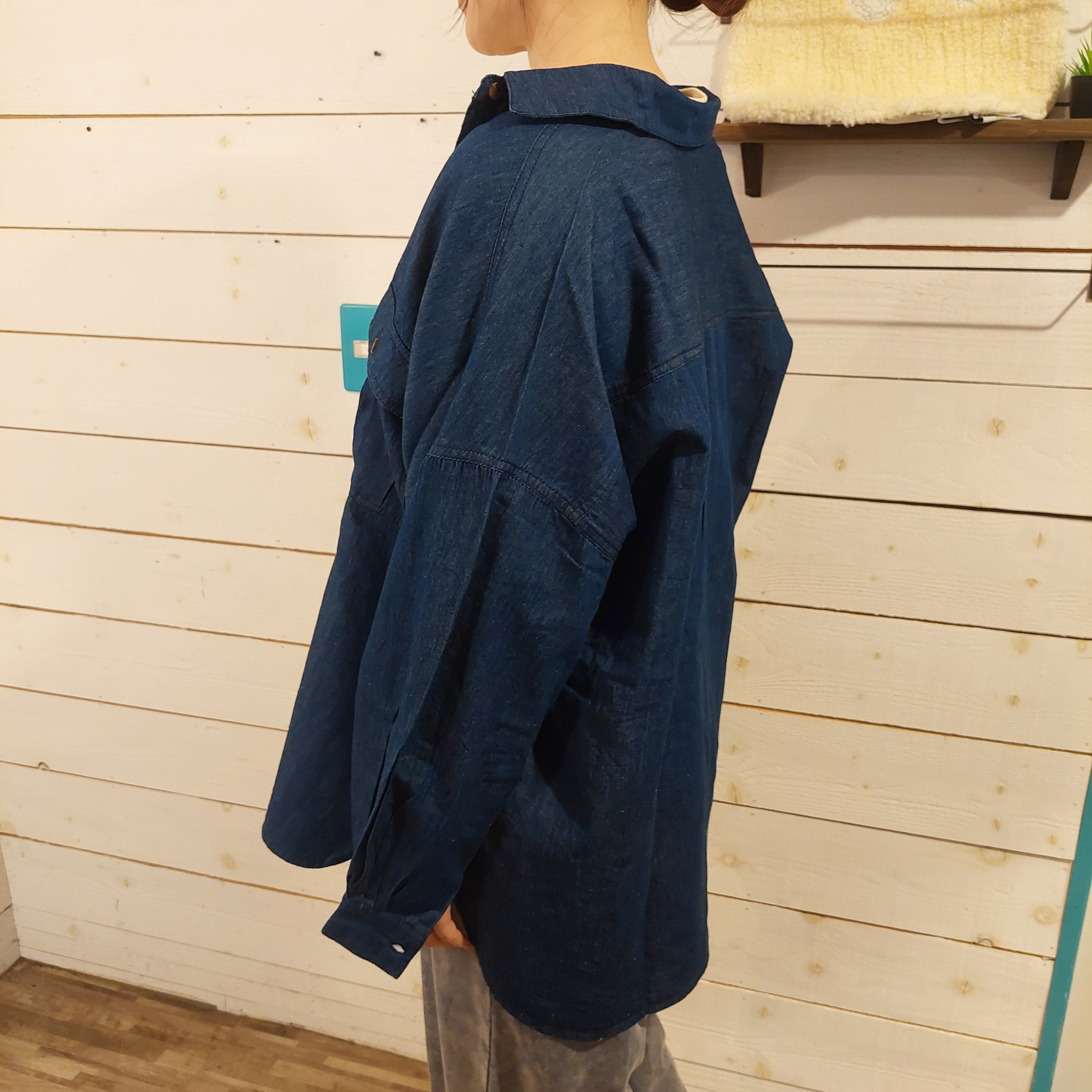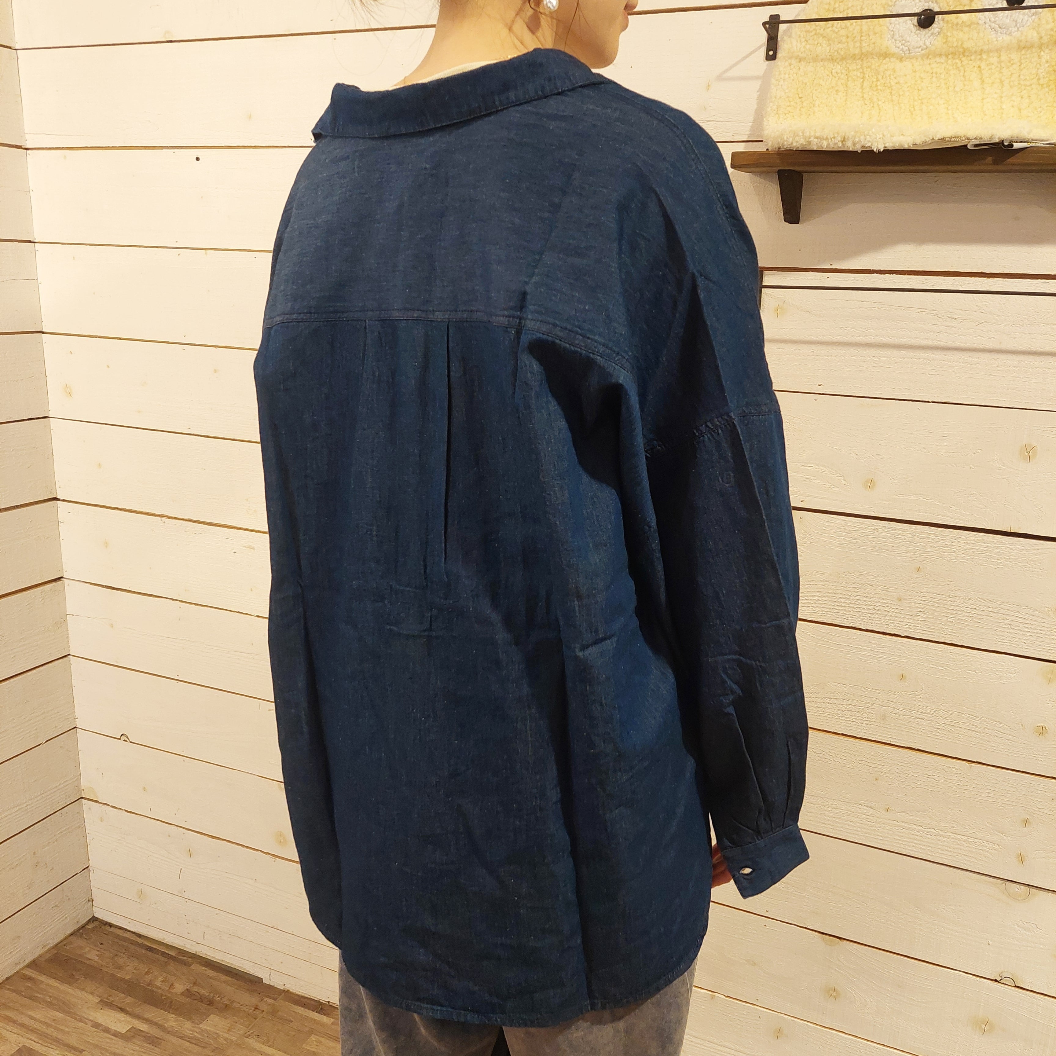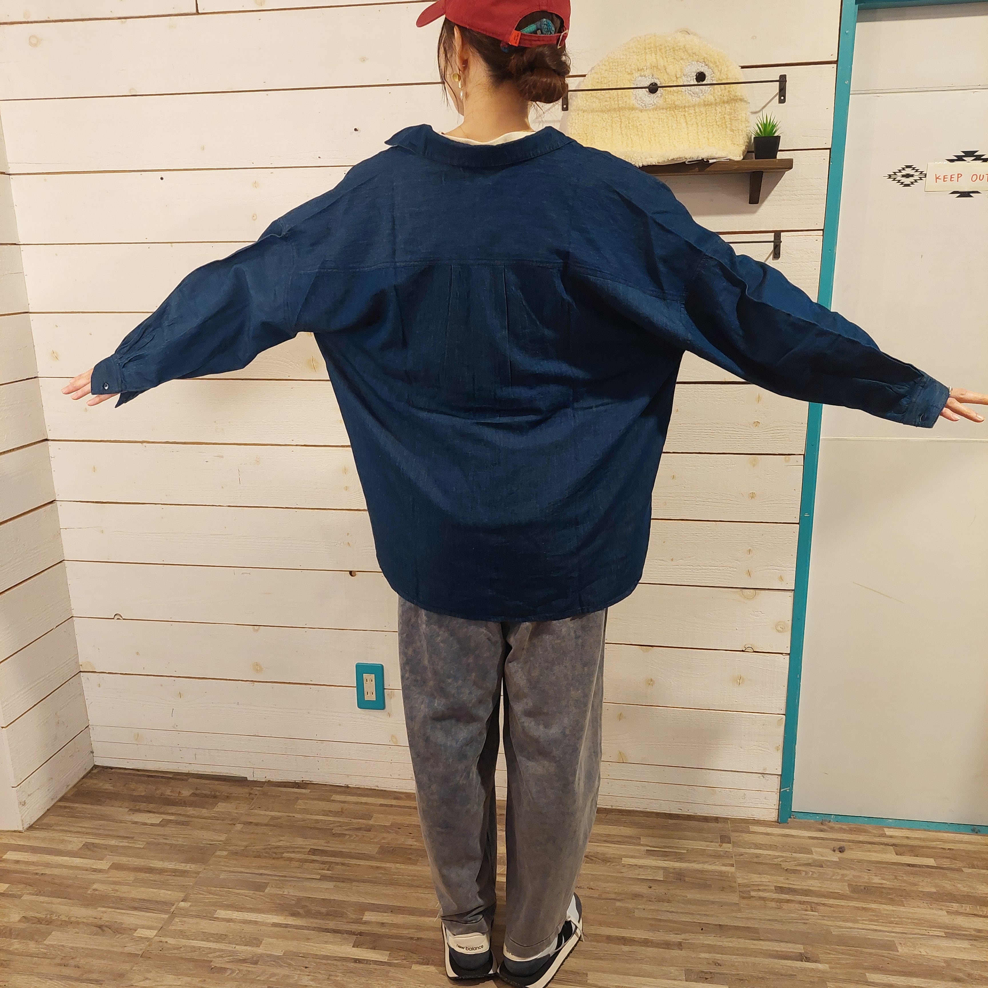 シルエットは、ゆったりとしたBIGシルエットをベースに、肩や身幅に余裕を持たせた設計。落ち感のあるライトデニムだからこそ、オーバーサイズでも広がりすぎず、自然に身体に沿うラインを描きます。胸元にはフラップ付きポケットを配し、ワークテイストを感じさせながらも、全体の印象はあくまで柔らかく、ナチュラルな仕上がり。前立てや襟まわりはシンプルにまとめ、デニムの素材感が引き立つデザインです。後ろ身頃にはヨーク切替を入れ、さりげなく立体感をプラス。長袖仕様ですが、袖をラフにロールアップしてもバランスよく決まり、着こなしの幅が広がります。一枚着としても、軽い羽織としても使えるため、売り場での提案もしやすい万能シャツです。