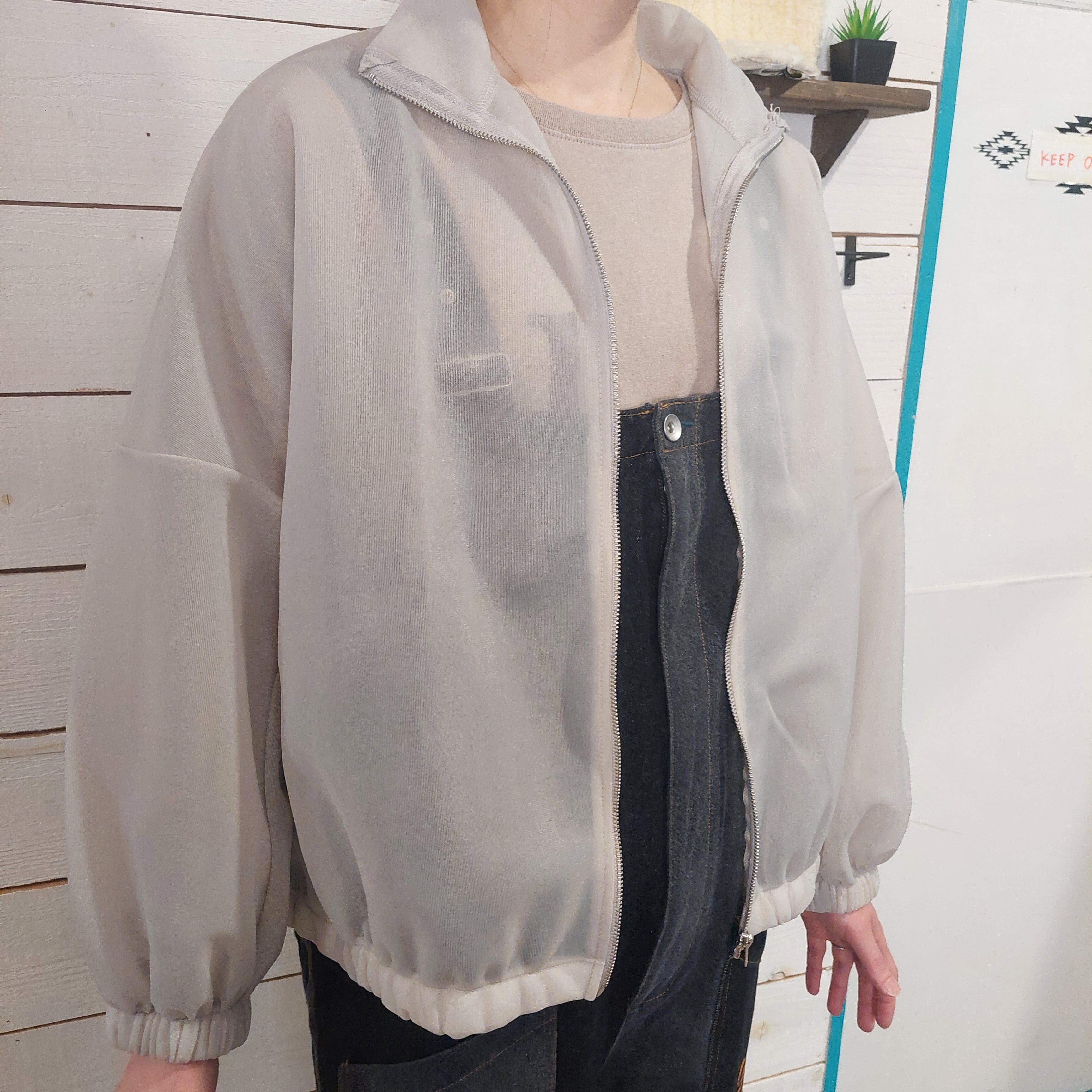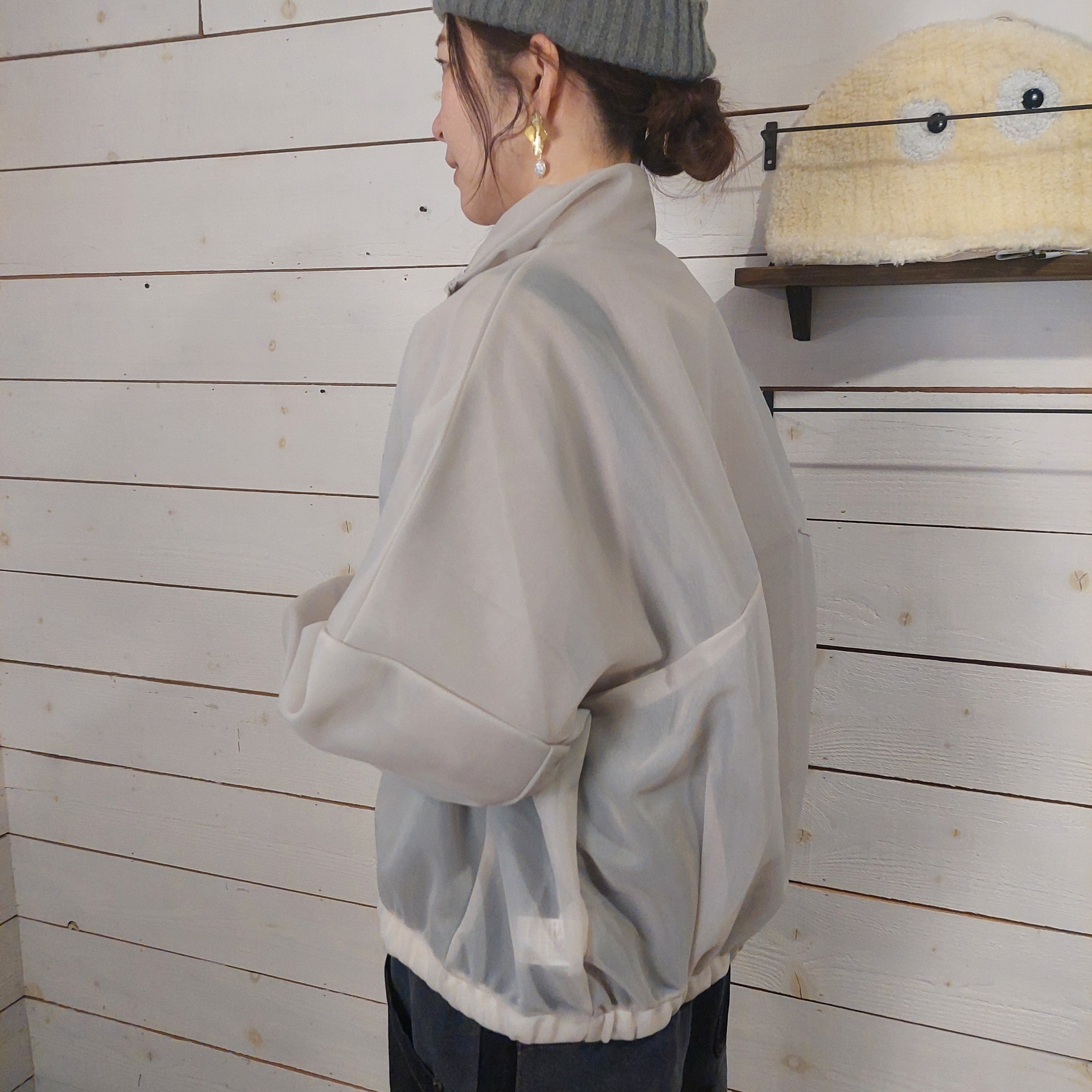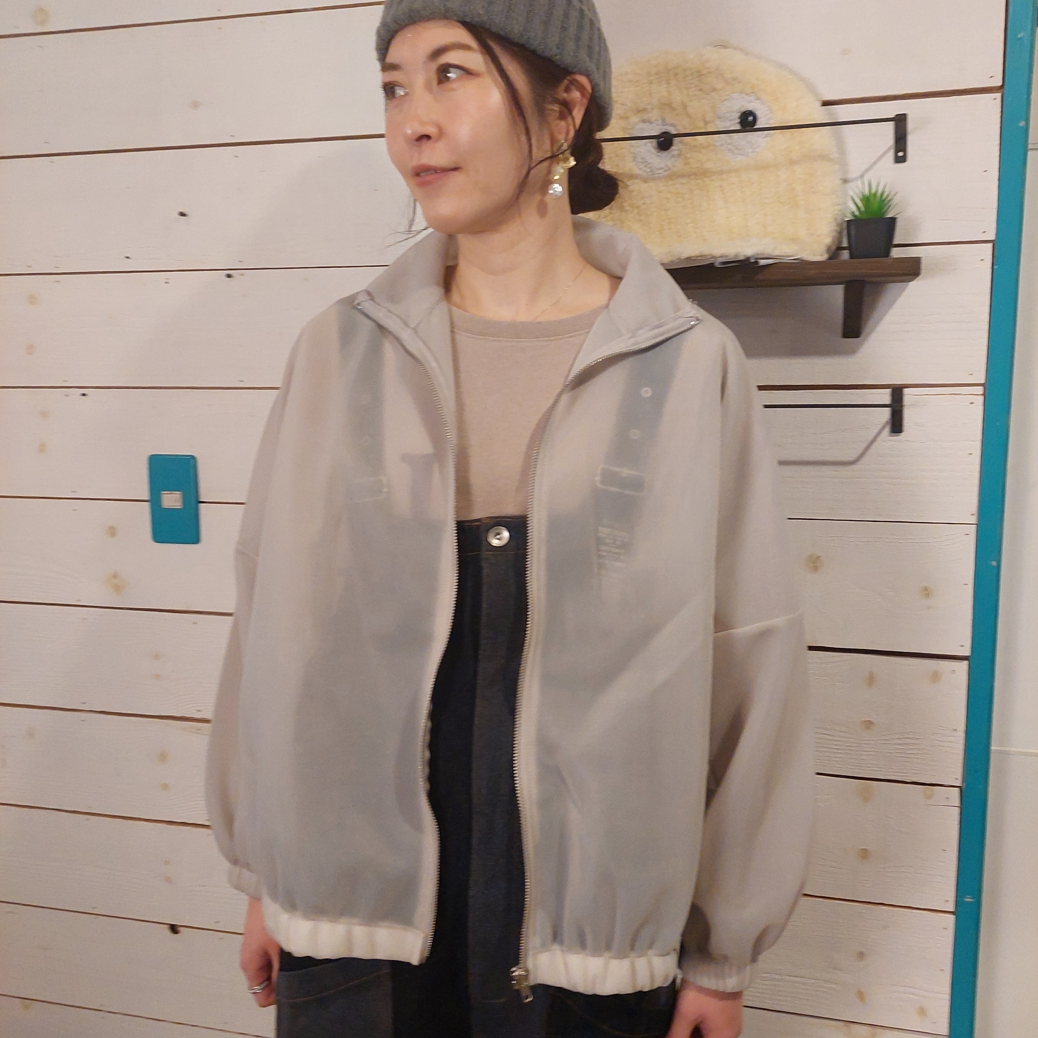 スポーティーなトラックジャケットの意匠を、シアーな素材使いでモードにアップデートしたスタンドジップブルゾンです。最大の特徴は、ダンボールニット特有の構築的なシルエットが生む「空気を含んだようなボリューム感」と、中身が薄く透けることによる「視覚的な軽やかさ」の絶妙なバランス。首元をしっかりと覆う高めのスタンドカラーは、ジップを上まで閉めることでマニッシュでストイックな印象を与え、少し開ければ抜け感のある襟元を演出します。肩ラインを落としたドロップショルダーと、裾や袖口に配したリブの締め付けが、女性らしい丸みのあるバックスタイルを構築。インナーとのレイヤードがデザインの一部となるため、色や柄の合わせ次第で、ミニマルにもデコラティブにも表情を変えることができる、感度の高いレイヤードピースです。