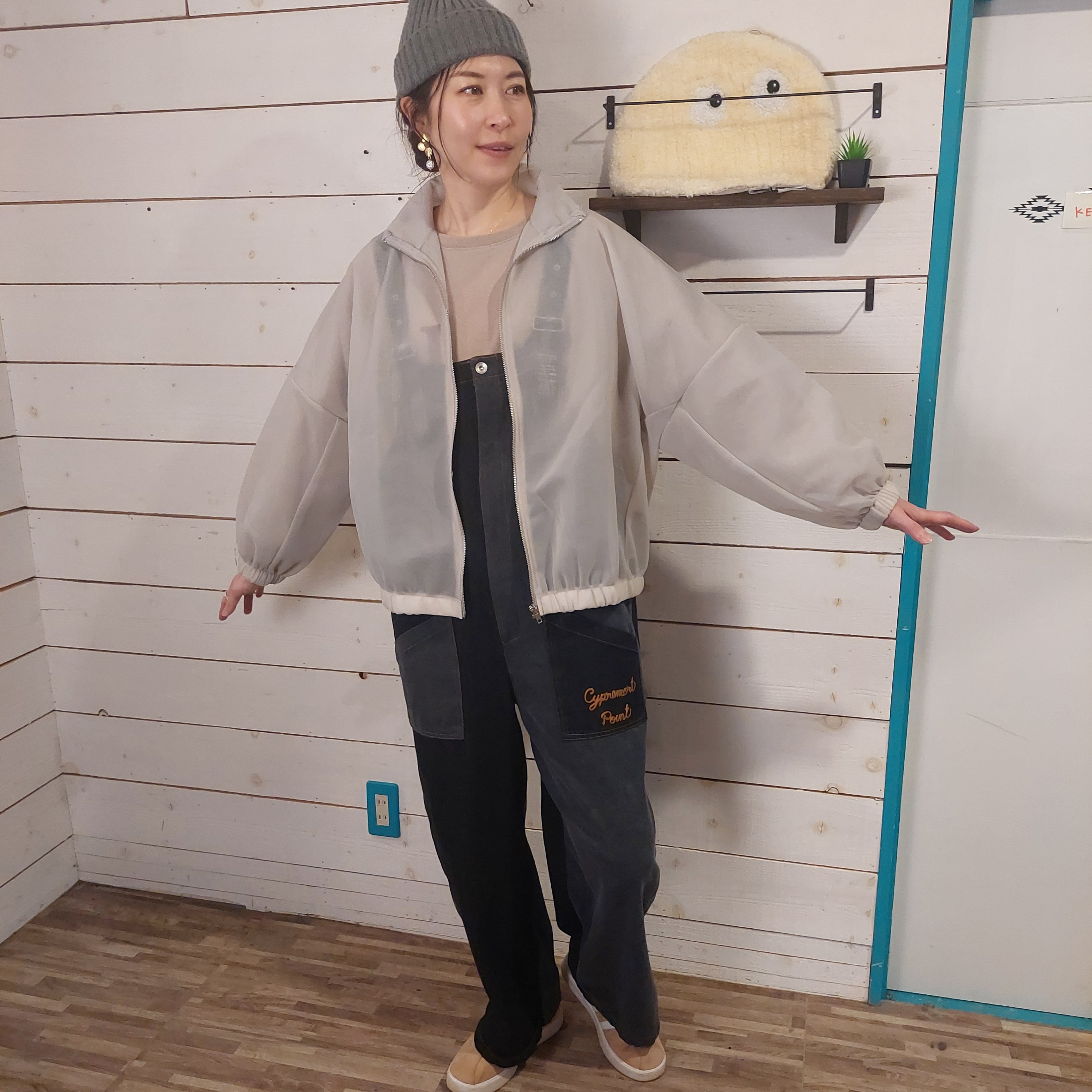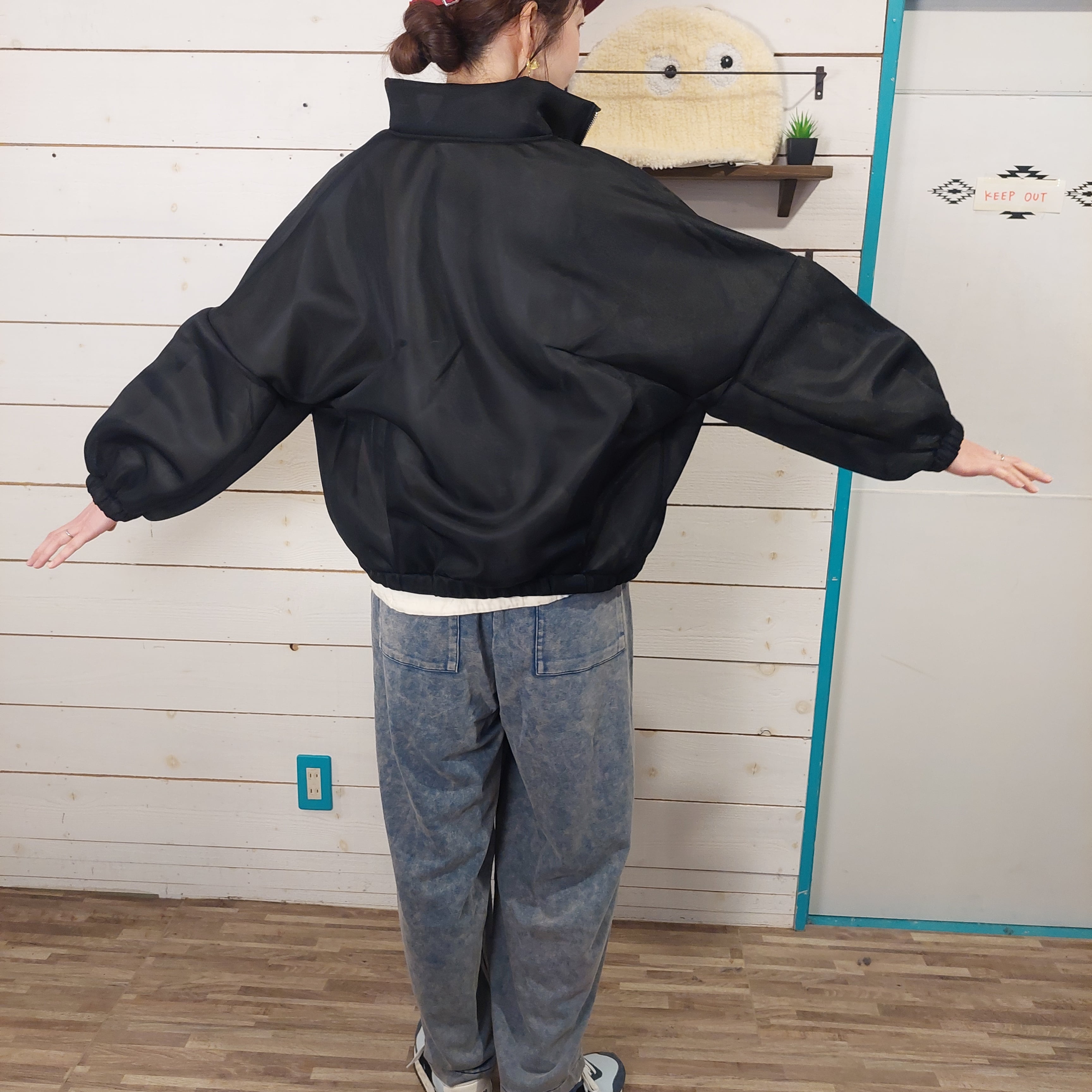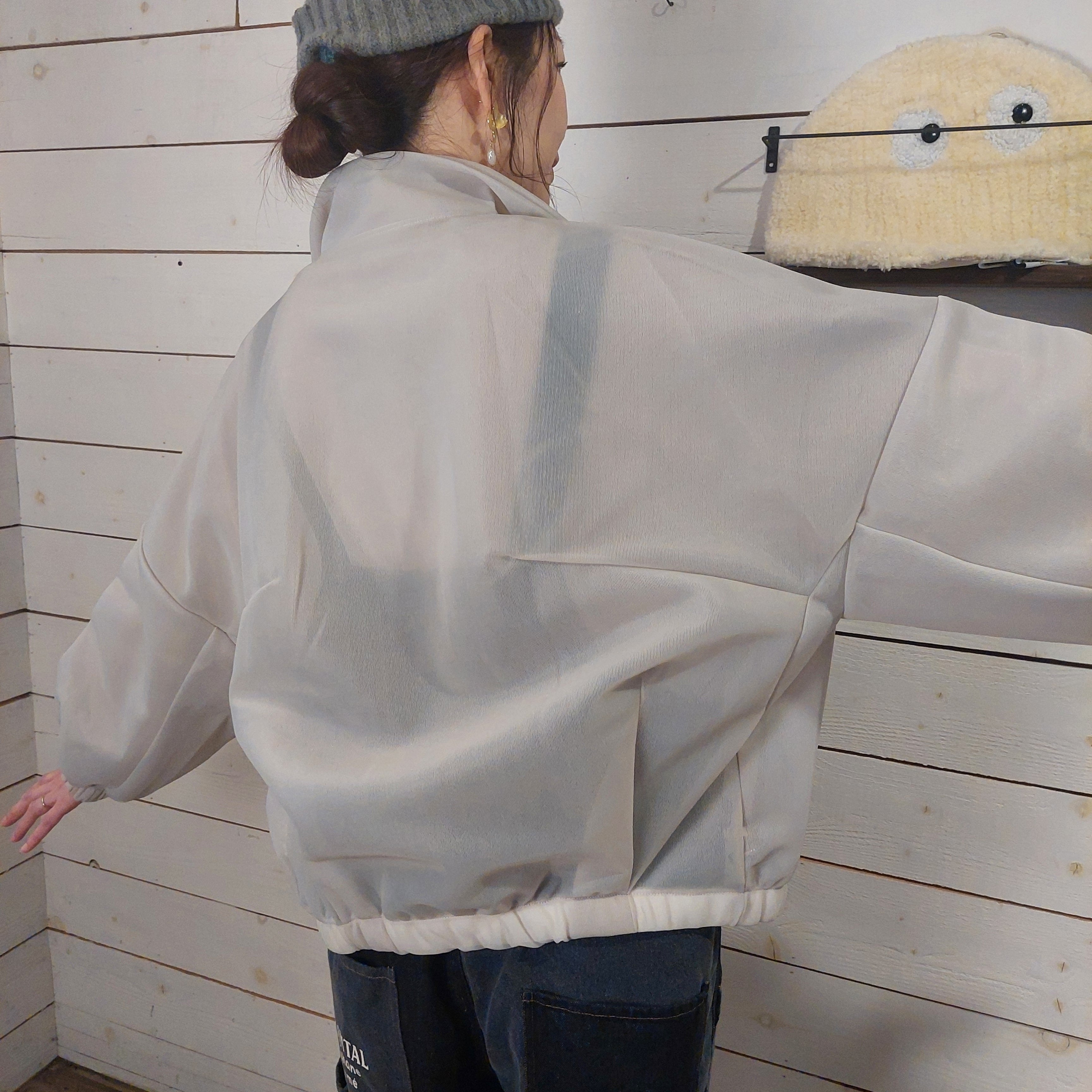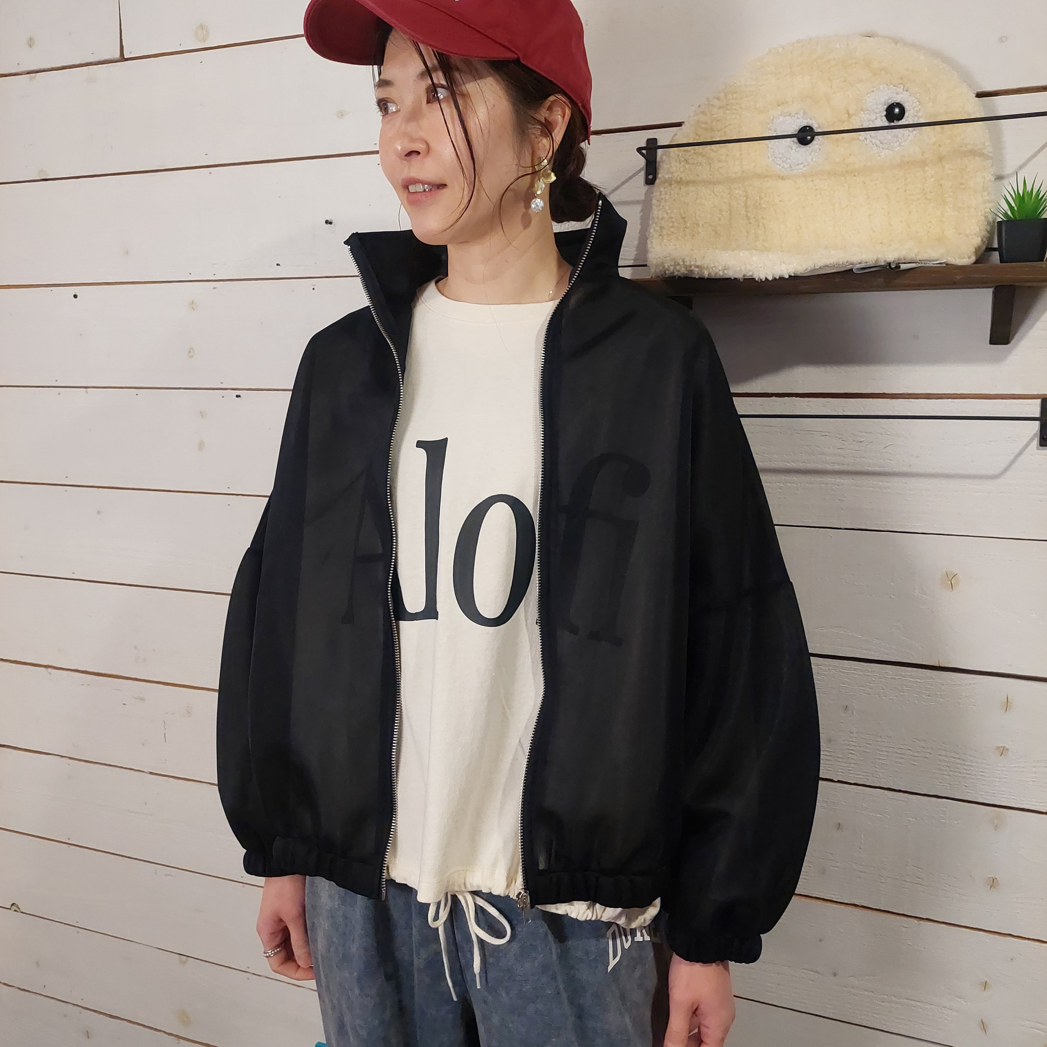 スポーティーなトラックジャケットの意匠を、シアーな素材使いでモードにアップデートしたスタンドジップブルゾンです。最大の特徴は、ダンボールニット特有の構築的なシルエットが生む「空気を含んだようなボリューム感」と、中身が薄く透けることによる「視覚的な軽やかさ」の絶妙なバランス。首元をしっかりと覆う高めのスタンドカラーは、ジップを上まで閉めることでマニッシュでストイックな印象を与え、少し開ければ抜け感のある襟元を演出します。肩ラインを落としたドロップショルダーと、裾や袖口に配したリブの締め付けが、女性らしい丸みのあるバックスタイルを構築。インナーとのレイヤードがデザインの一部となるため、色や柄の合わせ次第で、ミニマルにもデコラティブにも表情を変えることができる、感度の高いレイヤードピースです。