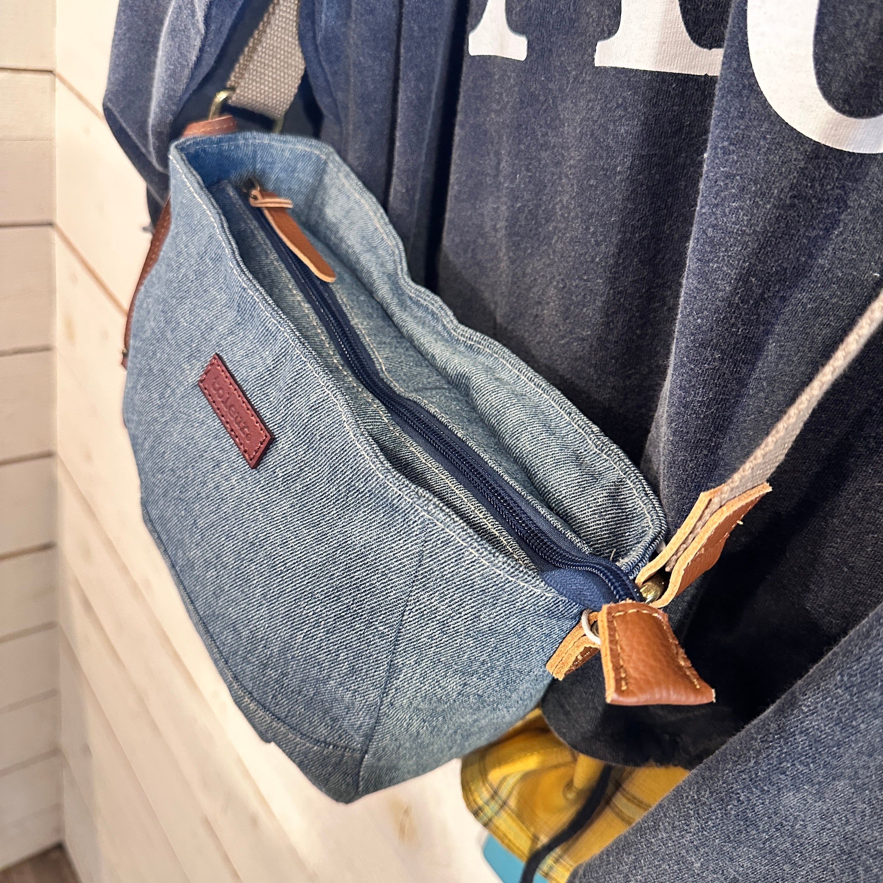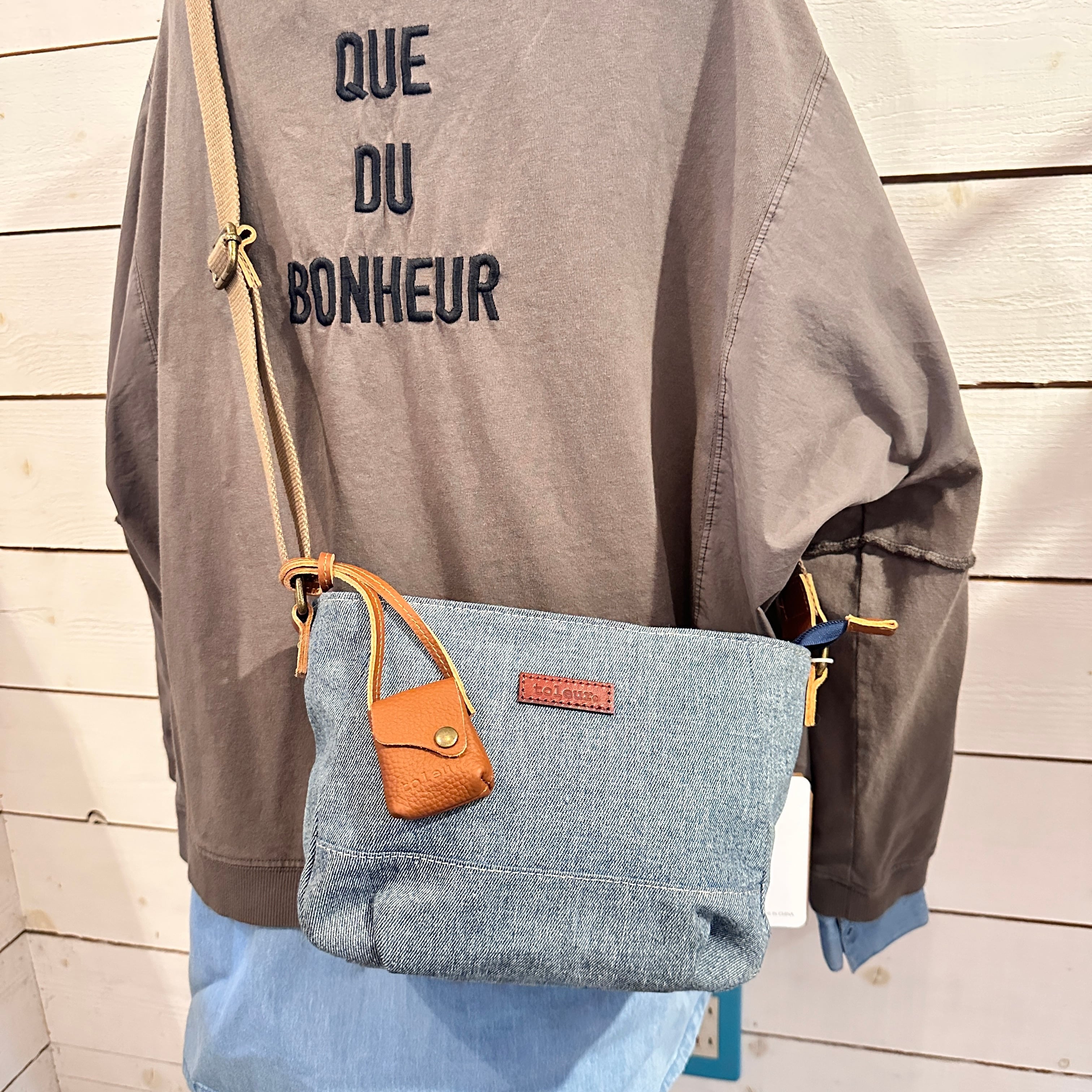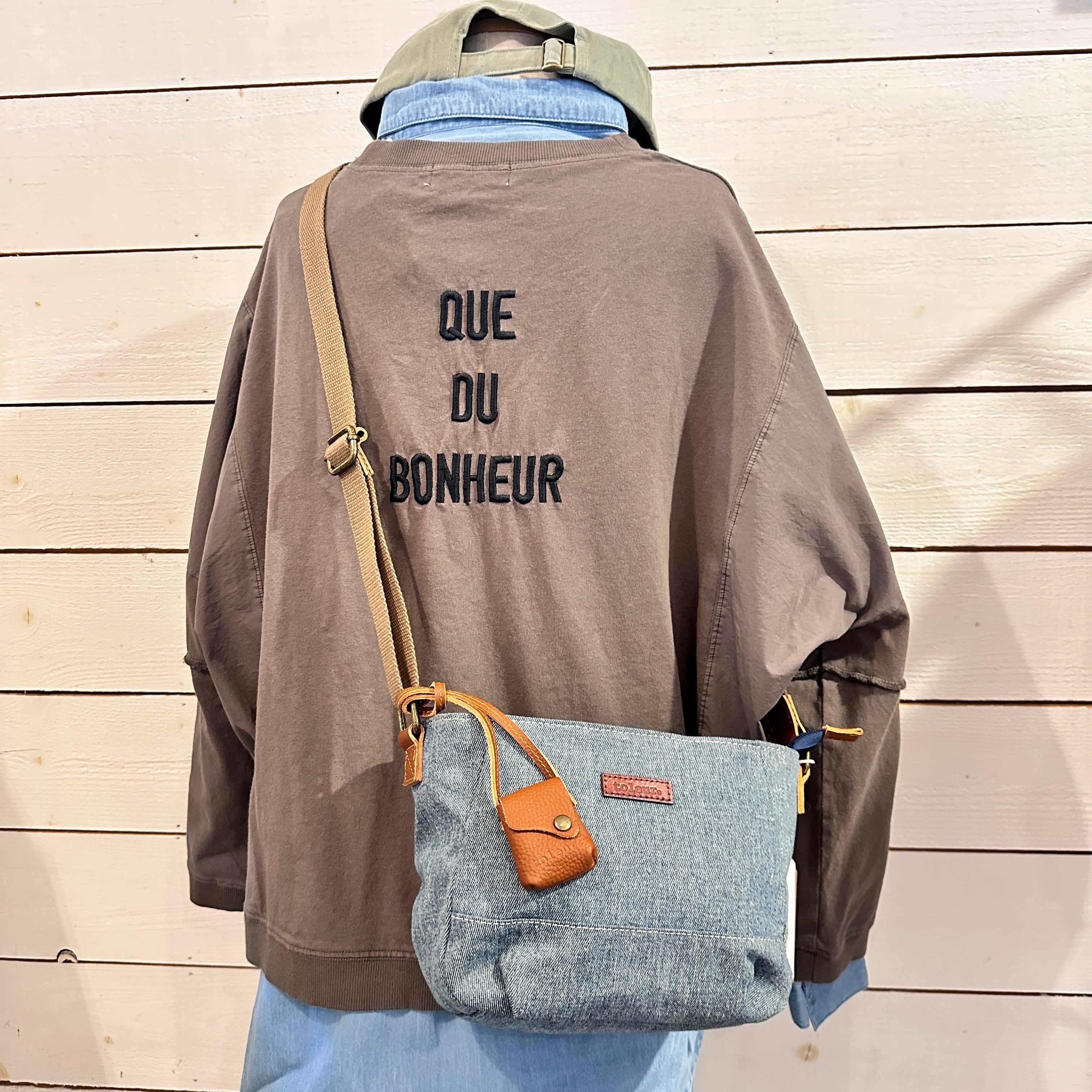 デニムカウレザーショルダーバッグは、デザイン性と機能性を兼ね備えた、男女兼用のおしゃれなアイテムです。デニム素材と本革の接続部分が、カジュアルながらも高級感を演出。しっかりとしたマチがあり、日常使いにもぴったりです!