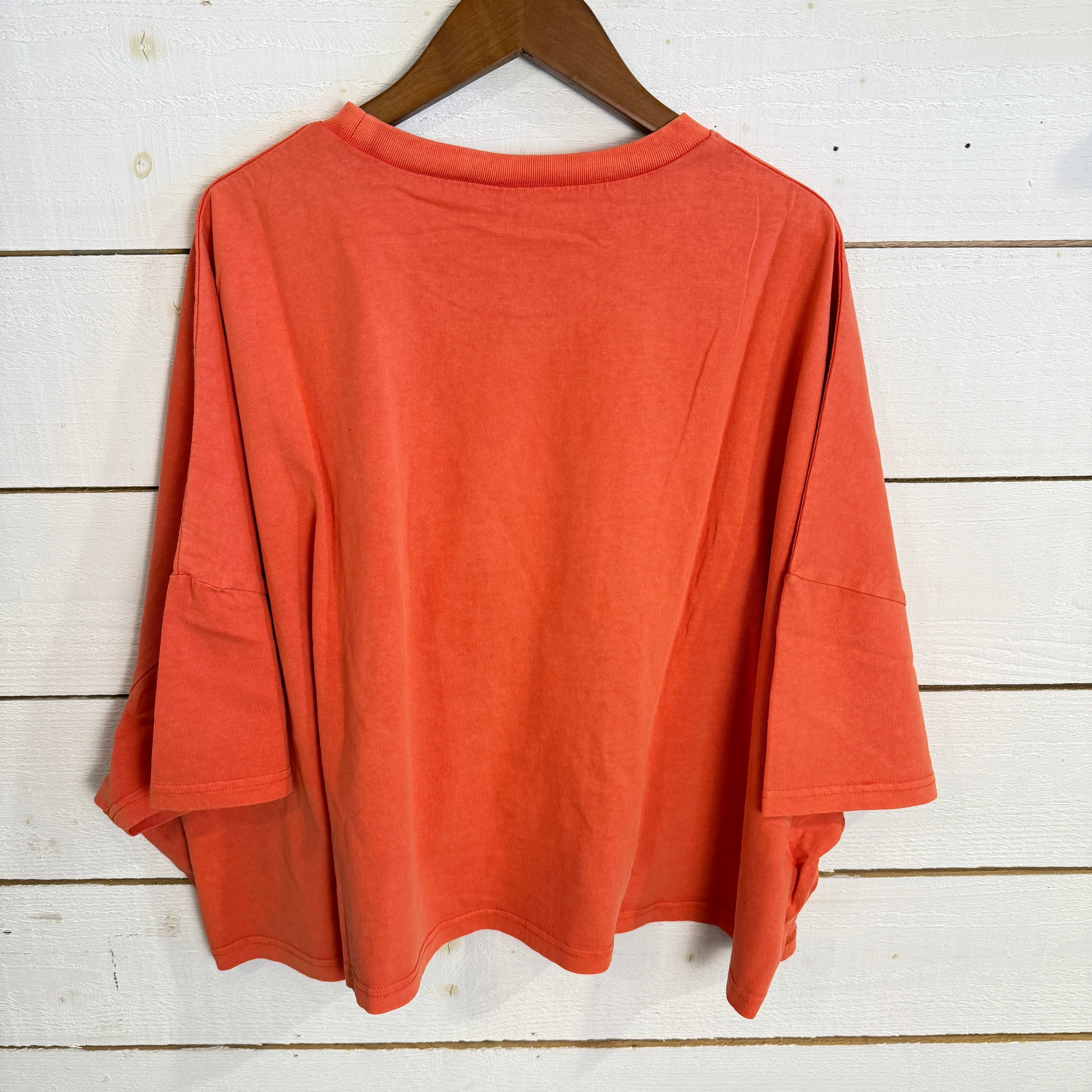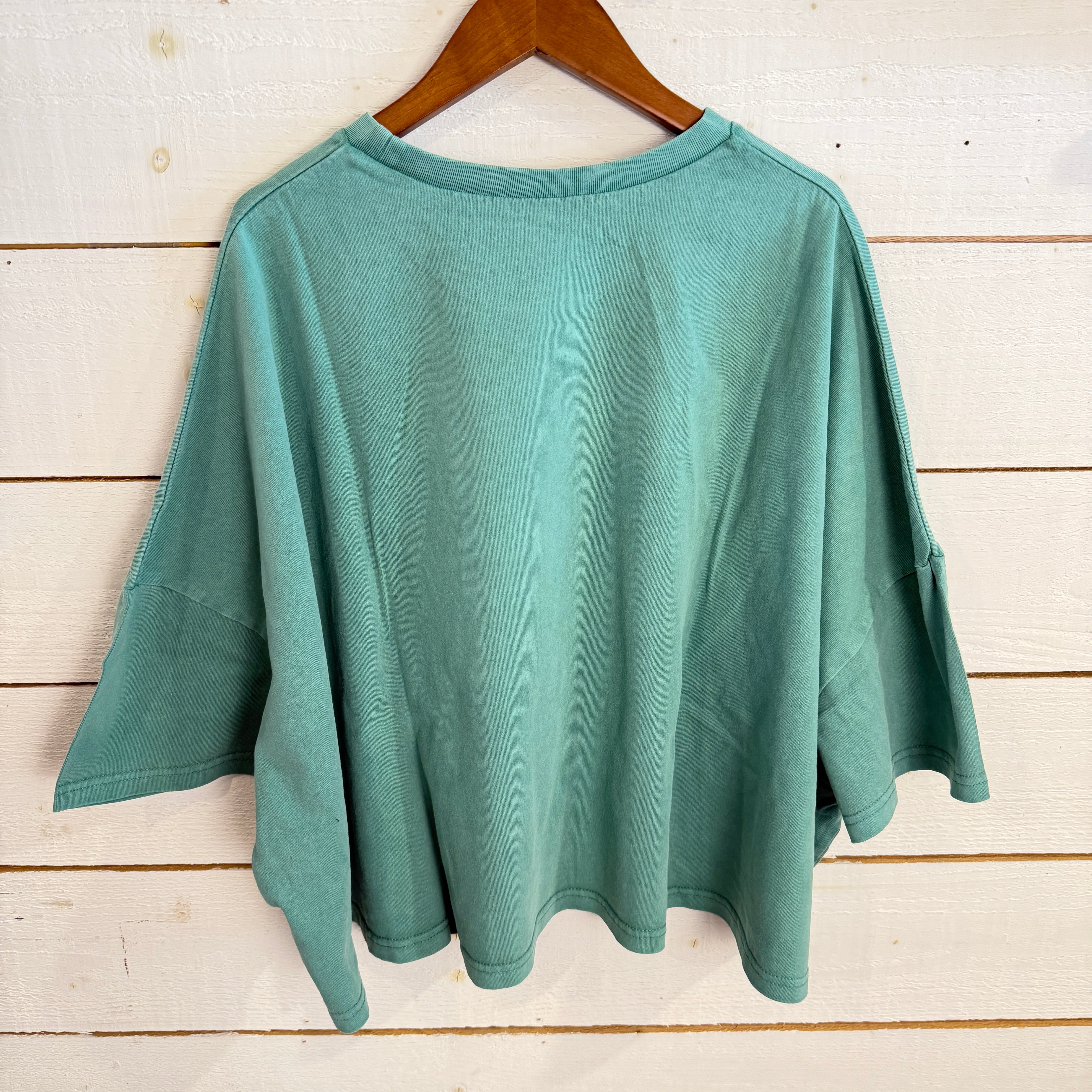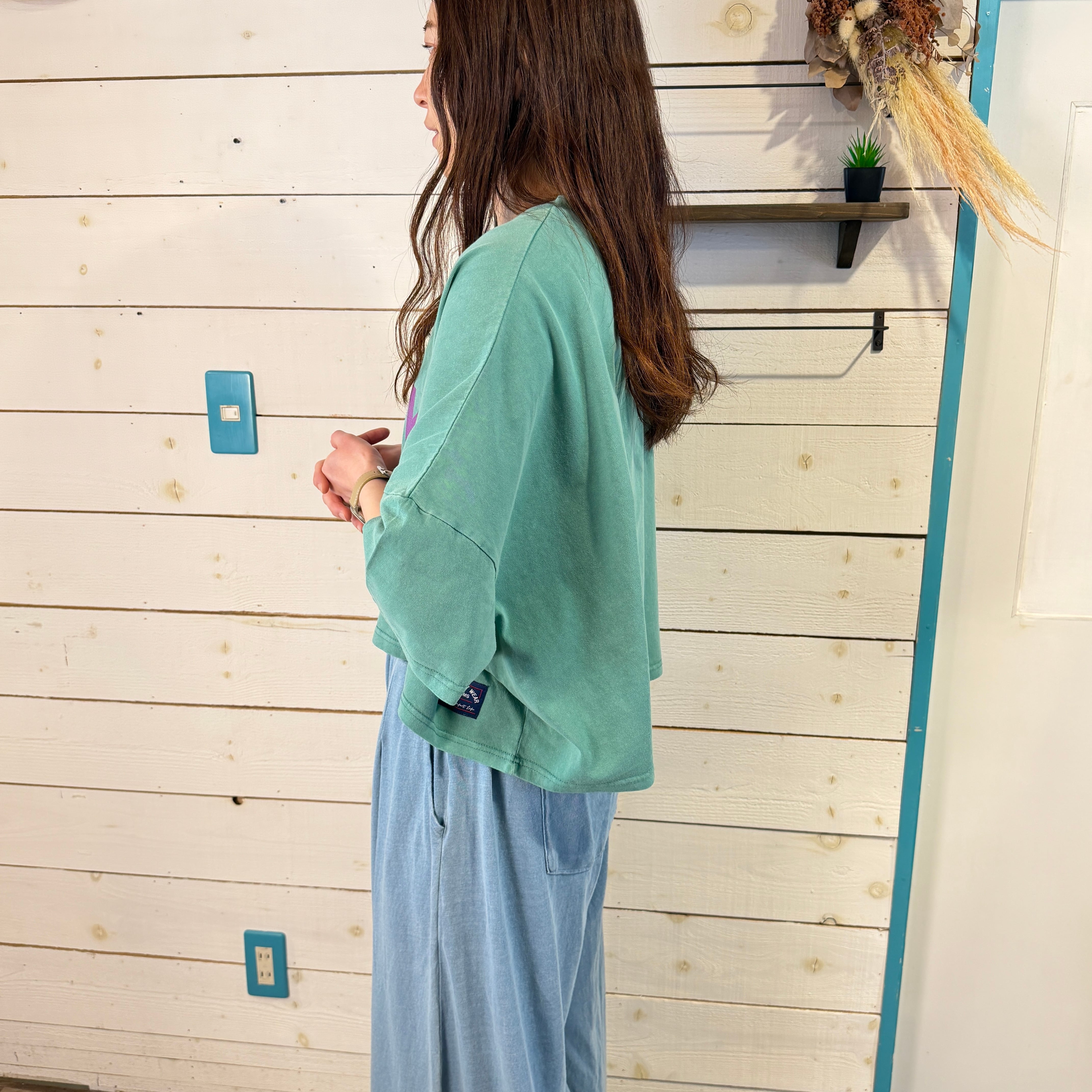 天竺ピグメントボリュームTシャツ 短丈ワイドTは、トレンド感満載の一着です!袖は少し長めのデザインで、ゆったりしたワイドシルエットが特徴。短丈なので、ハイウエストのボトムスとも合わせやすく、絶妙なバランスを演出します♪ ピグメント加工による独自の風合いと、ポップなカラー展開で、コーディネートに楽しさをプラス。大きめのロゴデザインも魅力的で、存在感を放ちます。このTシャツは、デイリー使いやお出かけに最適なアイテムとして、ぜひ手に取ってみてください!