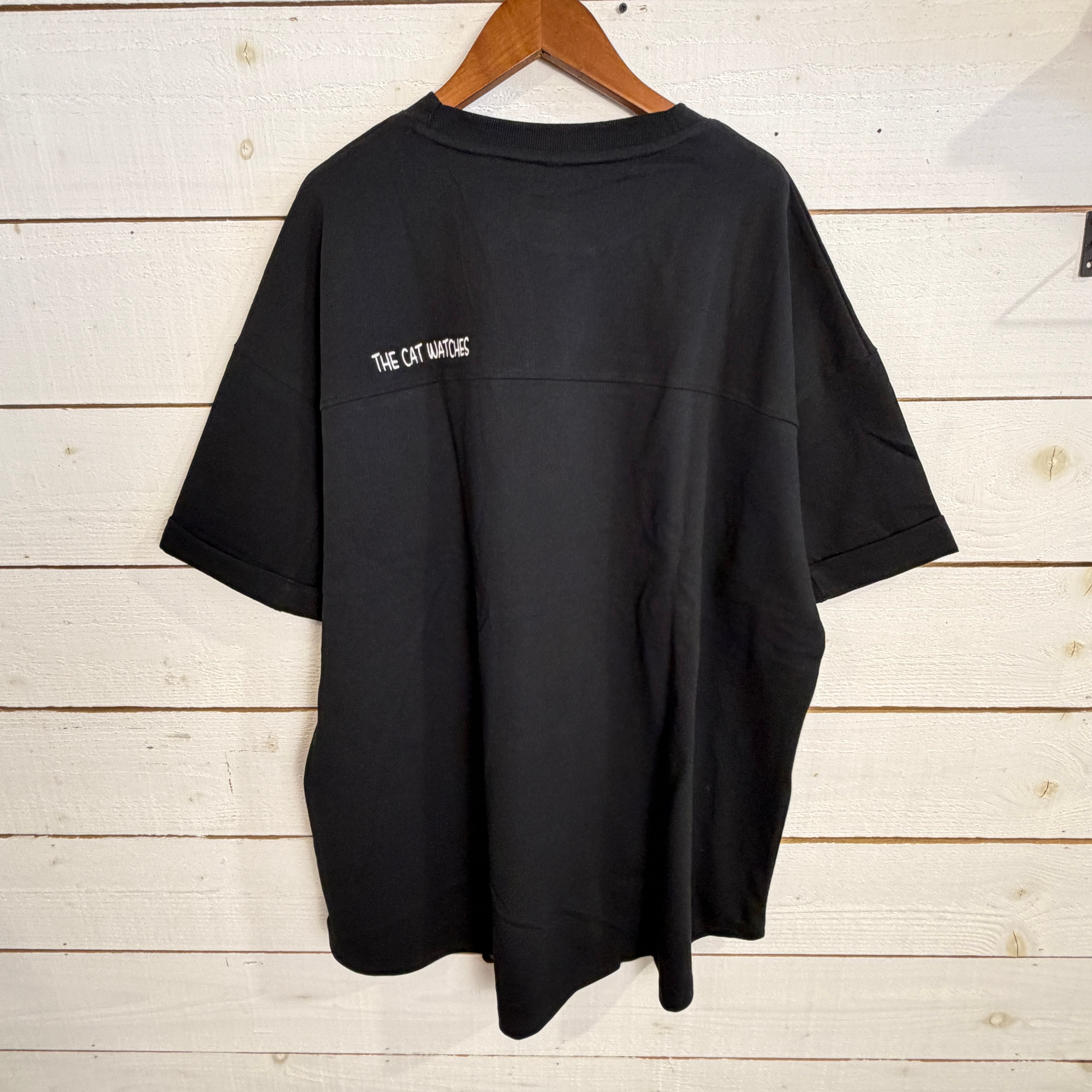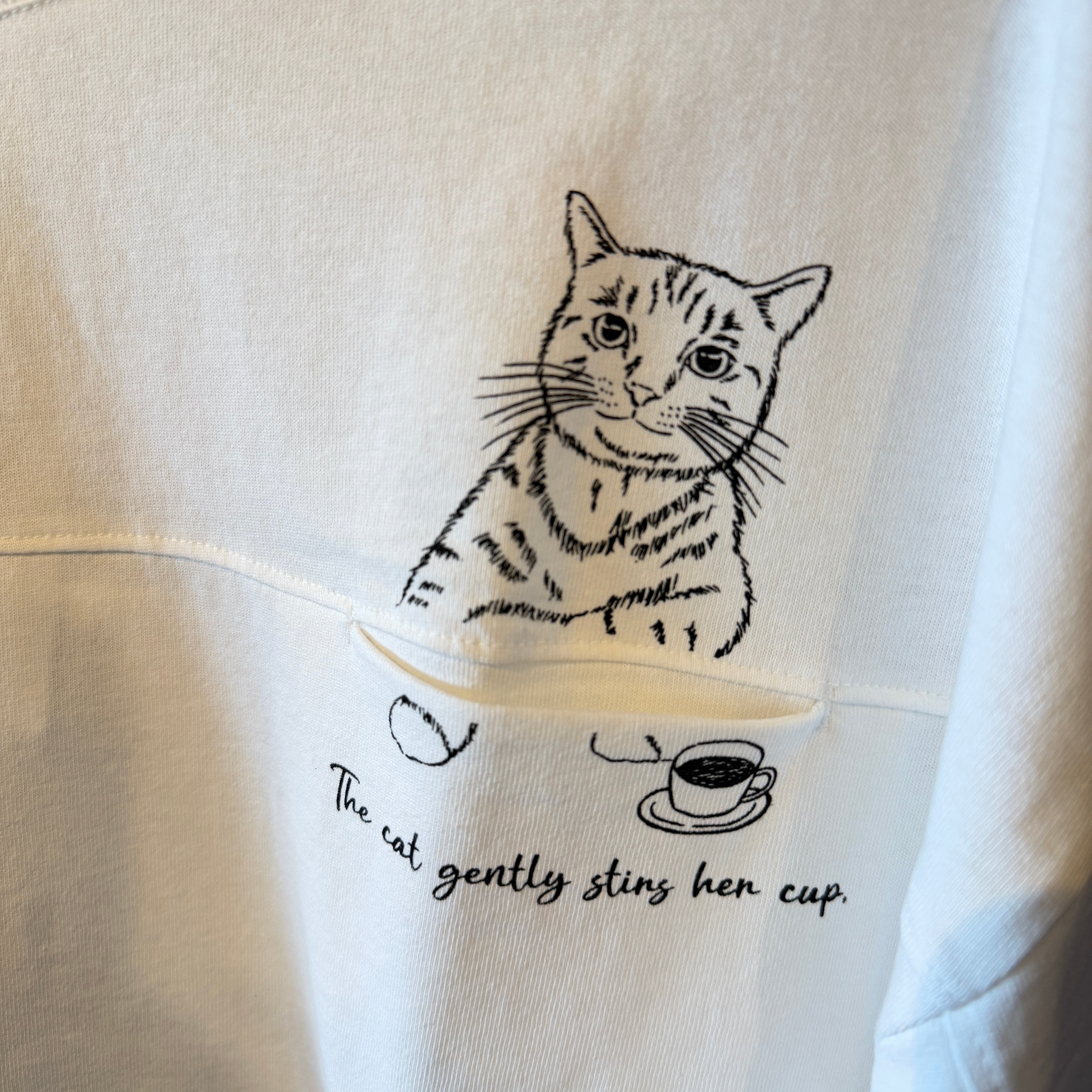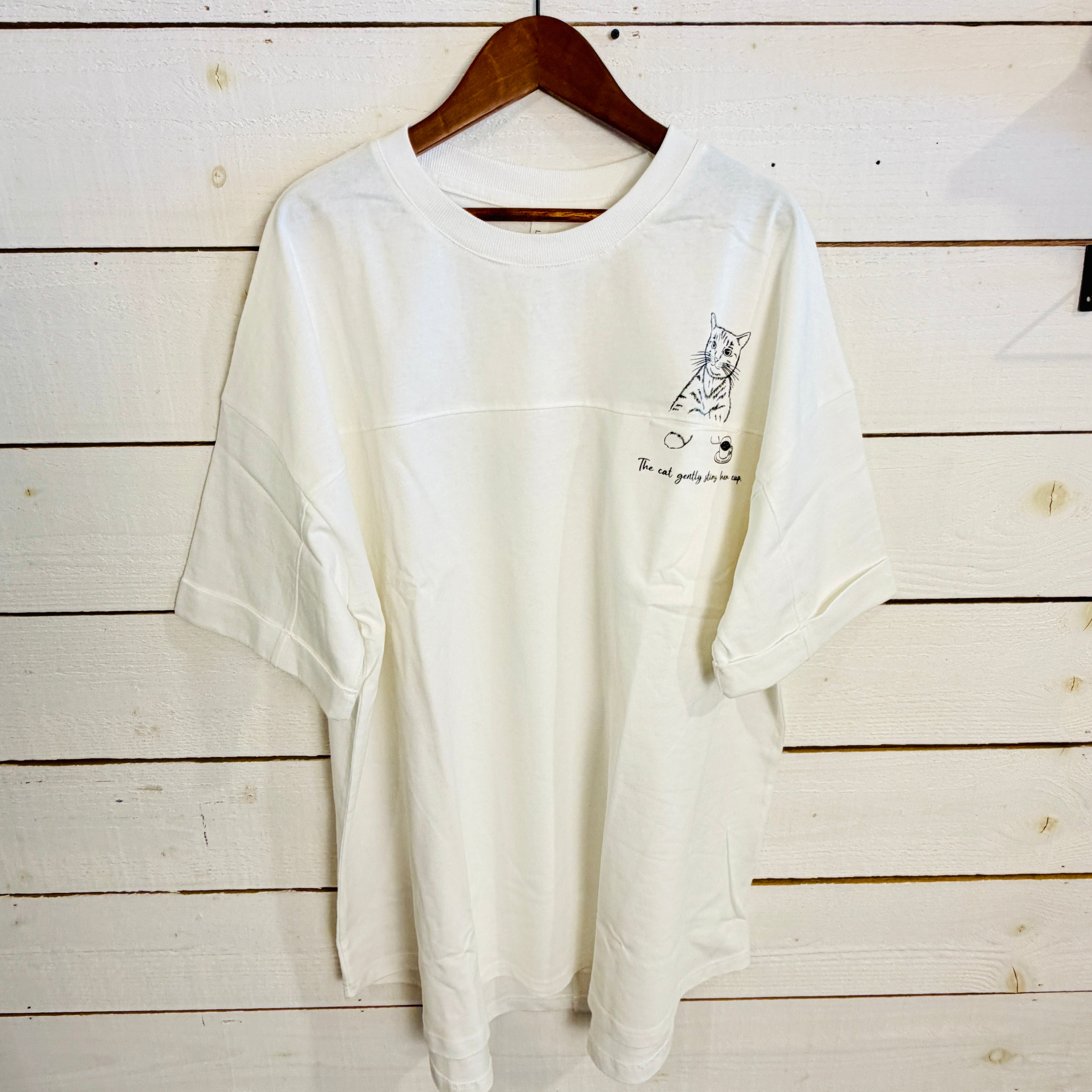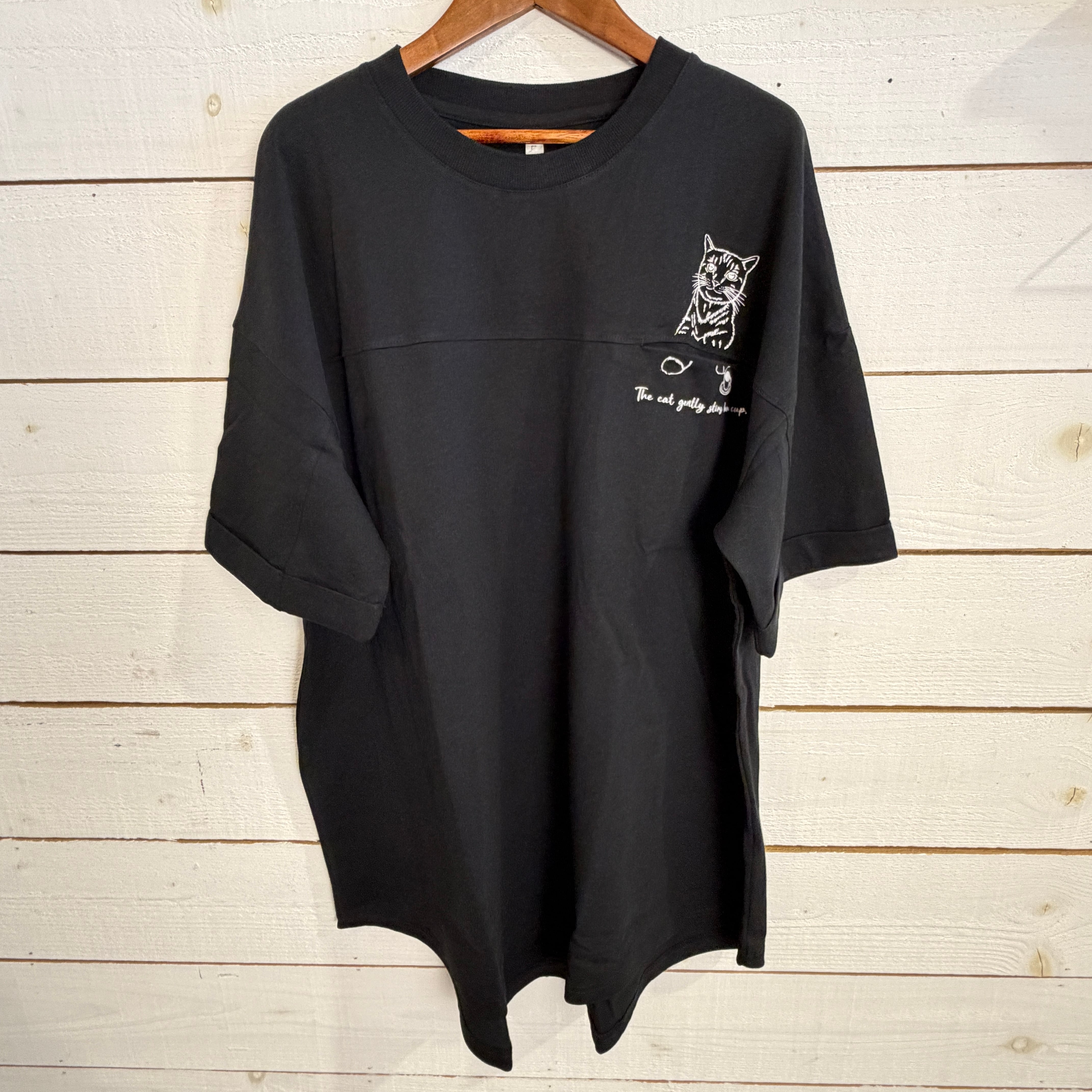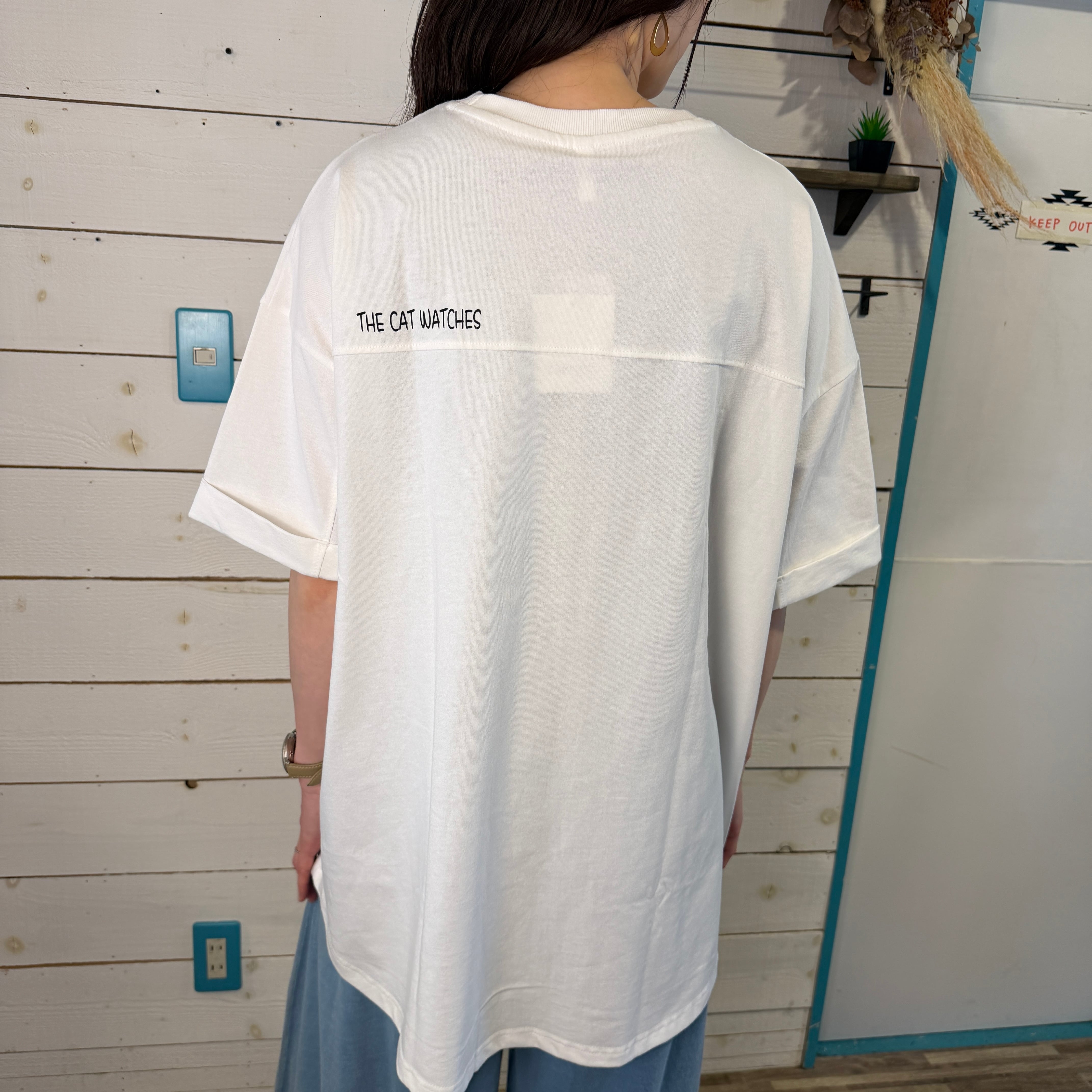 天竺切替ポケットネコTシャツは、ユニークで遊び心あふれるデザインが特徴の一着です!胸元のポケットからネコが出ているような可愛らしいプリントが、見る人に思わず笑顔をもたらします♪ オーバーサイズのシルエットと長めの袖丈が、リラックスした着心地を提供。胸元での切替デザインがさりげないアクセントになり、バックにもシンプルなプリントでカジュアルながらもスタイリッシュな印象を与えます。このTシャツは、デイリー使いやお出かけスタイルにもぴったりなアイテムとして、ぜひお試しください!