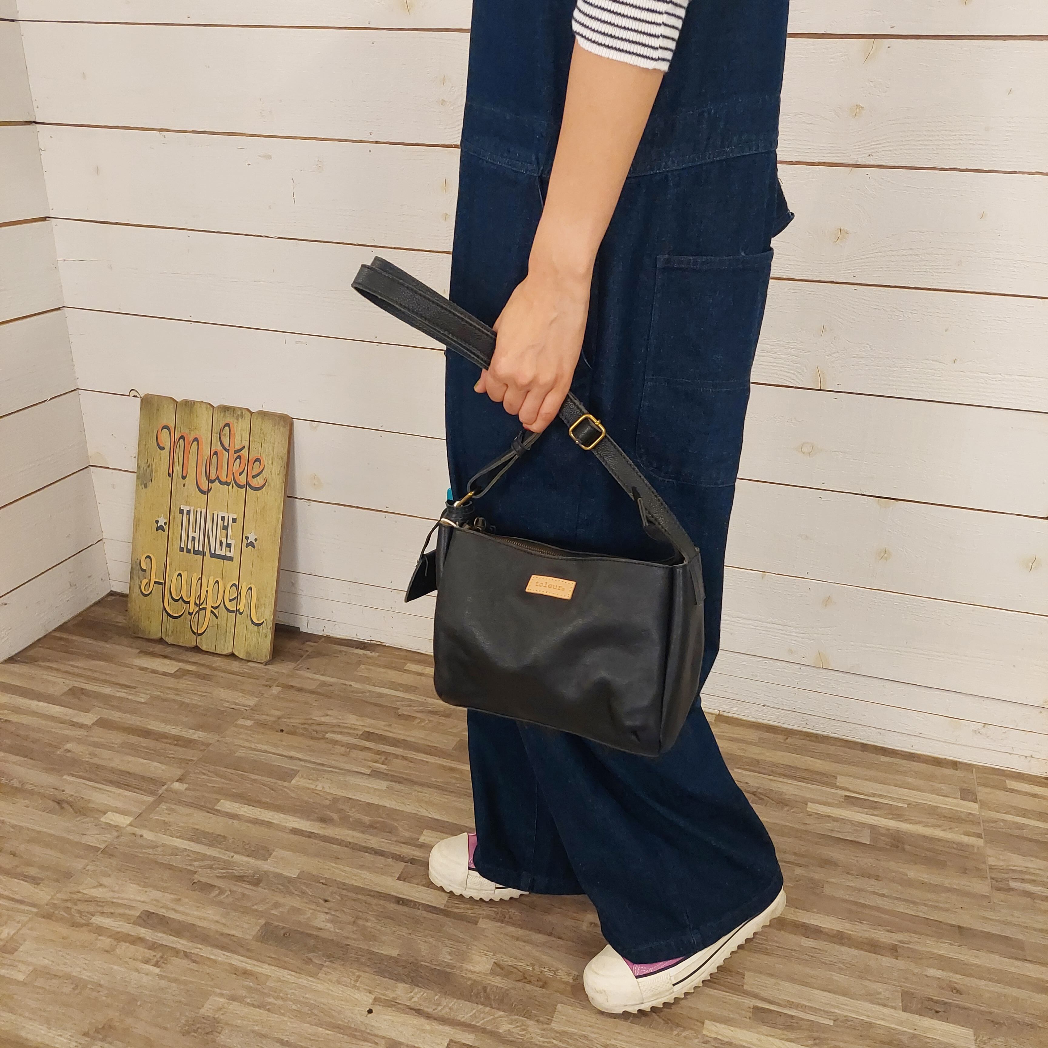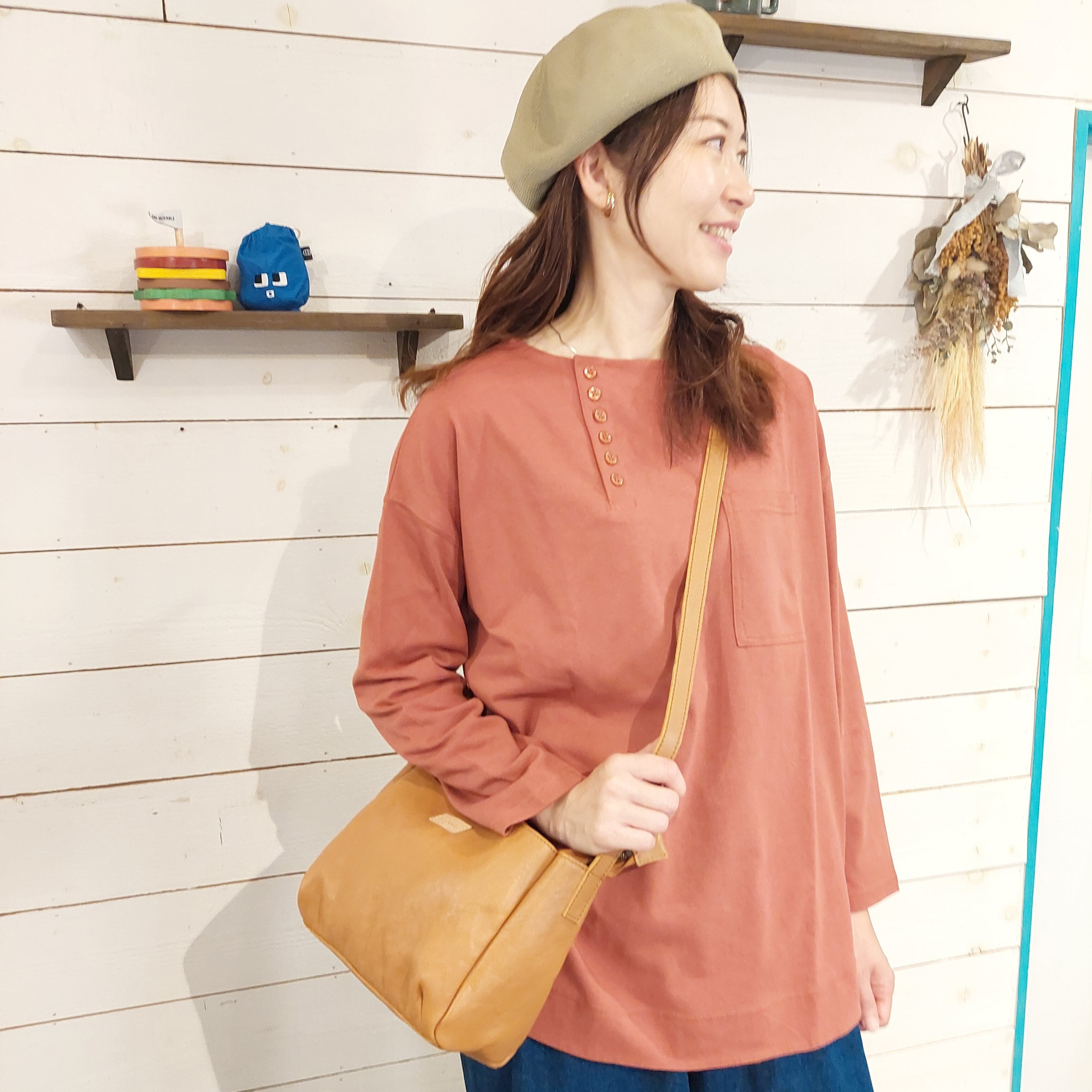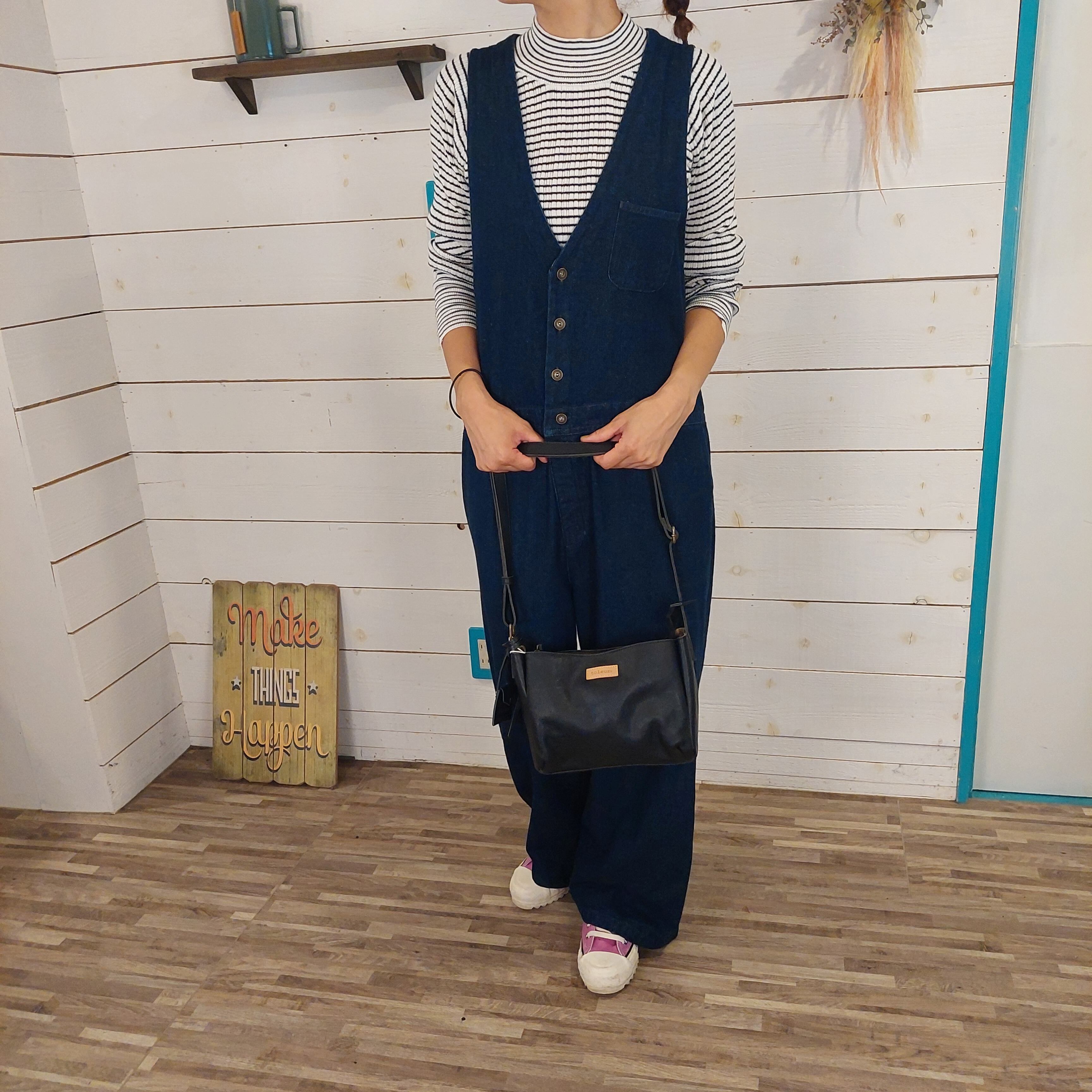 フロントにオープンポケットをプラスした台形ショルダーは、長さ調節可能なストラップで肩掛けもたすき掛けもOK。